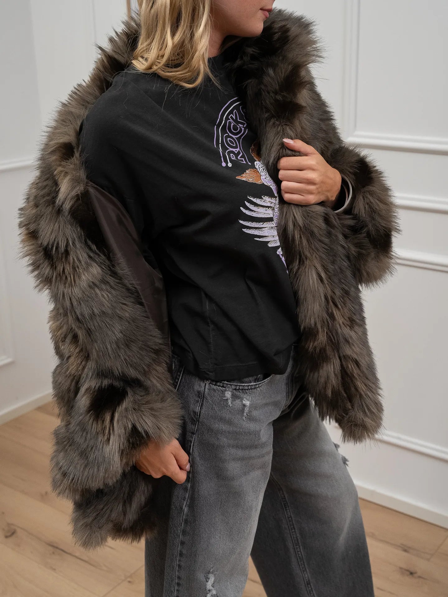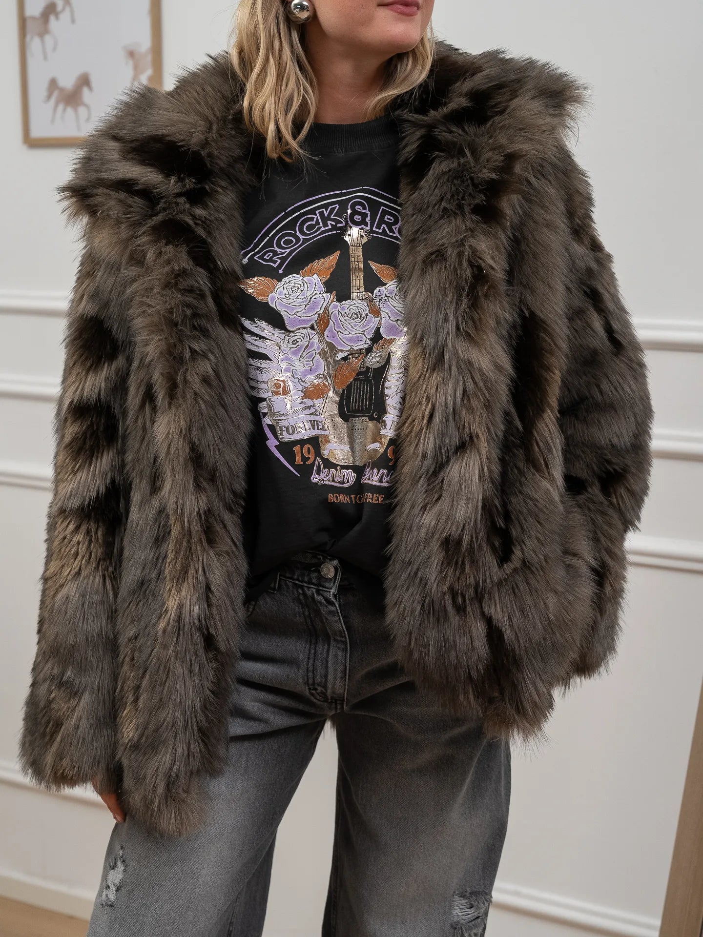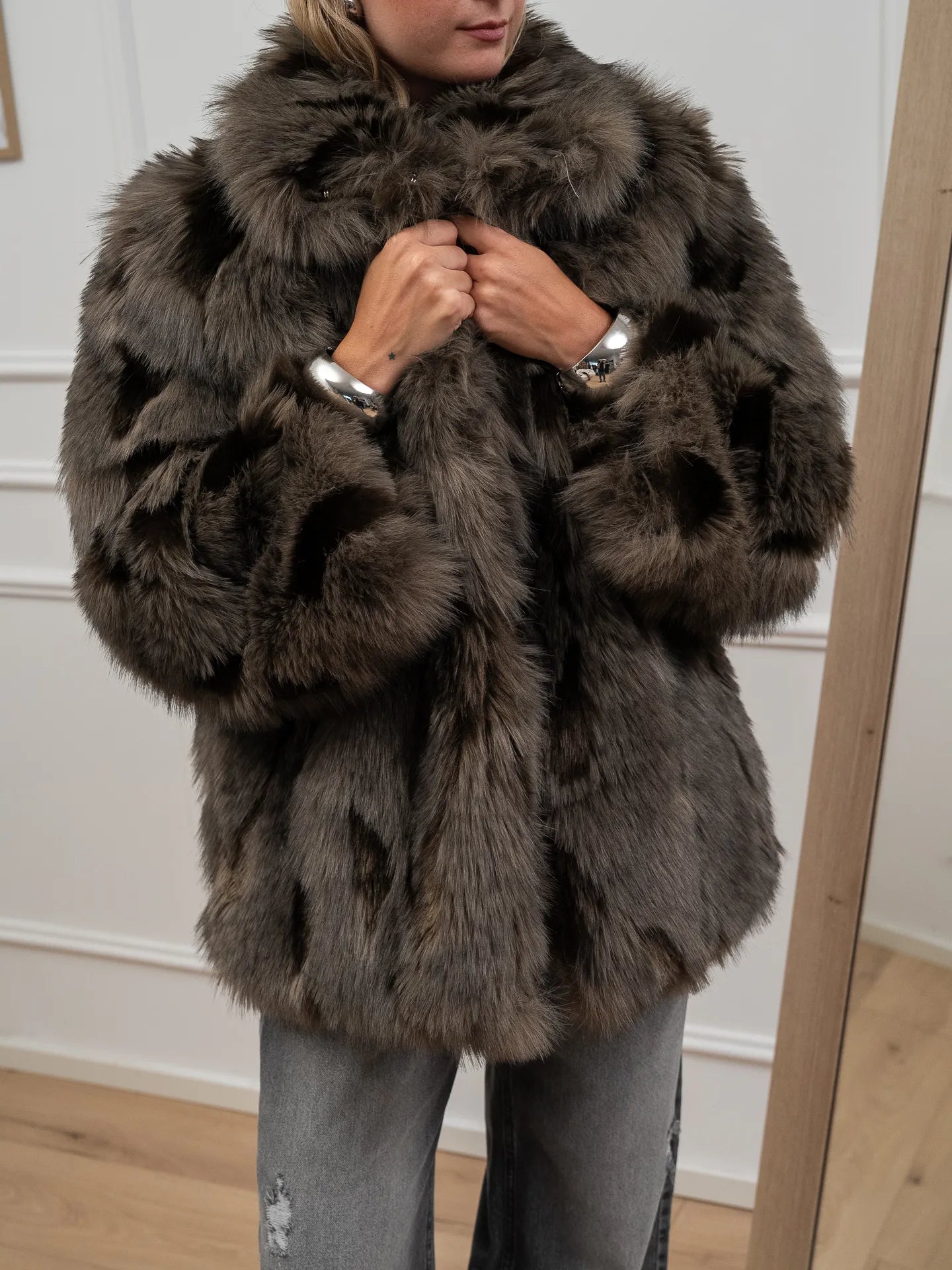 Pelliccia midi color tortora e marrone HaveOne. Modello collo revers lunghezza midi con maniche lunghe. Chiusura frontale con doppio gancio, tasche laterali.