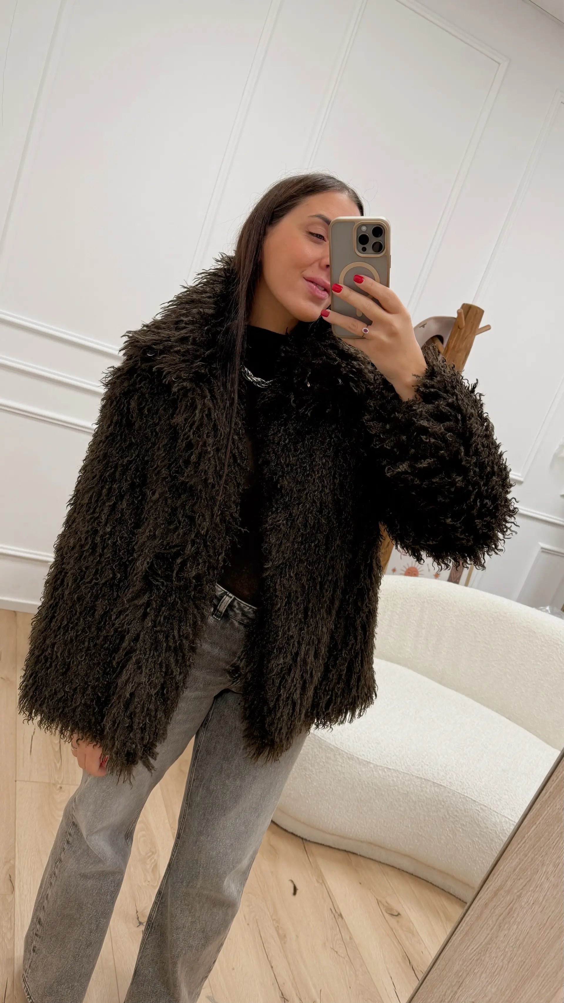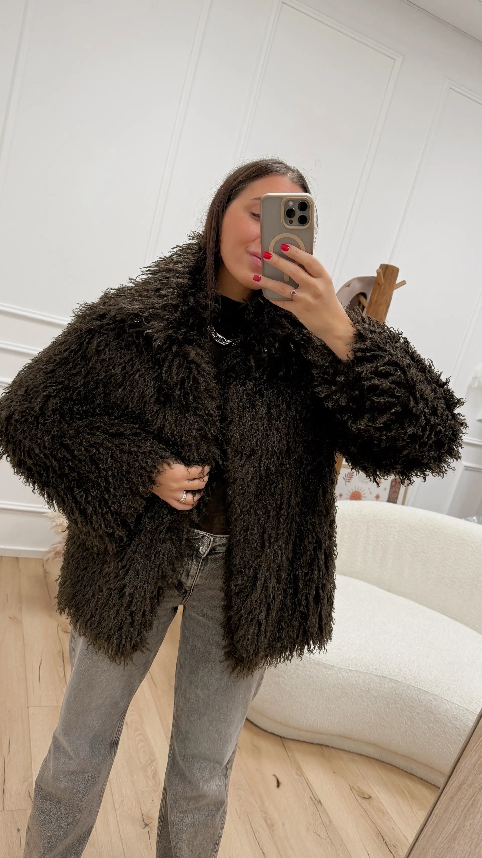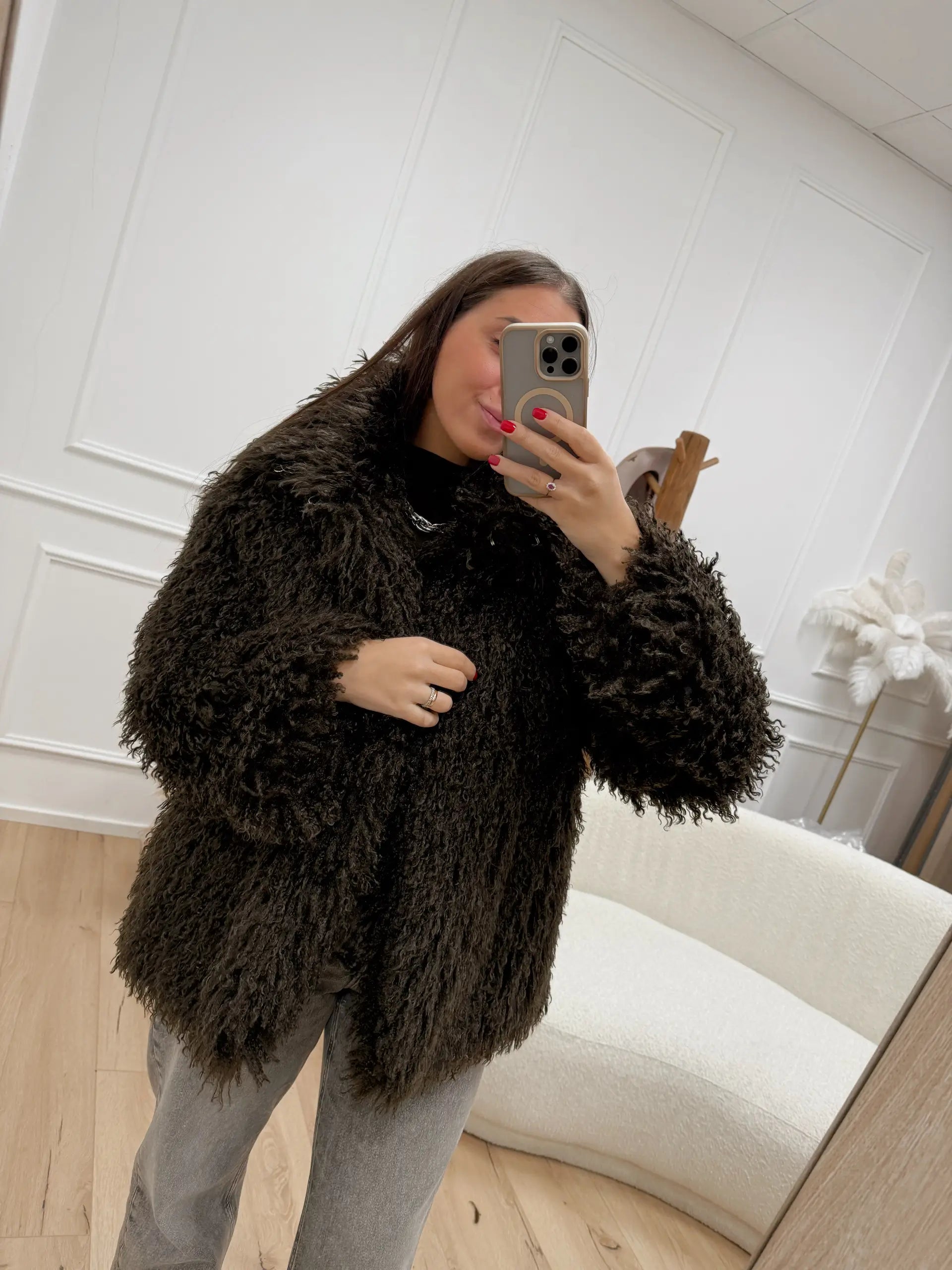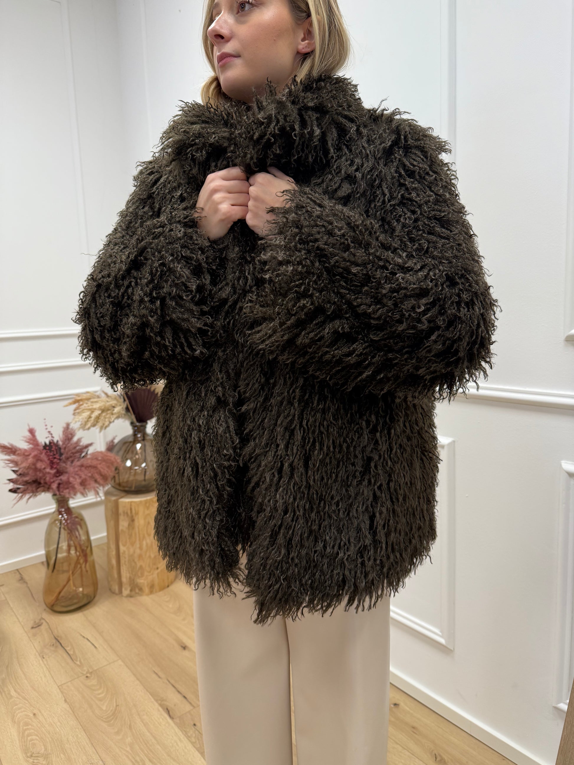 Pelliccia mongolia color marrone fondente HaveOne. Modello con collo revers e chiusura con ganci. Maniche lunghe e fit morbido.