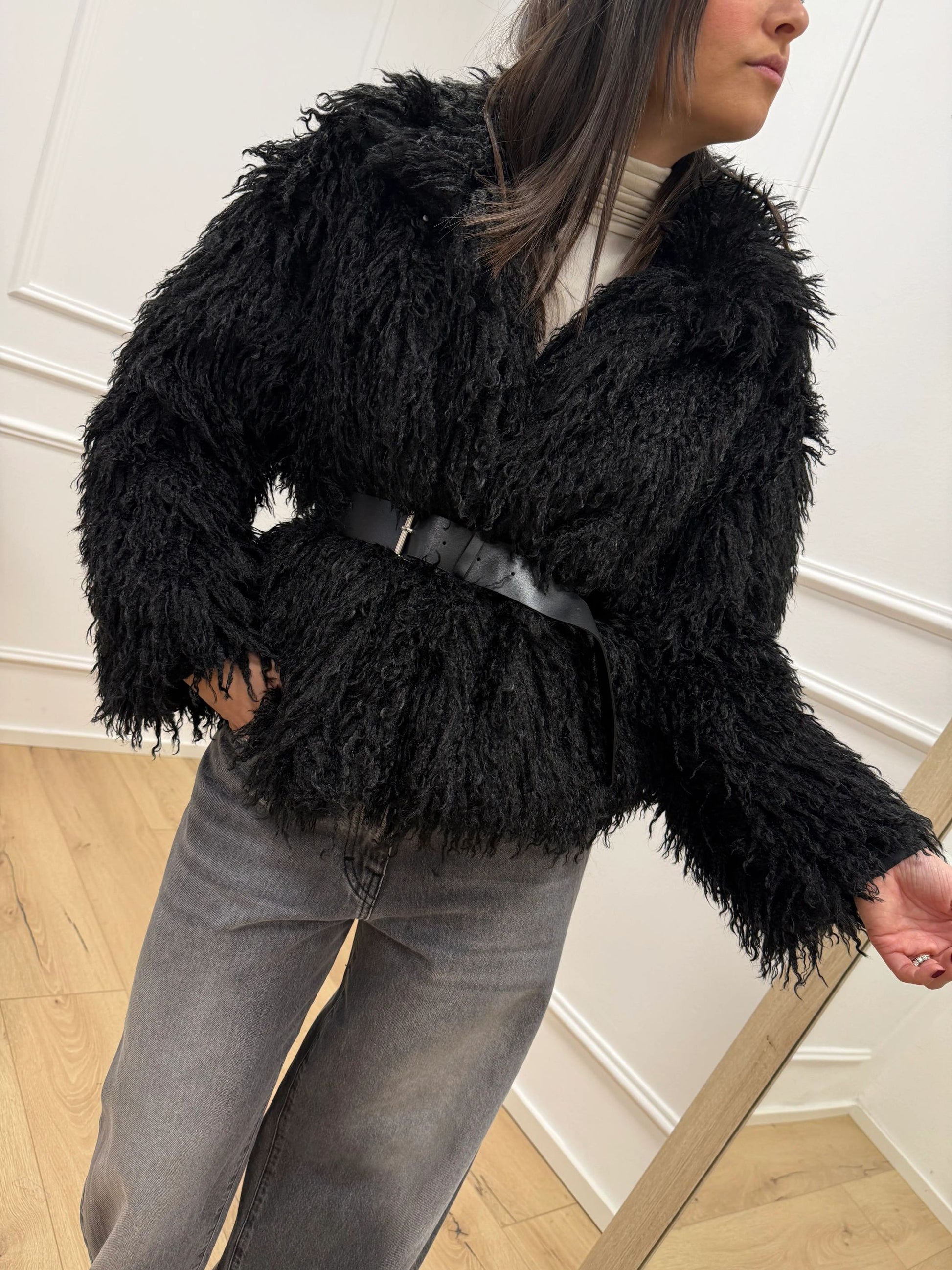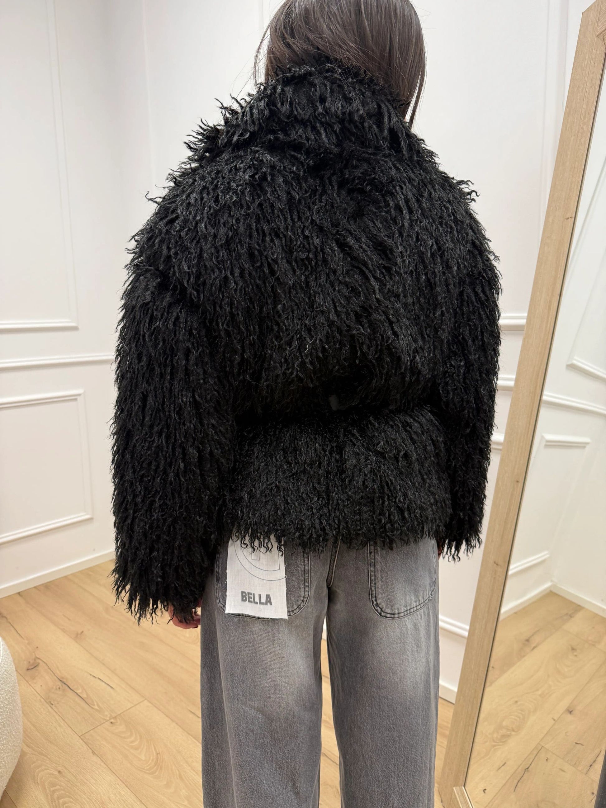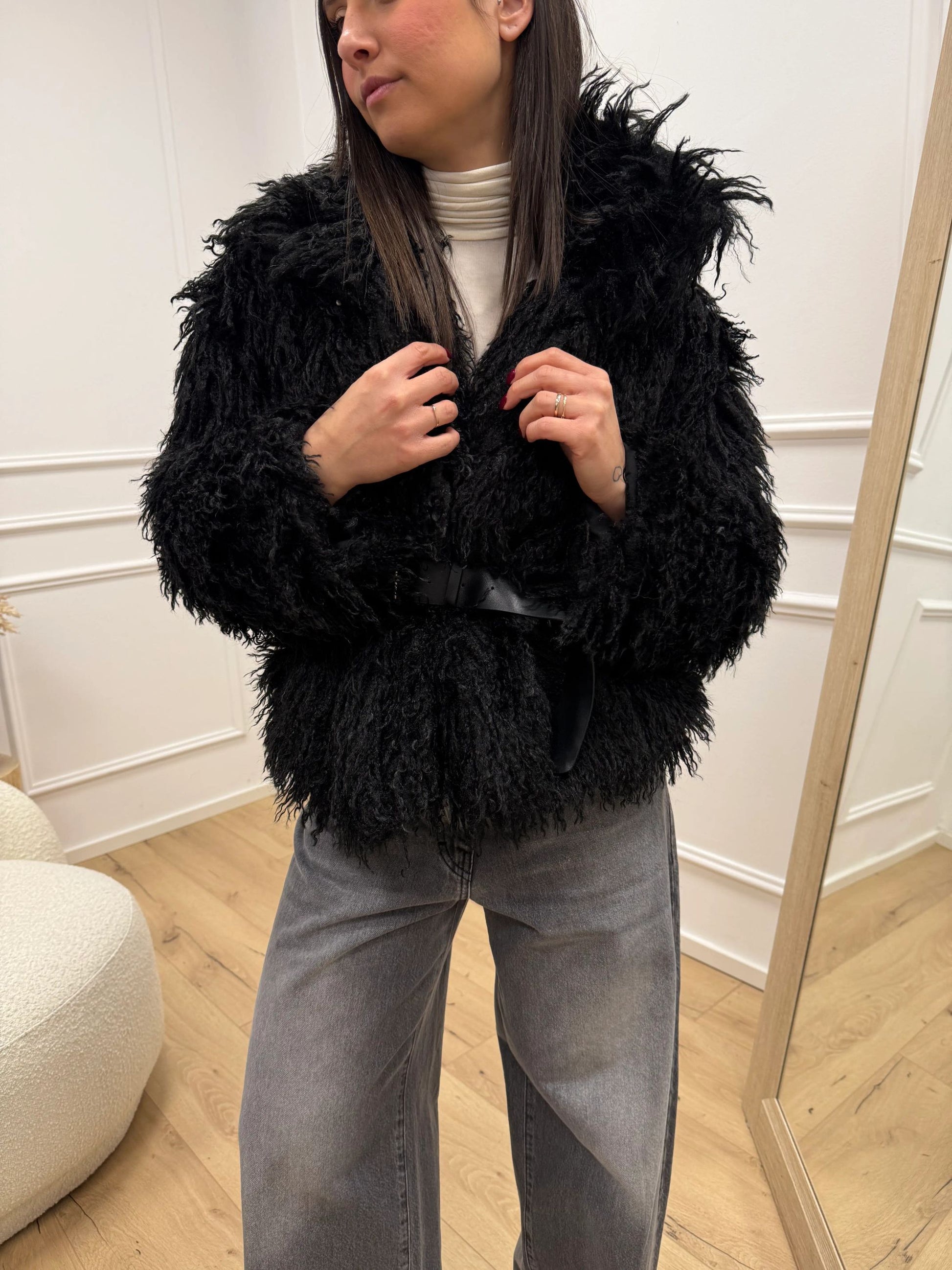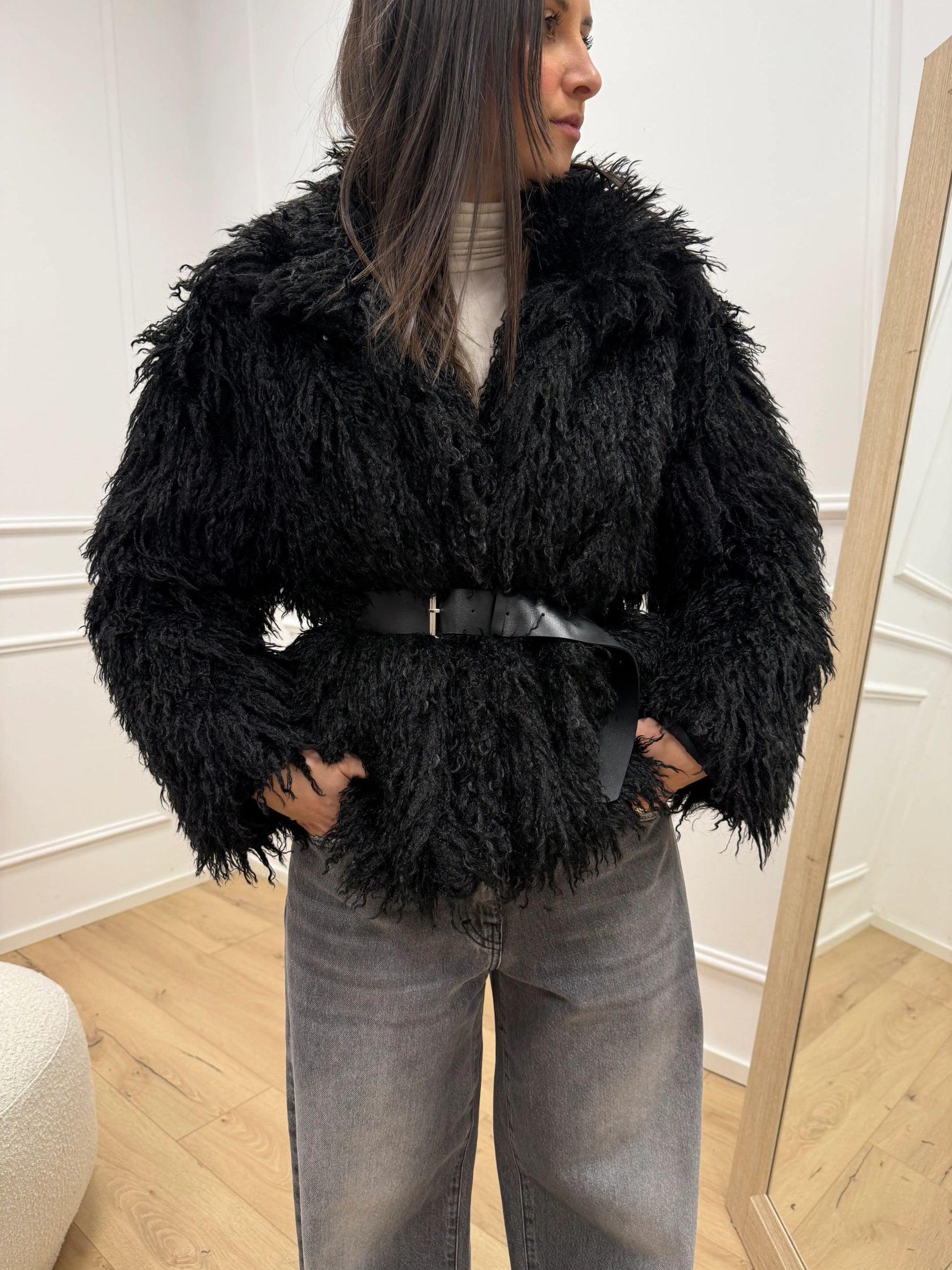 Pelliccia mongolia color nero HaveOne. Modello con collo revers senza chiusura, maniche lunghe e fit morbido. Dettaglio di cinta regolabile in vita.