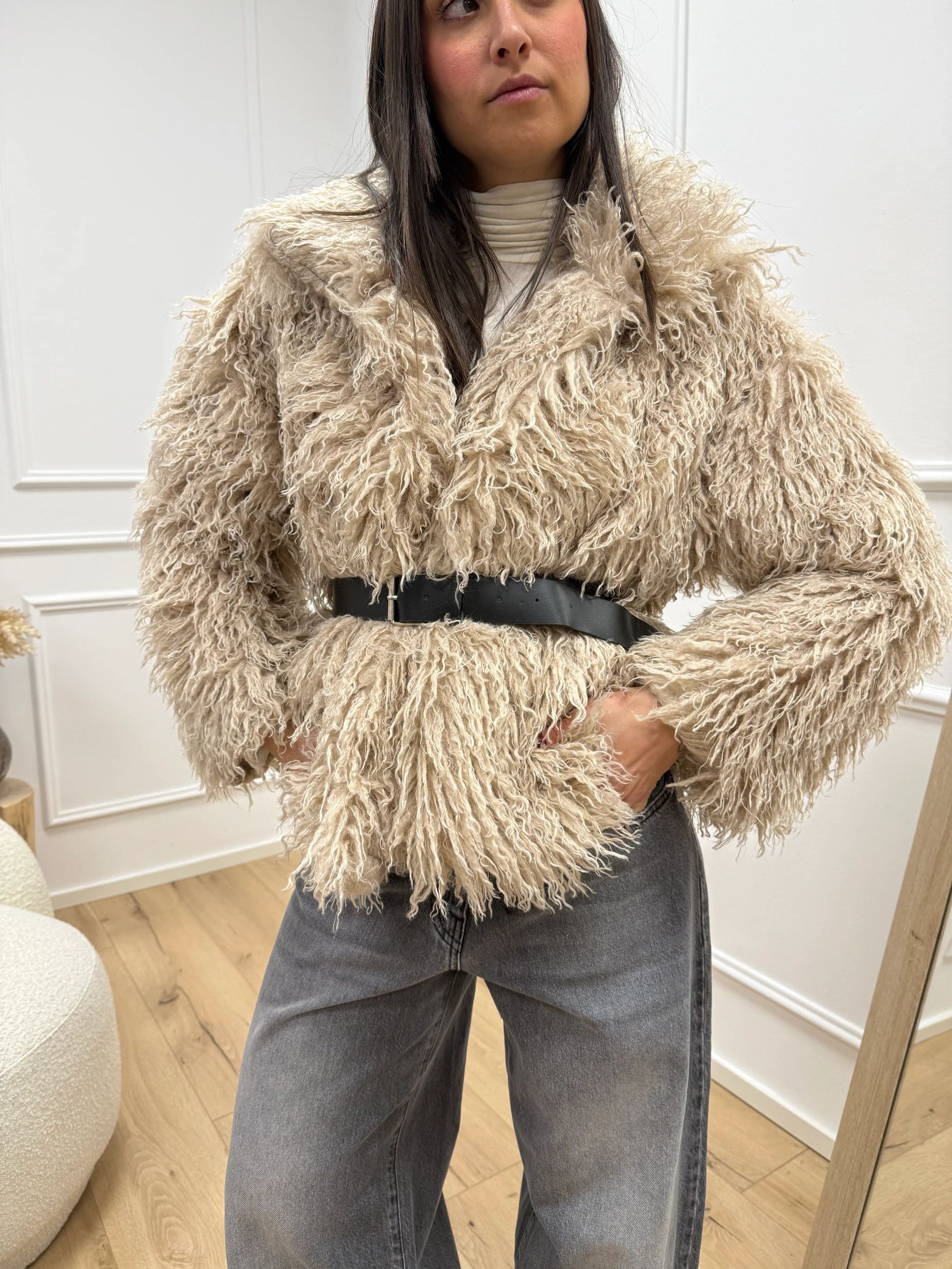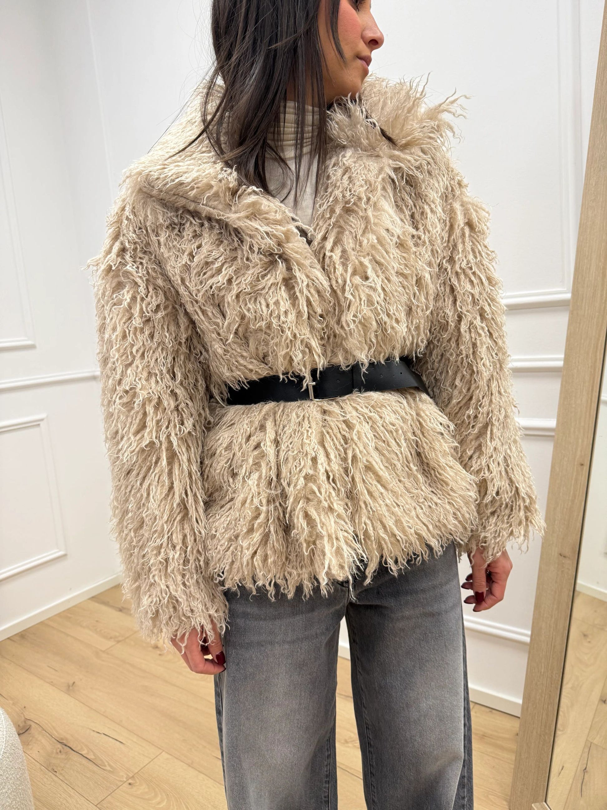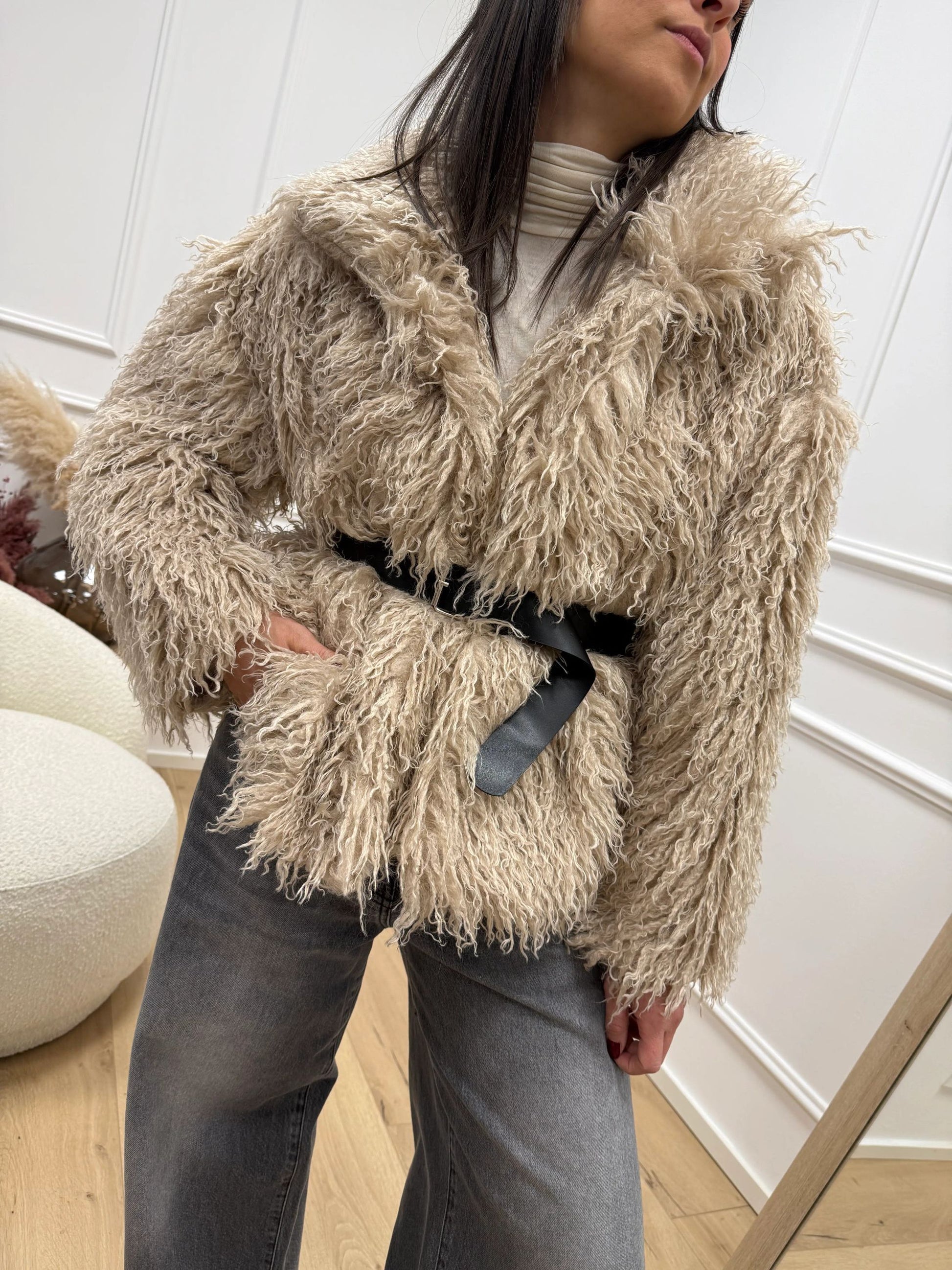 Pelliccia mongolia color panna HaveOne. Modello con collo revers senza chiusura, maniche lunghe e fit morbido. Dettaglio di cinta regolabile in vita.