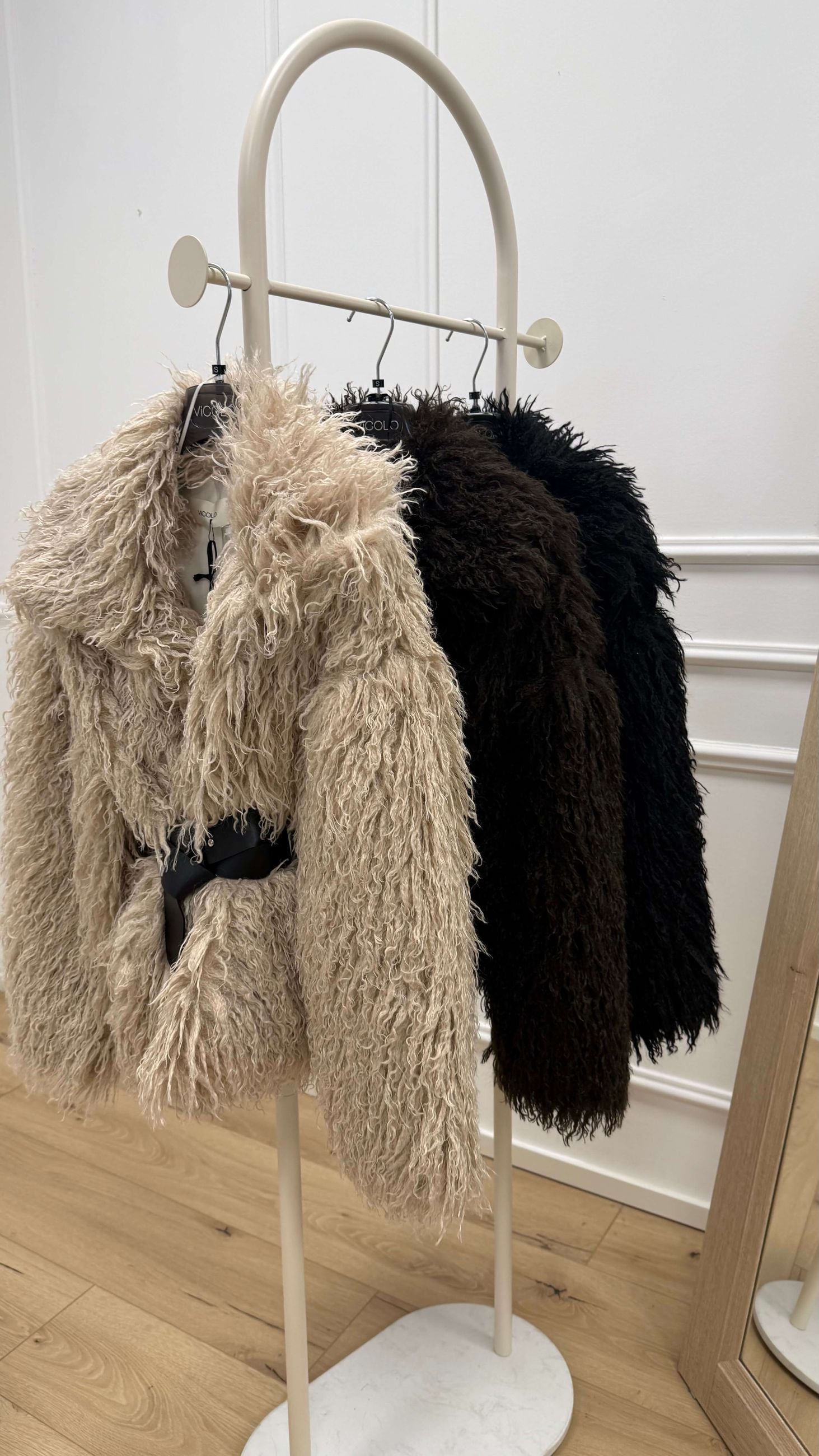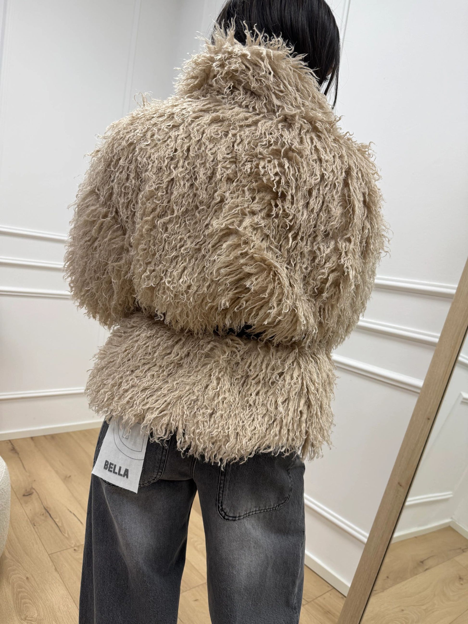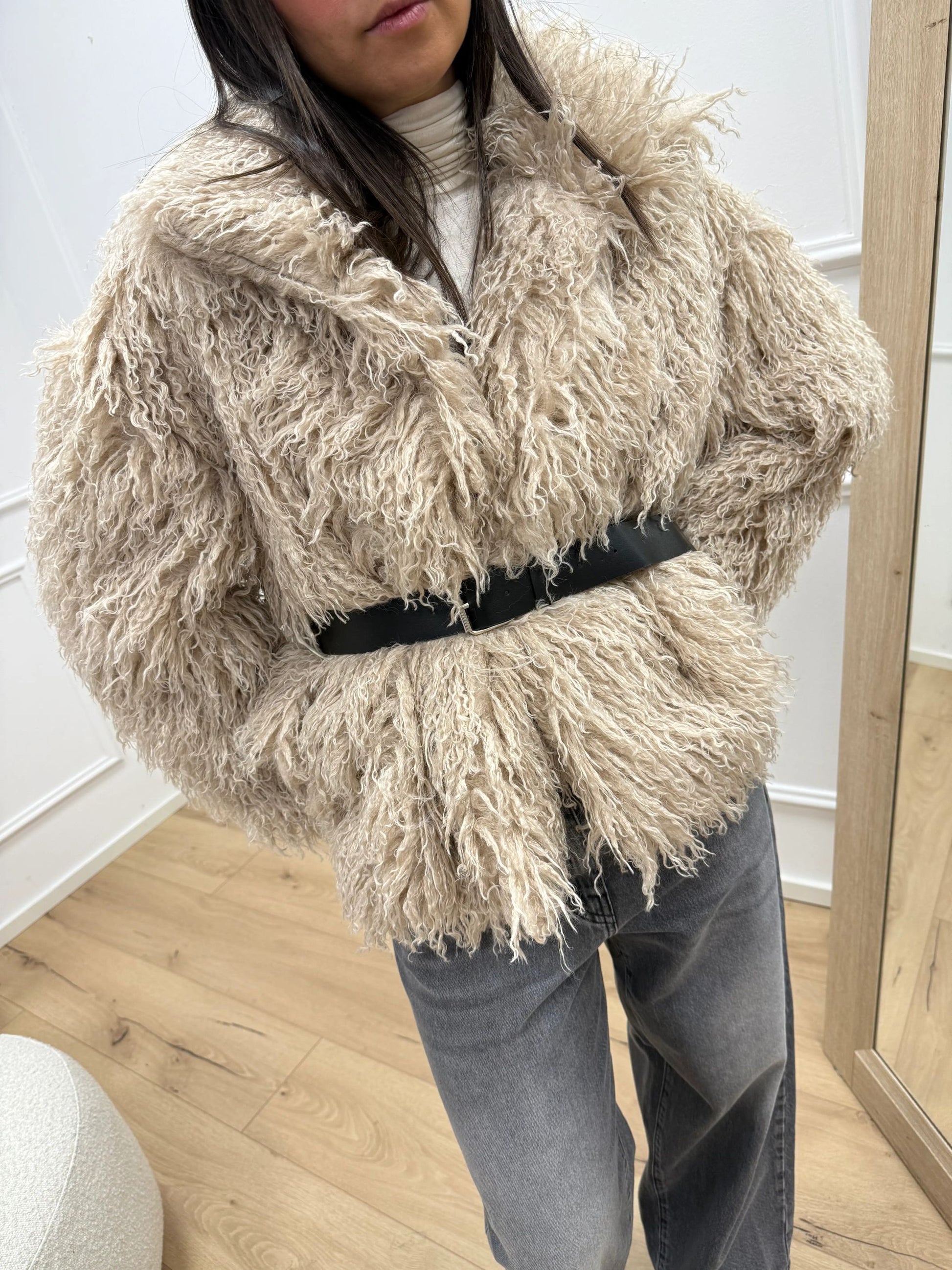 Pelliccia mongolia color panna HaveOne. Modello con collo revers senza chiusura, maniche lunghe e fit morbido. Dettaglio di cinta regolabile in vita.