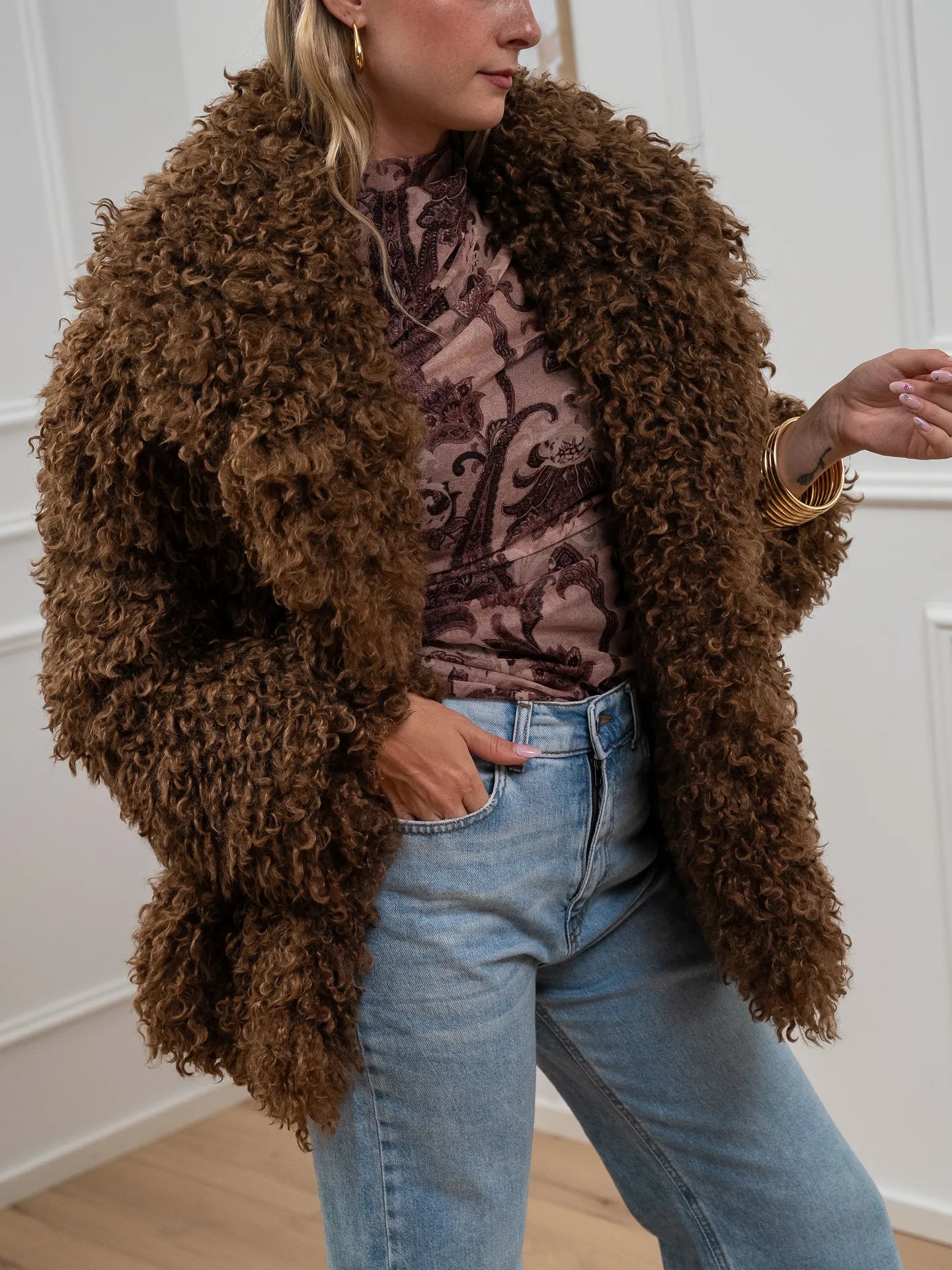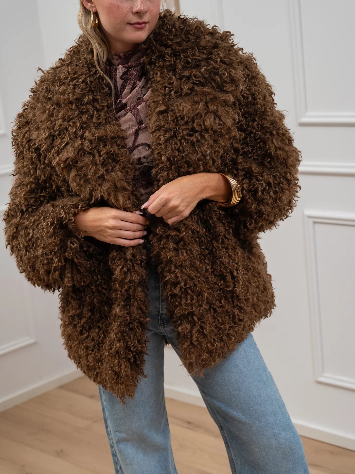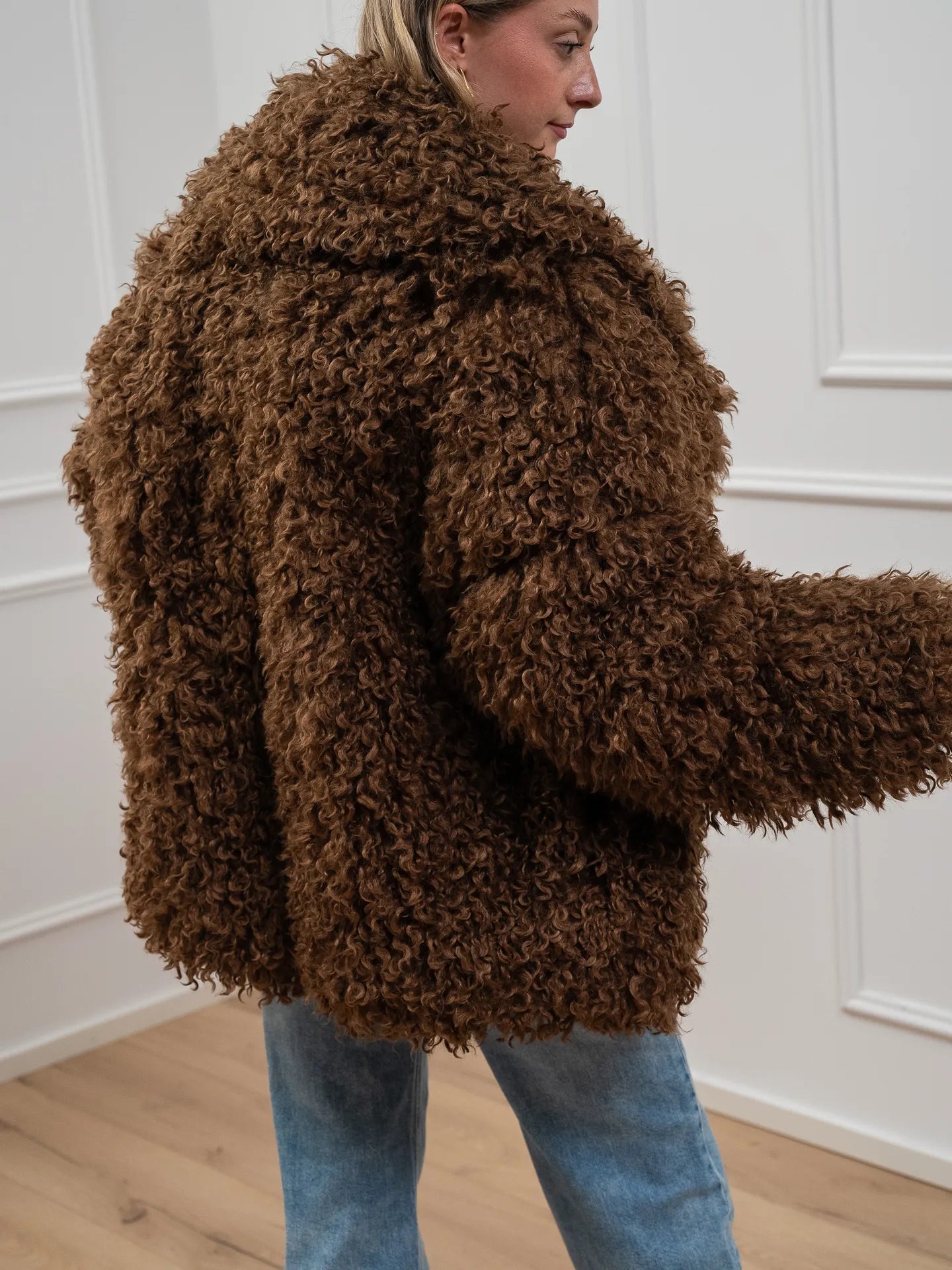Pelliccia Poison in faux fur effetto fluffy color caramello Aniye By. Modello taglio boyfriend con revers pronunciato, chiusura monopetto e interno foderato.
