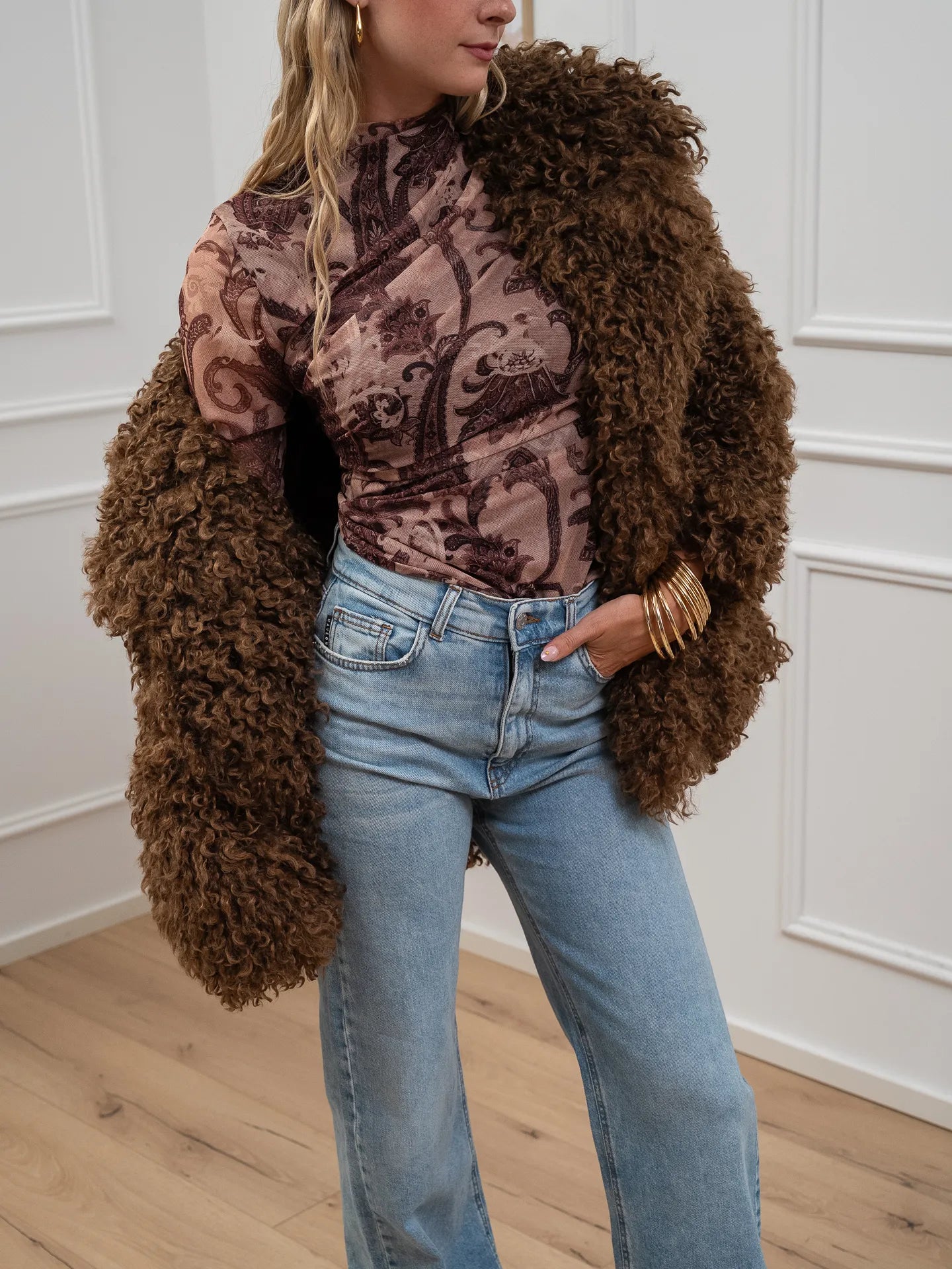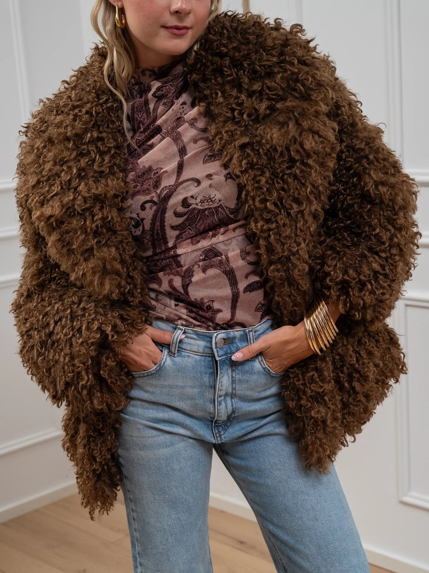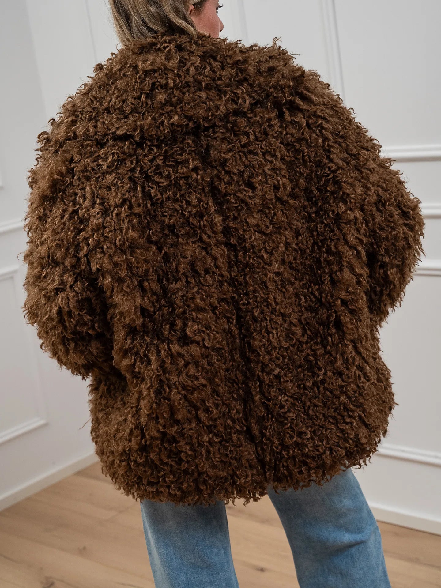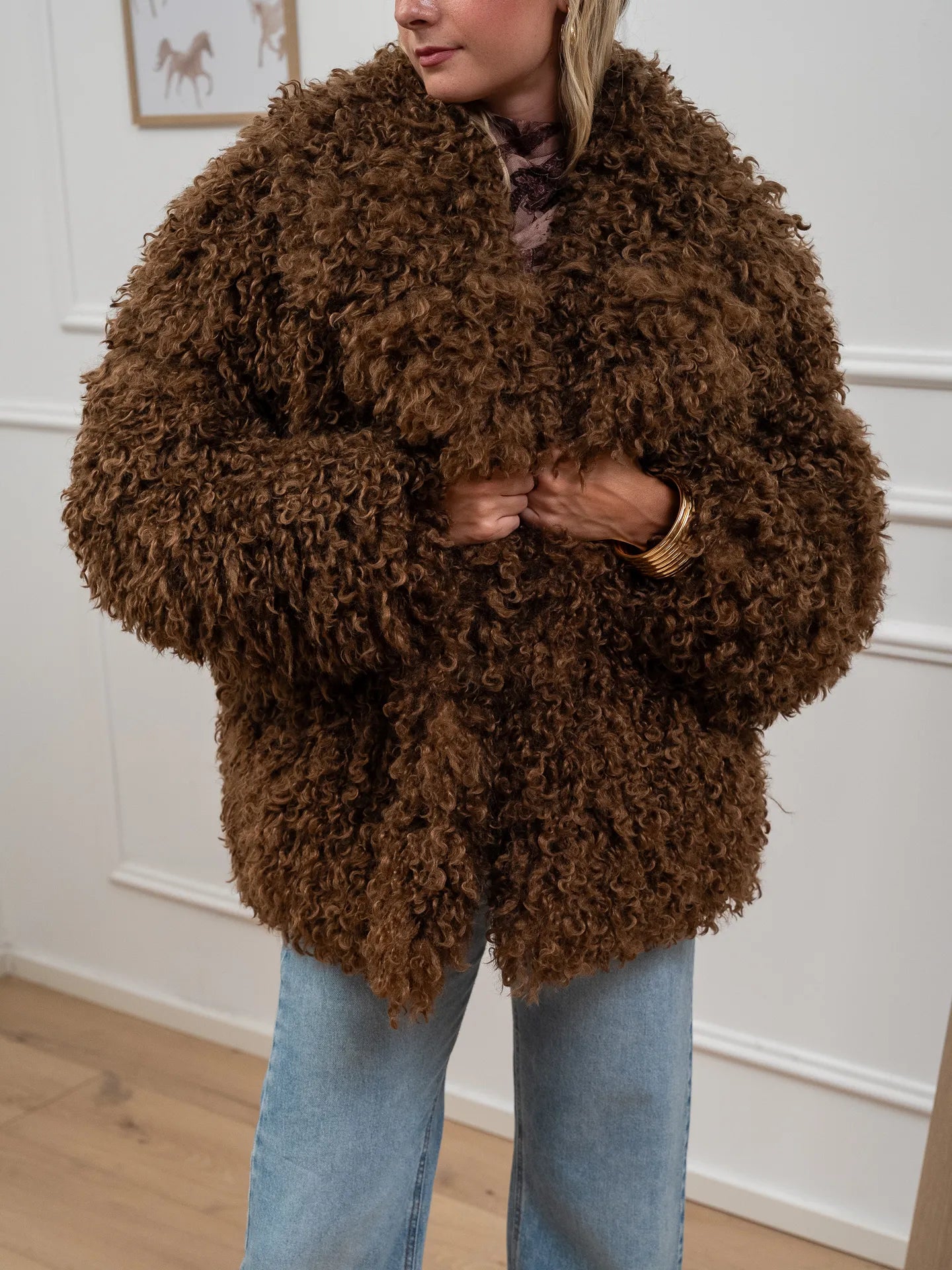 Pelliccia Poison in faux fur effetto fluffy color caramello Aniye By. Modello taglio boyfriend con revers pronunciato, chiusura monopetto e interno foderato.