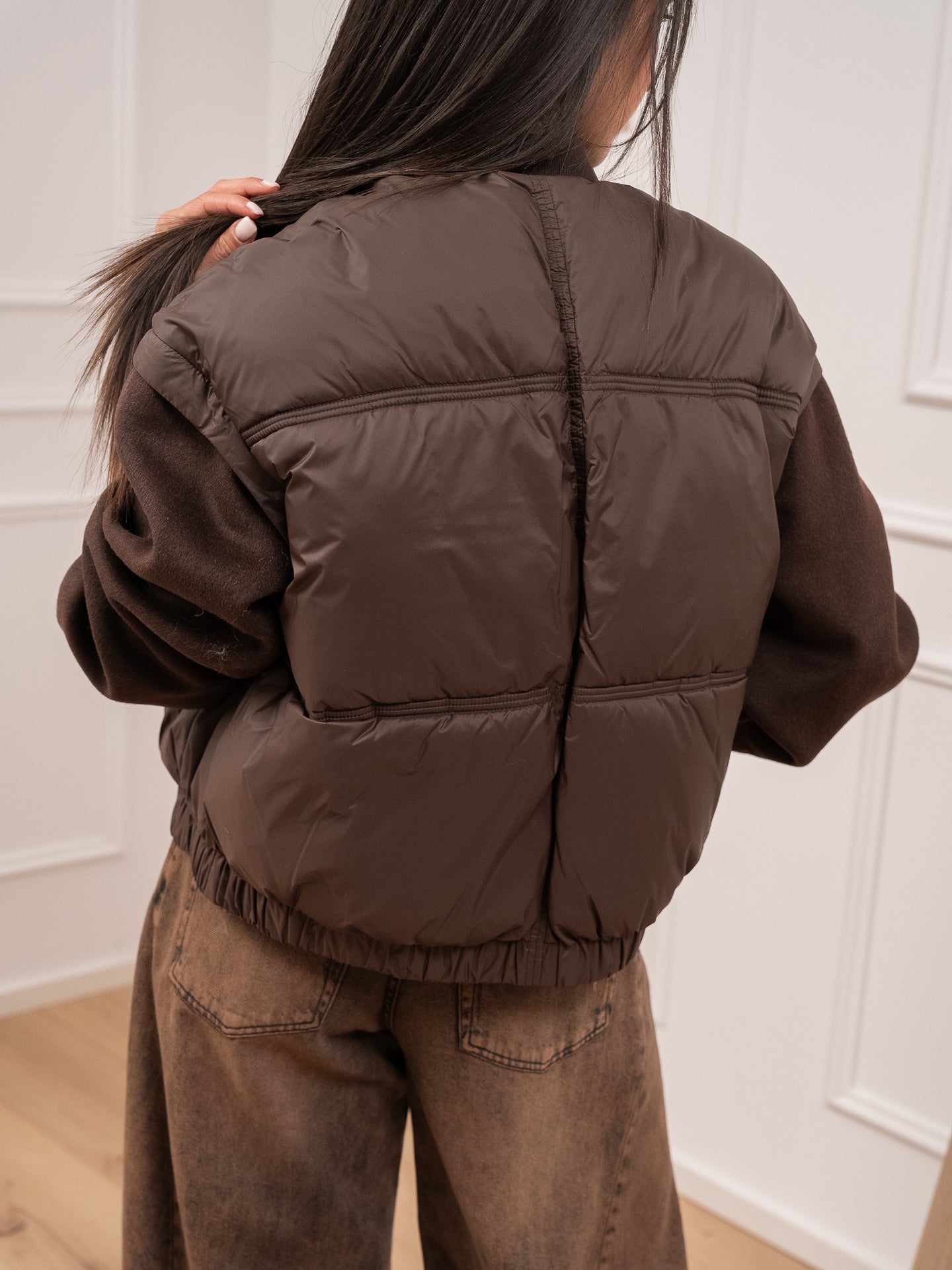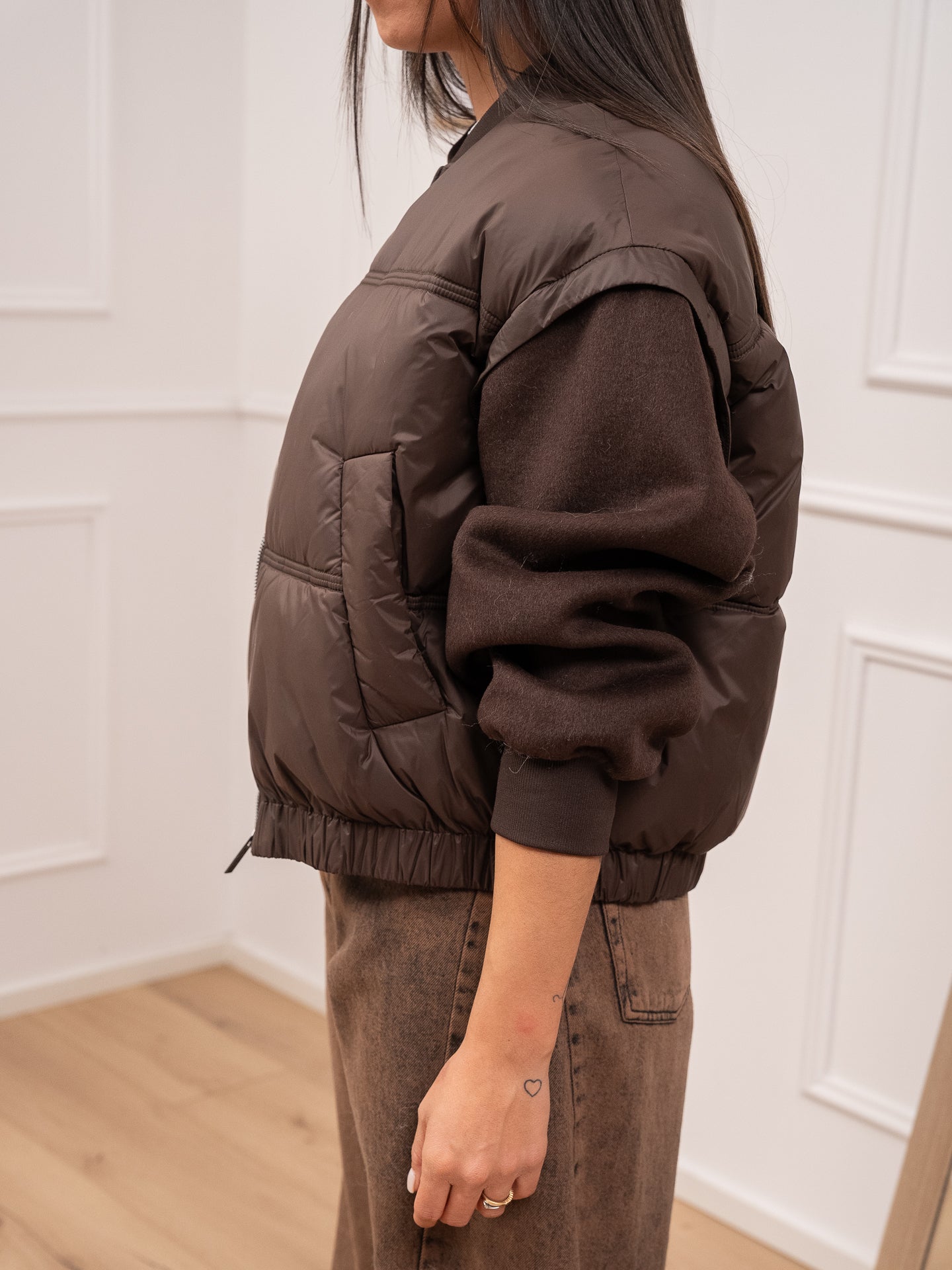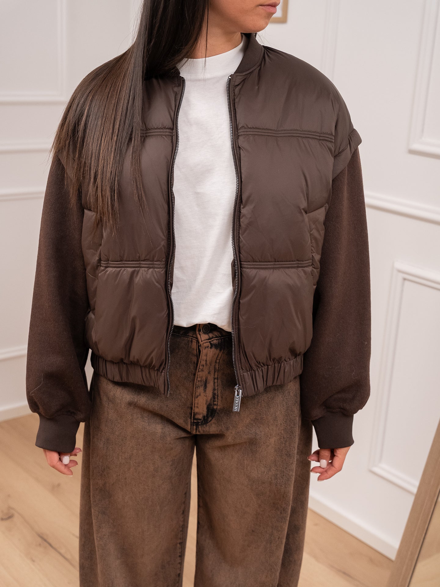 Piumino corto color moro Vicolo. Modello stile bomber con colletto alla coreana. Maniche in panno con polsino stretto. Chiusura frontale con cerniera. Tasche laterali alla francese. Dettaglio elastico sul fondo.