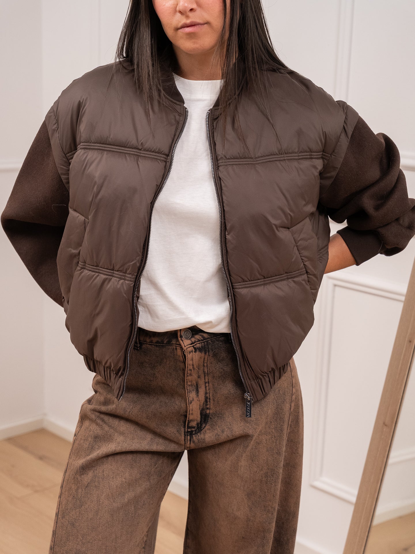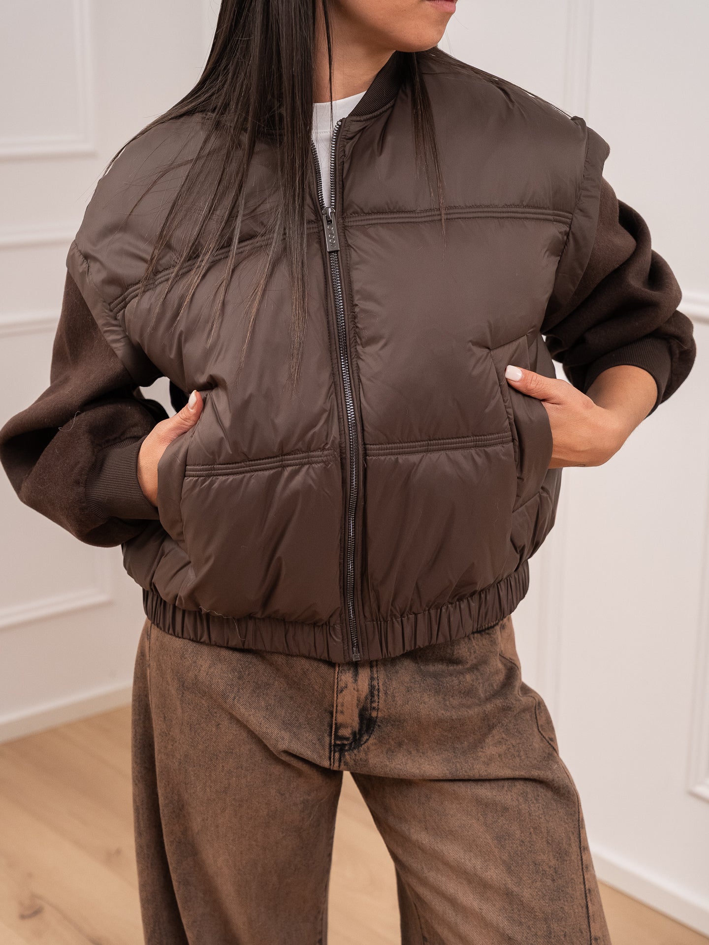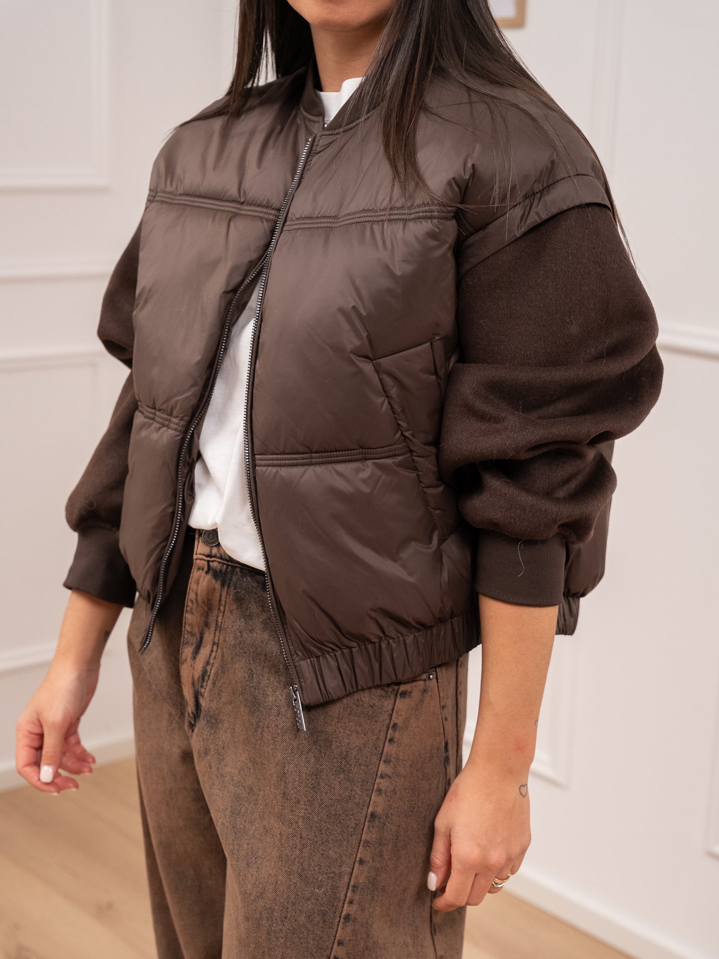 Piumino corto color moro Vicolo. Modello stile bomber con colletto alla coreana. Maniche in panno con polsino stretto. Chiusura frontale con cerniera. Tasche laterali alla francese. Dettaglio elastico sul fondo.