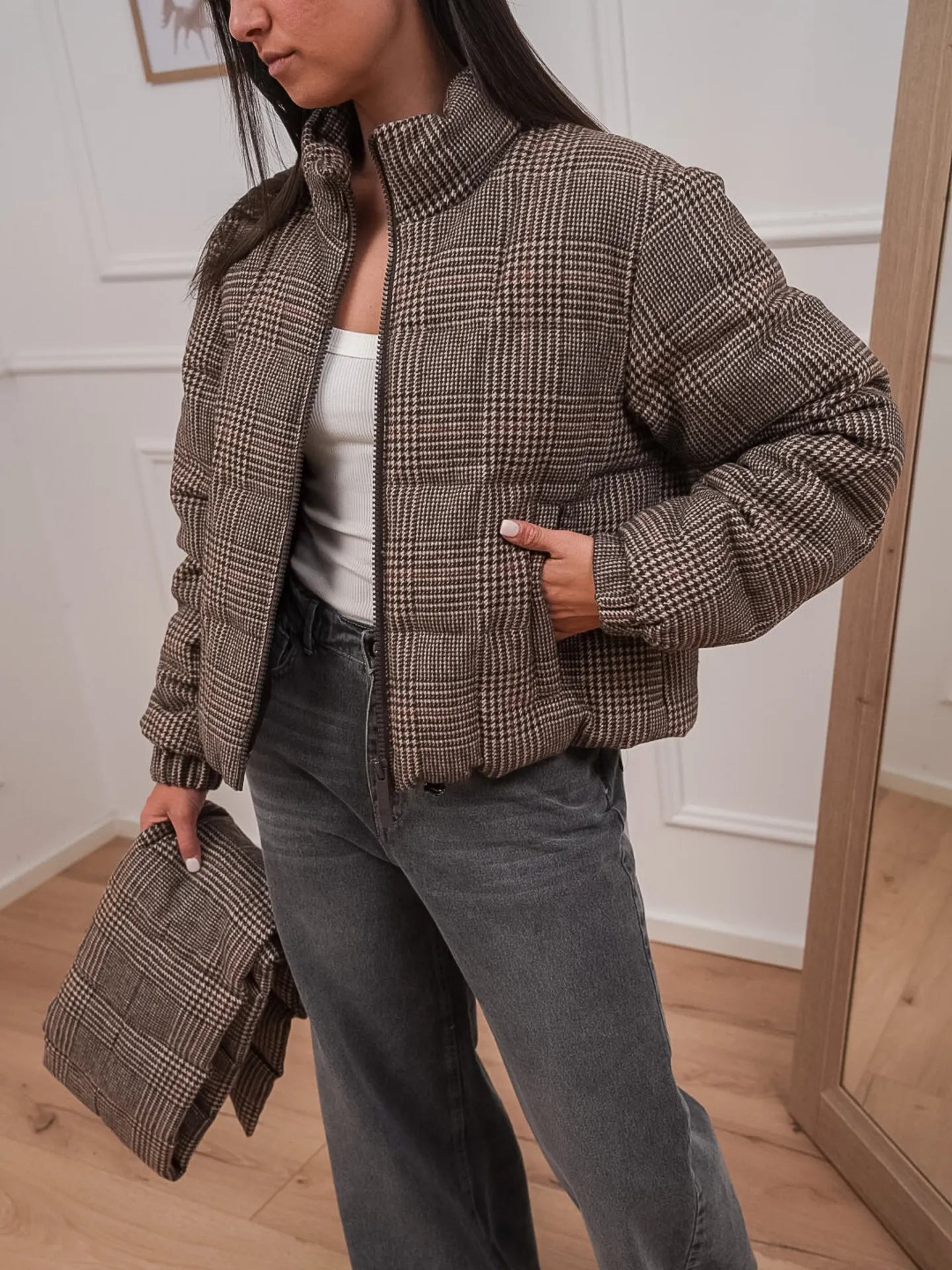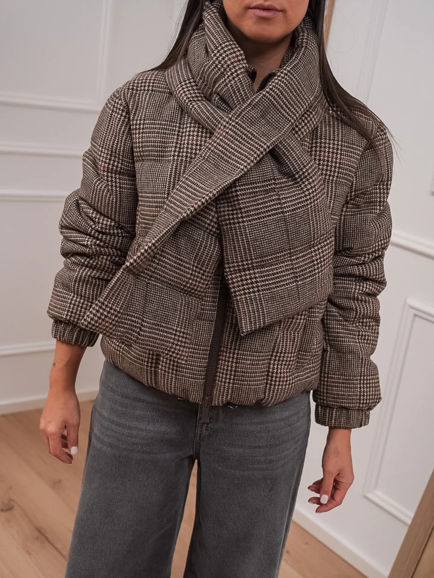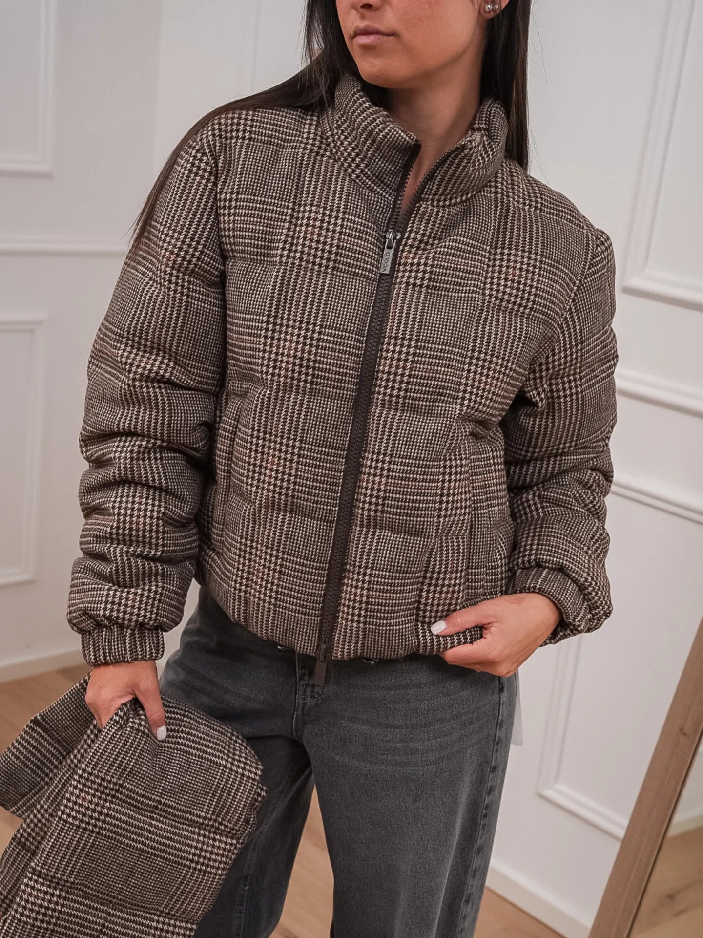 Piumino corto maniche lunghe in panno con collo con sciarpa. Chiusura frontale con cerniera. Tasche laterali alla francese. Elastico bordo maniche e sul fondo. Laccio sul fondo. tessuto a quadri.