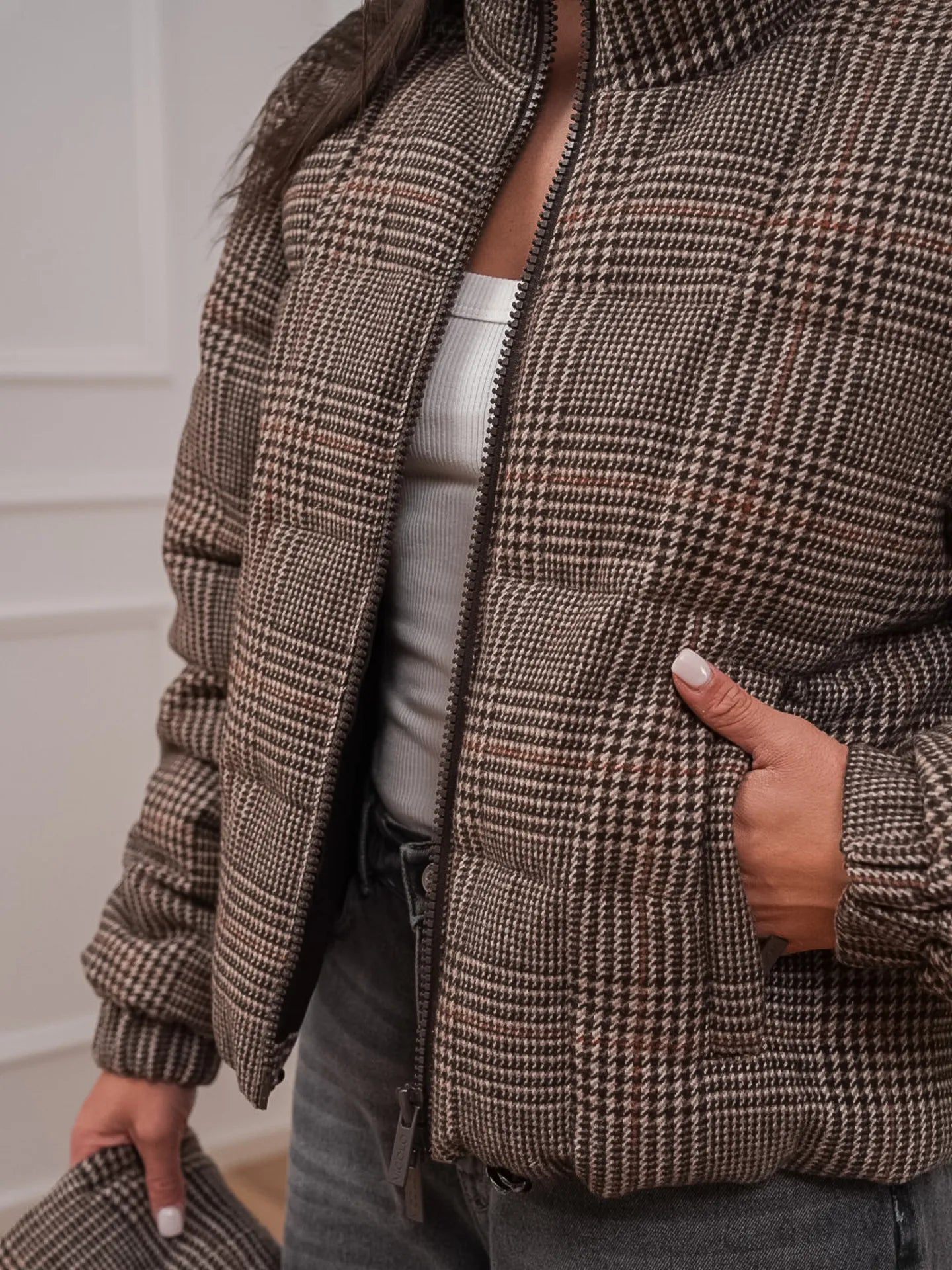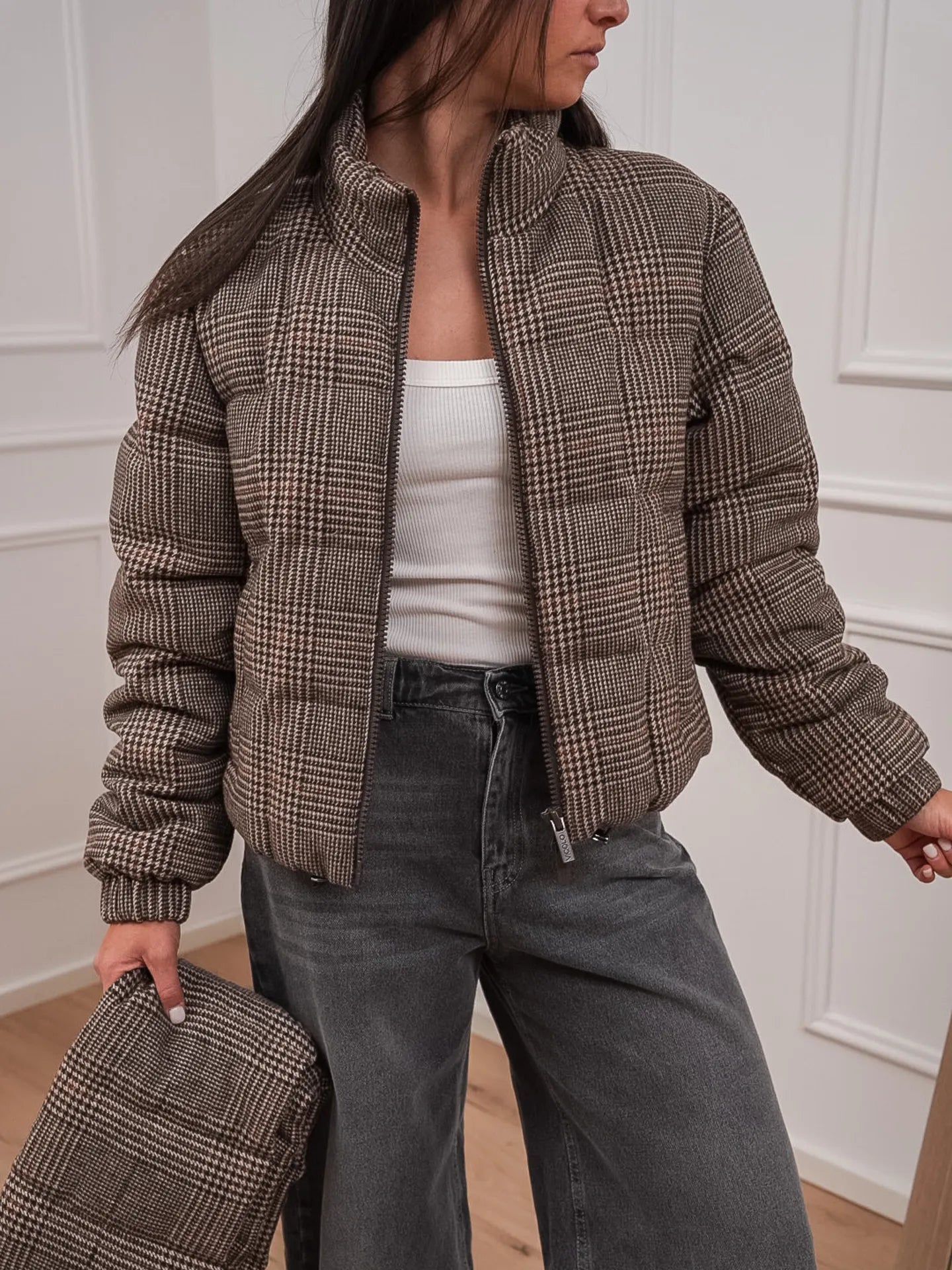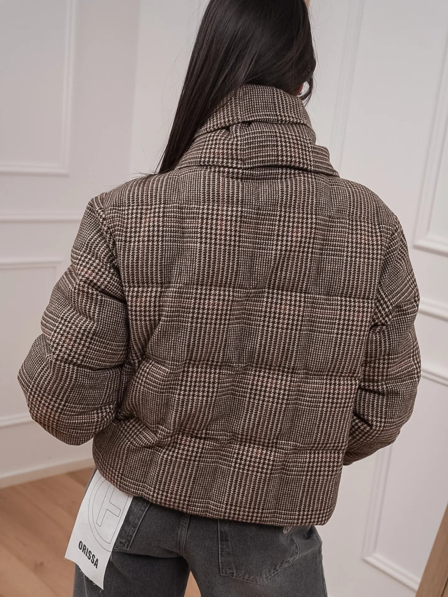 Piumino corto maniche lunghe in panno con collo con sciarpa. Chiusura frontale con cerniera. Tasche laterali alla francese. Elastico bordo maniche e sul fondo. Laccio sul fondo. tessuto a quadri.