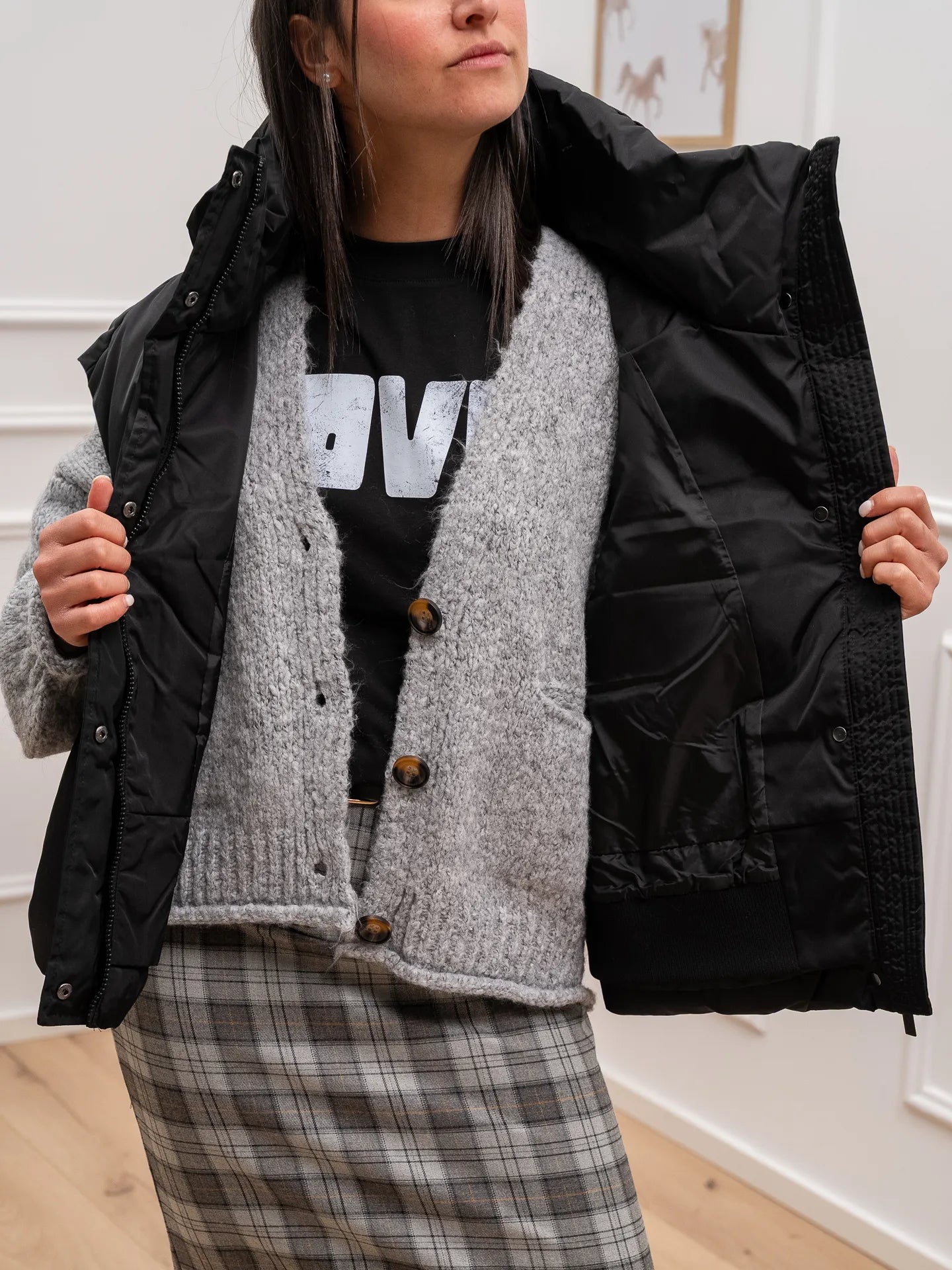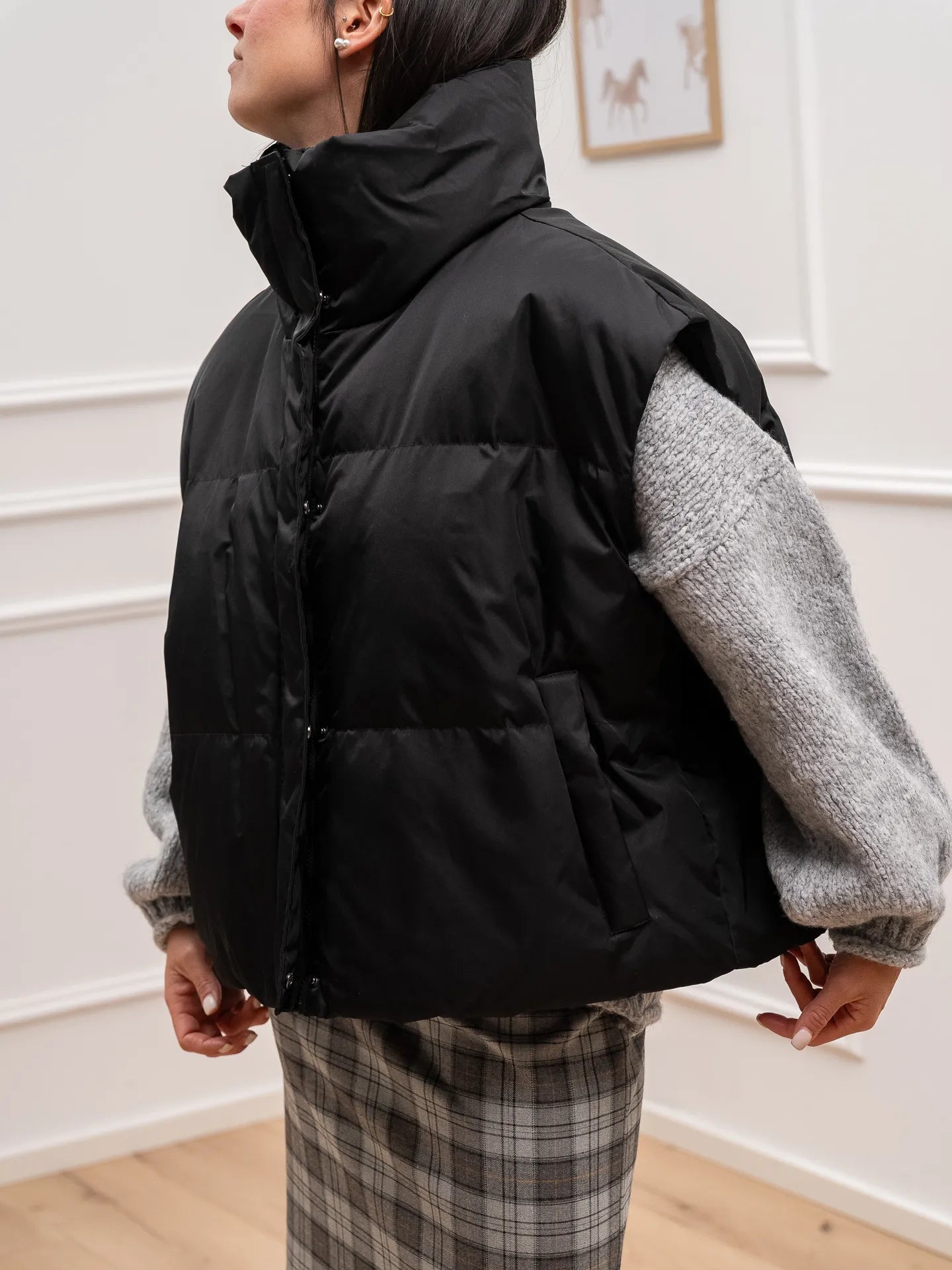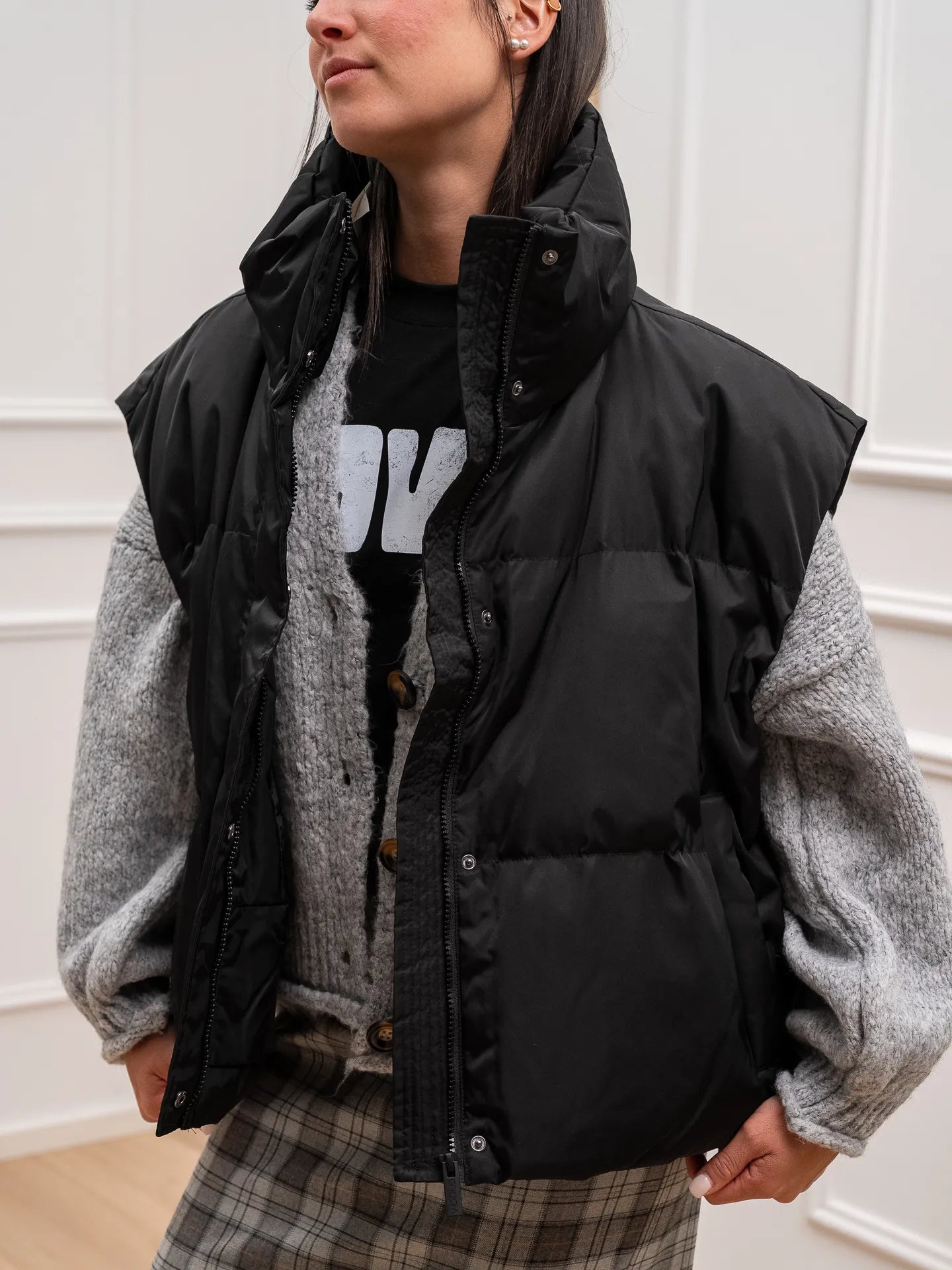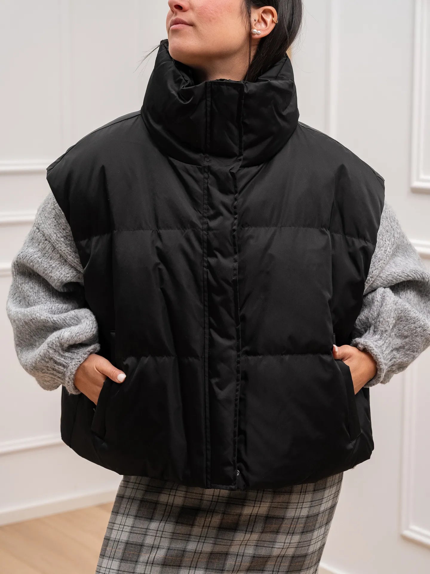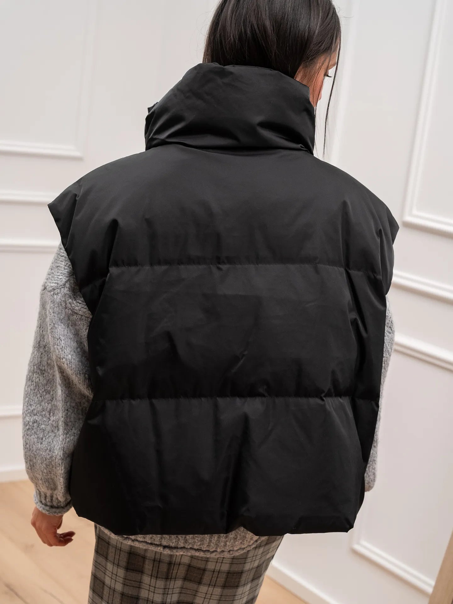 Piumino smanicato color nero Vicolo. Modello fit oversize con collo alto, chiusura con zip e bottoni nascosti. Tasche a filetto laterali con zip.