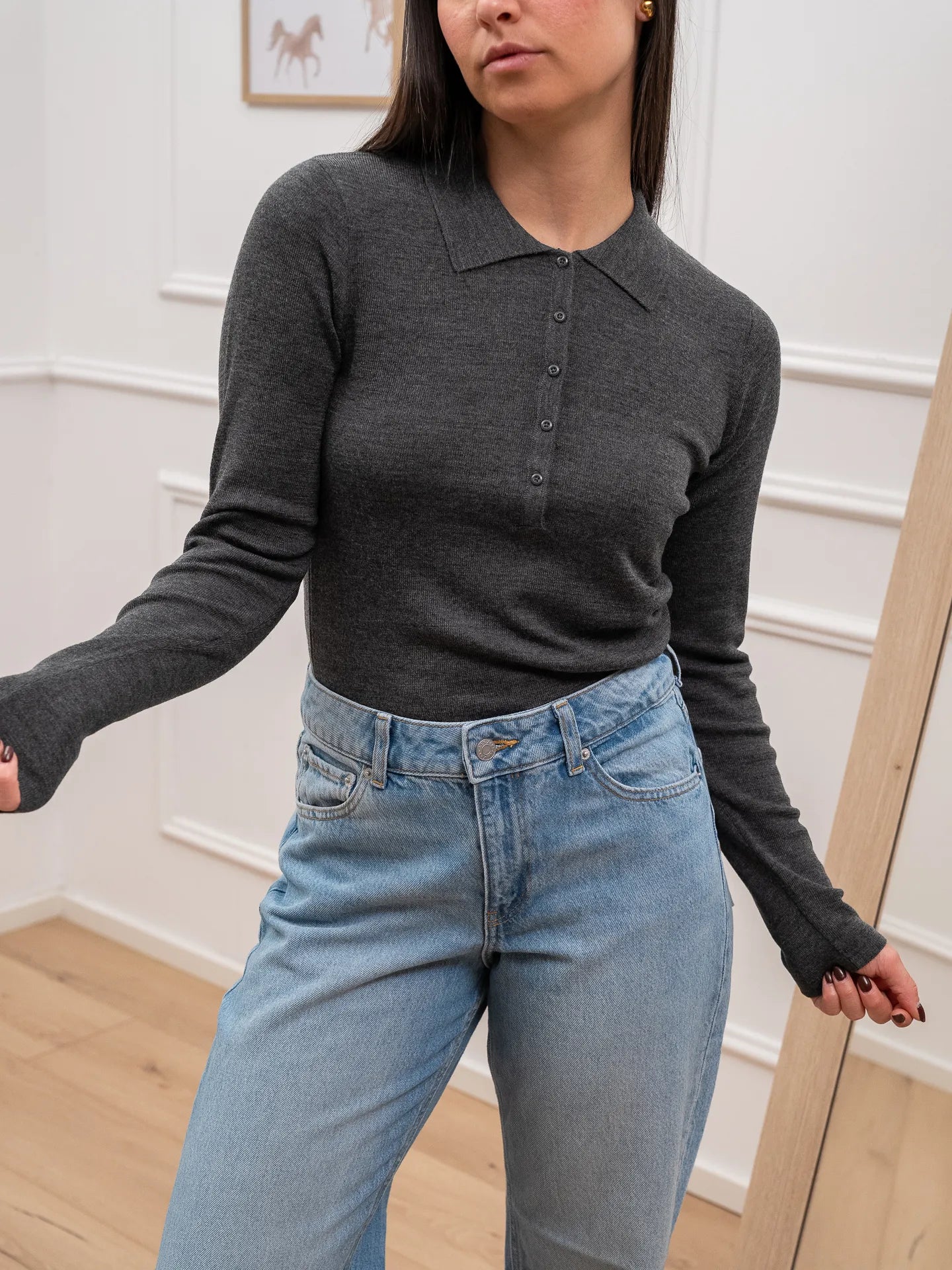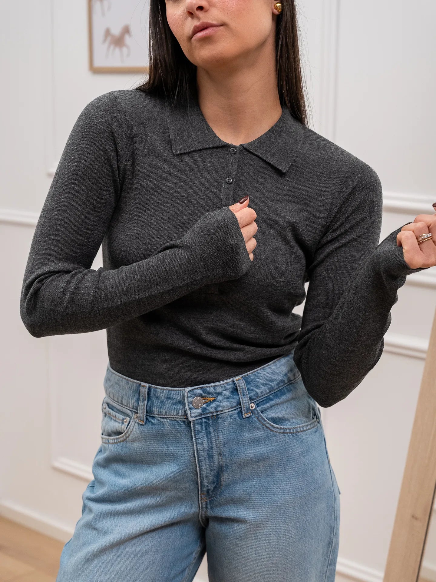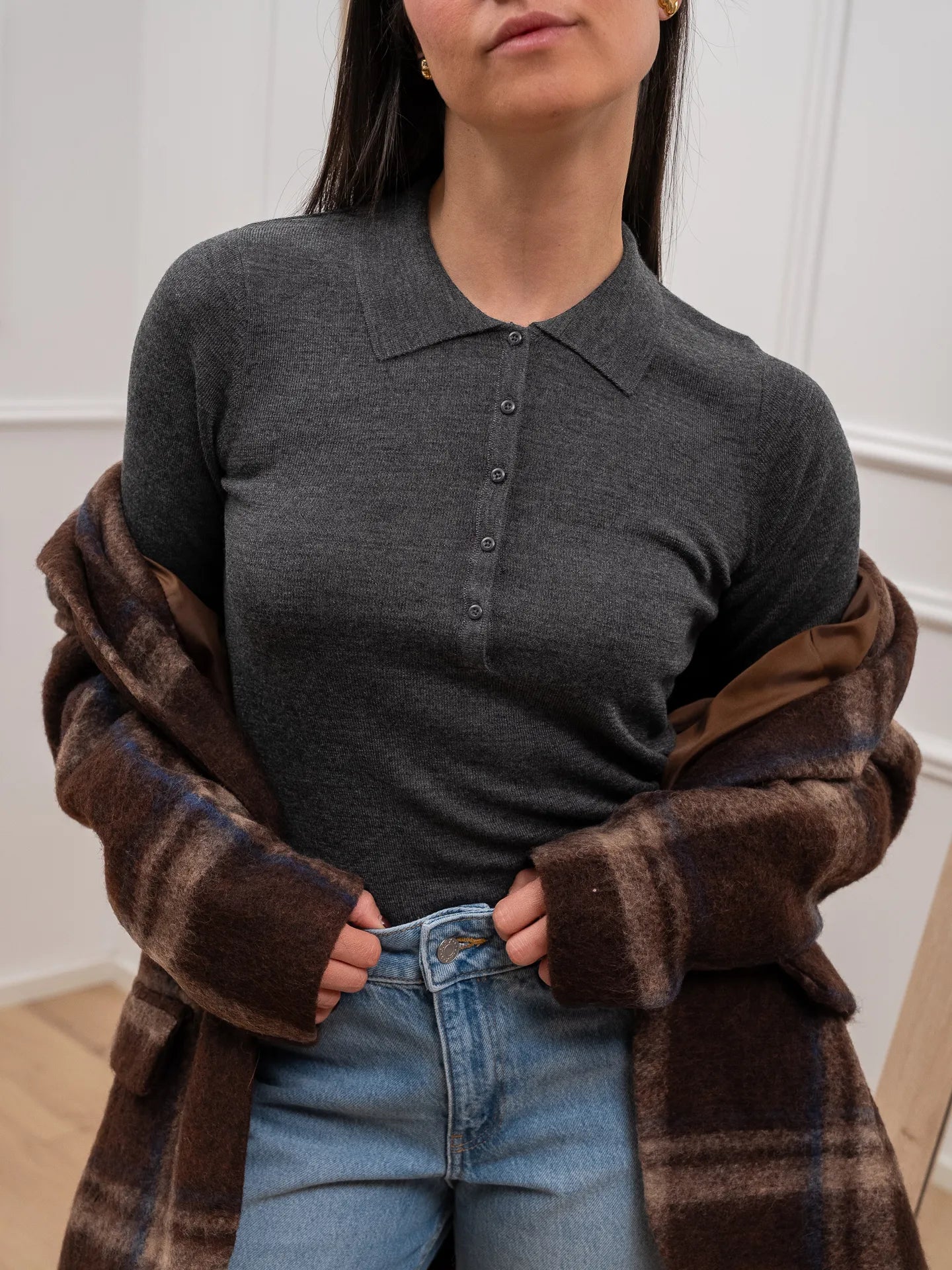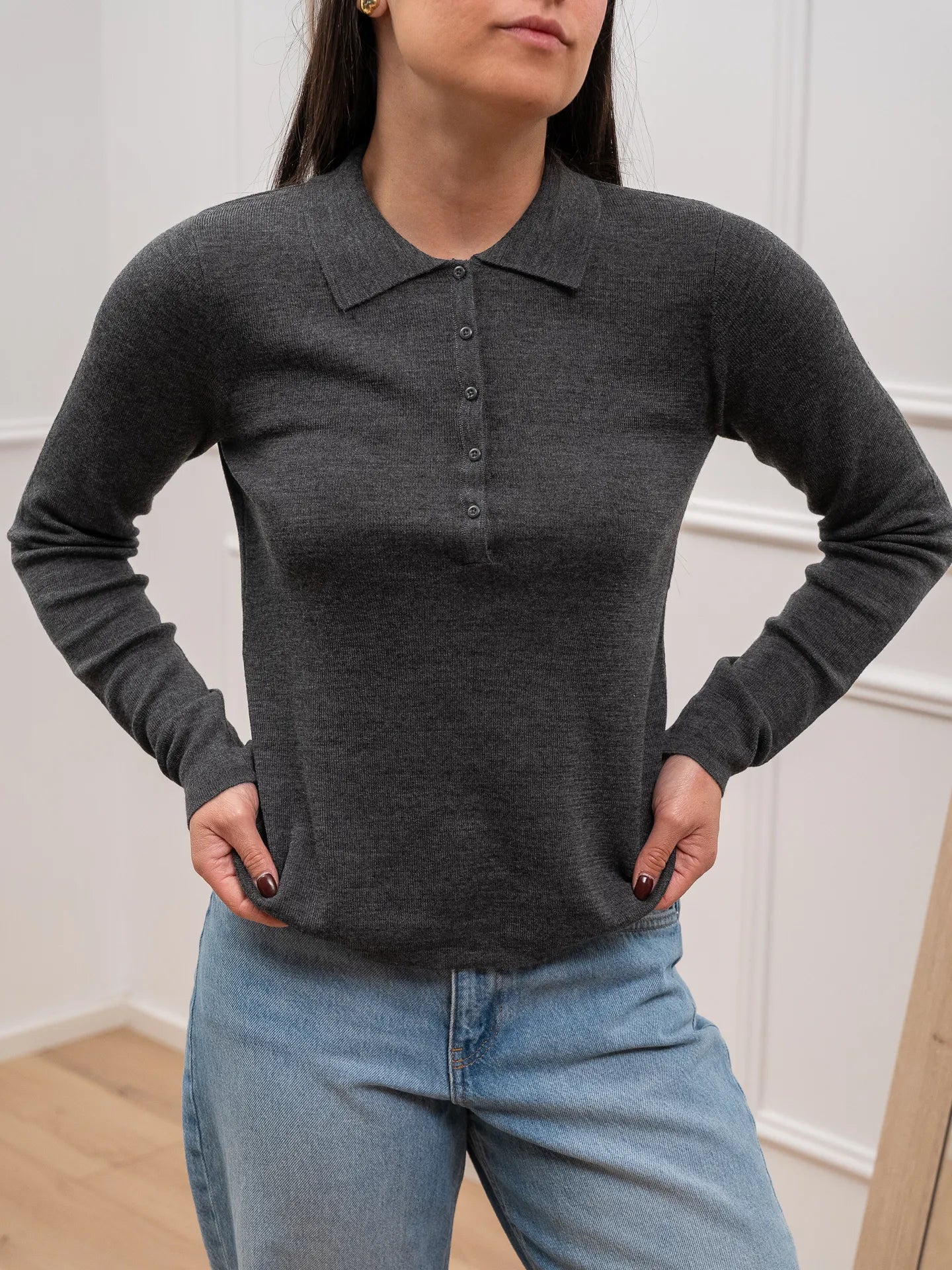 Polo color grigio scuro misto lana JJXX. Modello fit regolare con colletto e bottoncini sullo scollo a manica lunga.