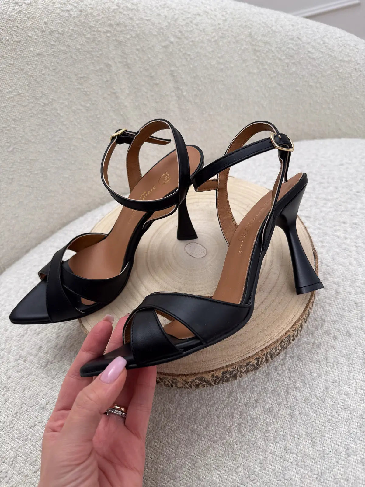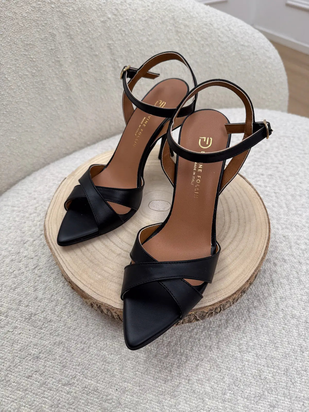 Sandali color nero in pelle Divine Follie. Modello a punta con laccetto regolabile alla caviglia. Dettaglio di fasce ad incrocio sulla parte frontale.
