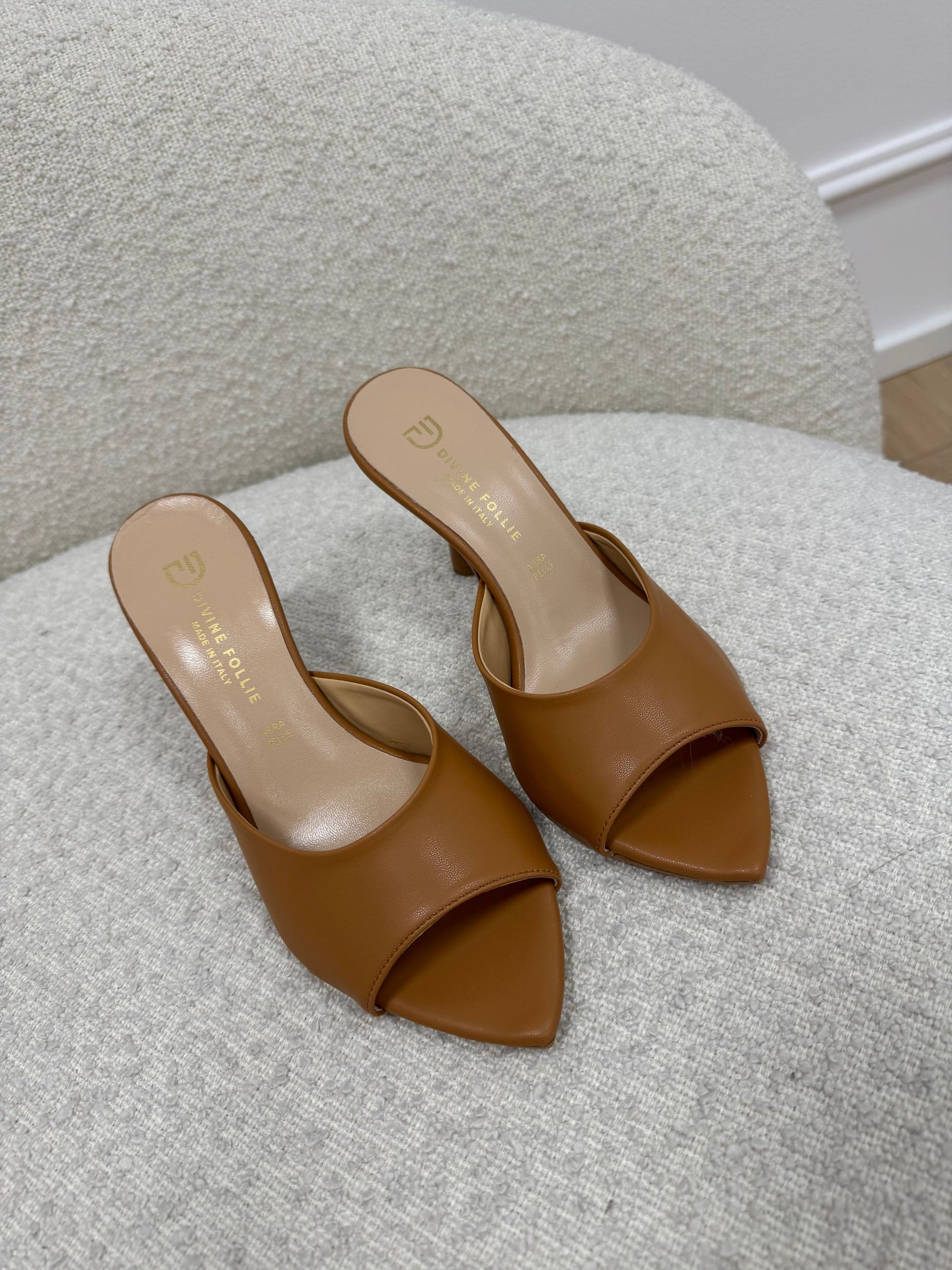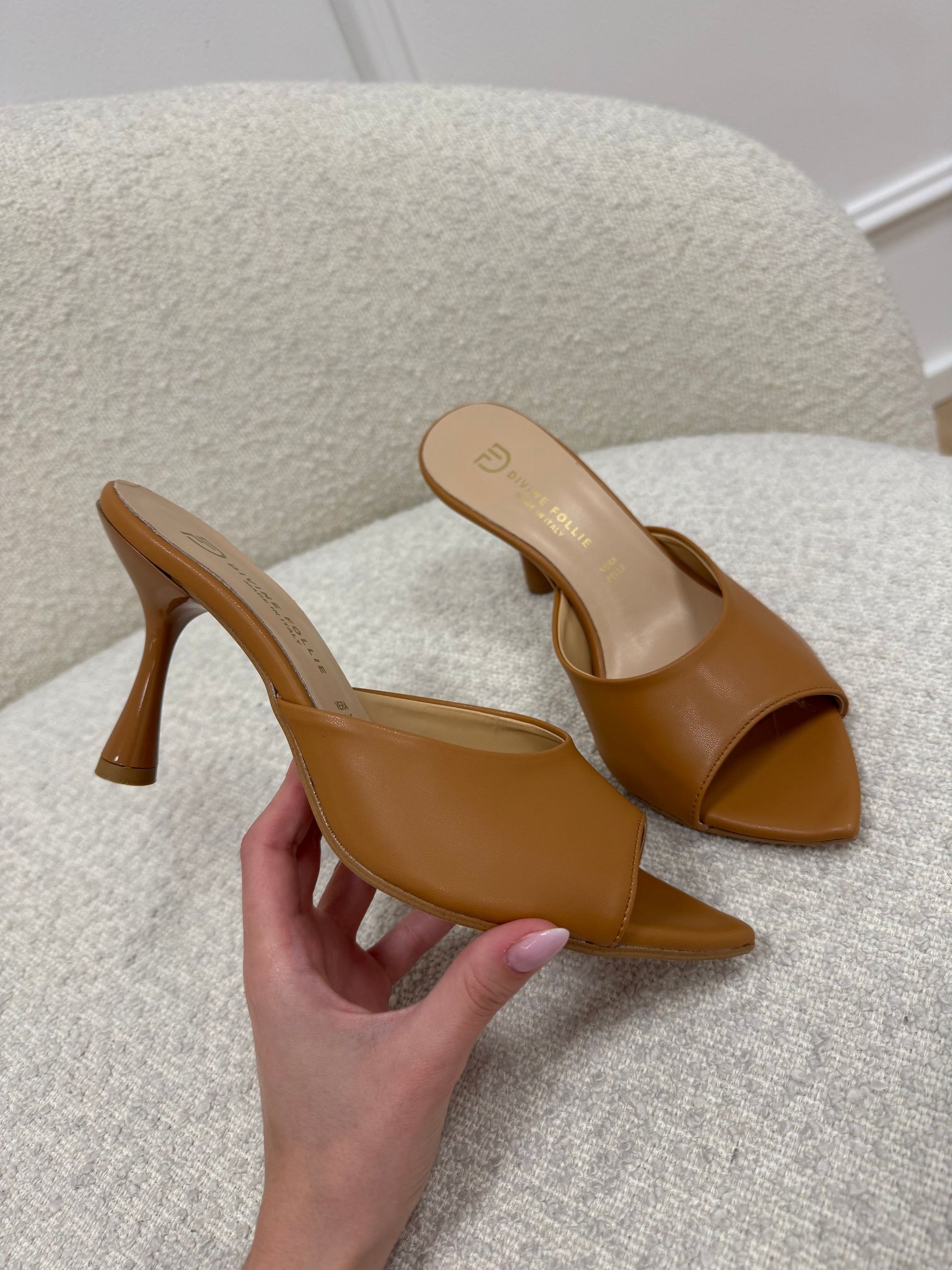 Sabot color miele in pelle Divine Follie. Modello a punta con tacco a rocchetto.