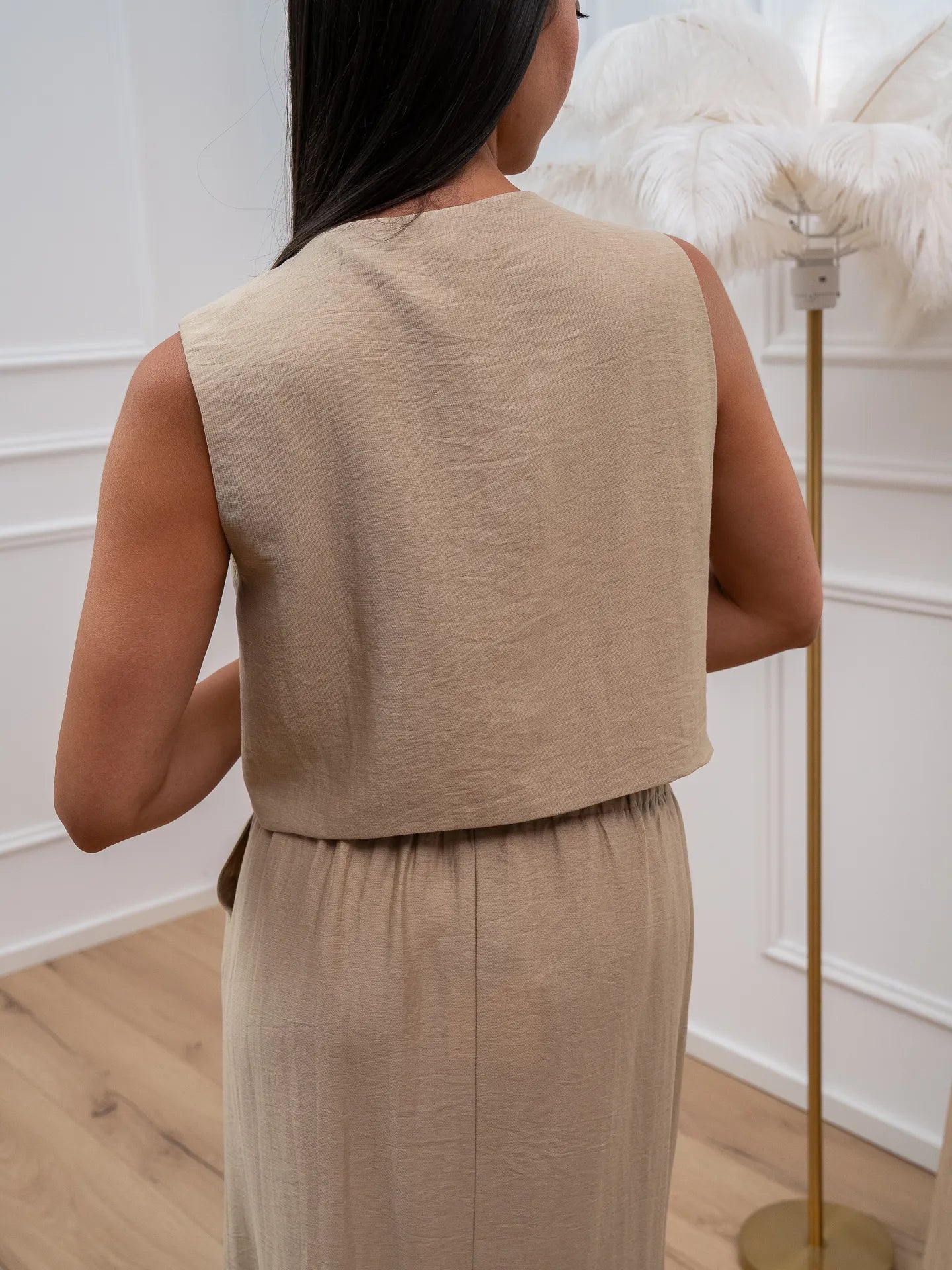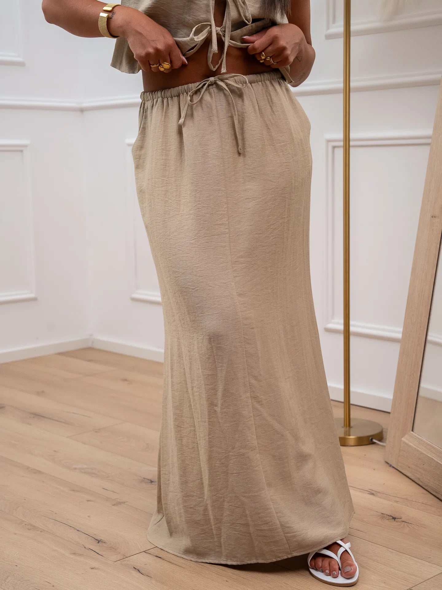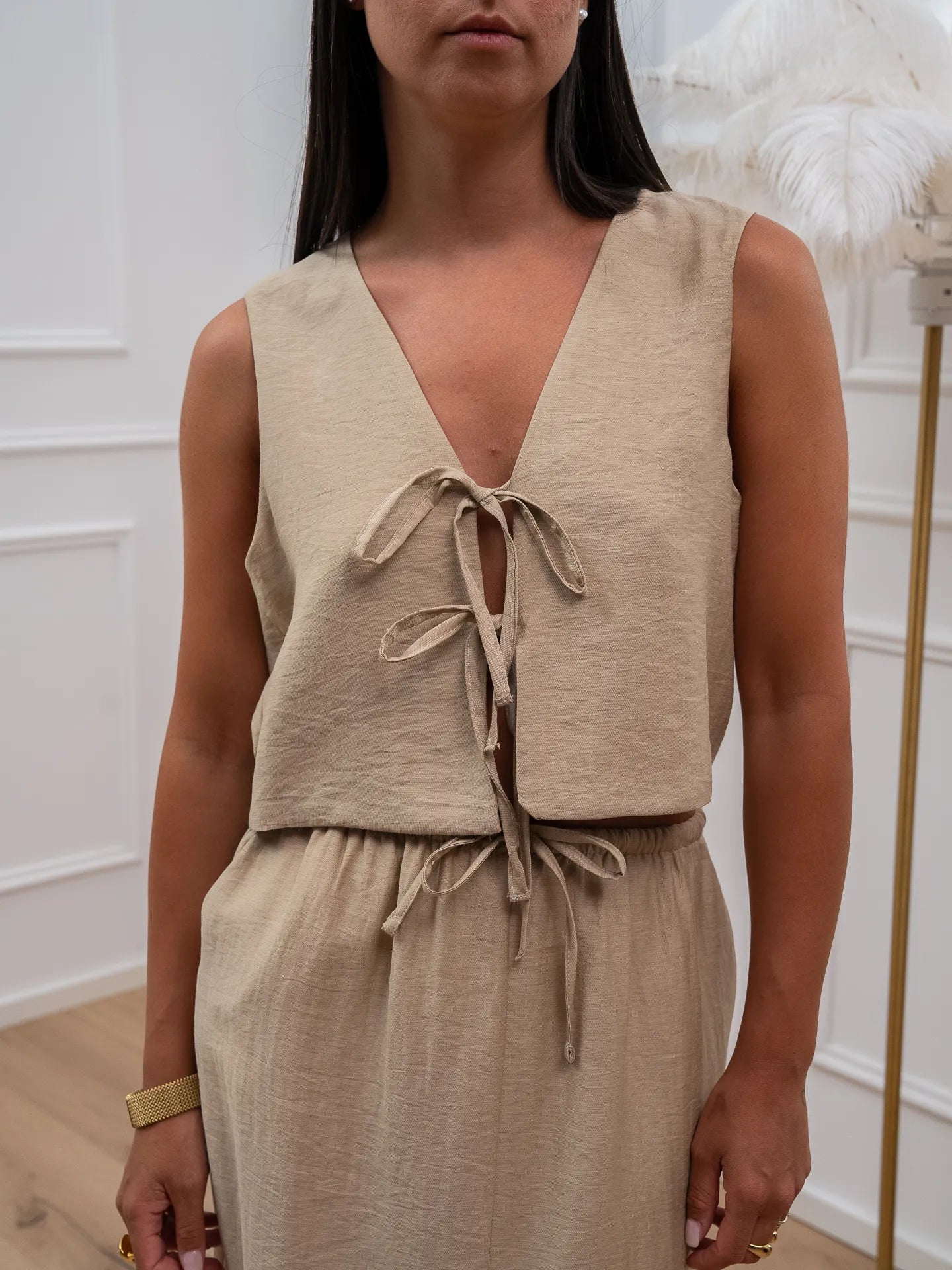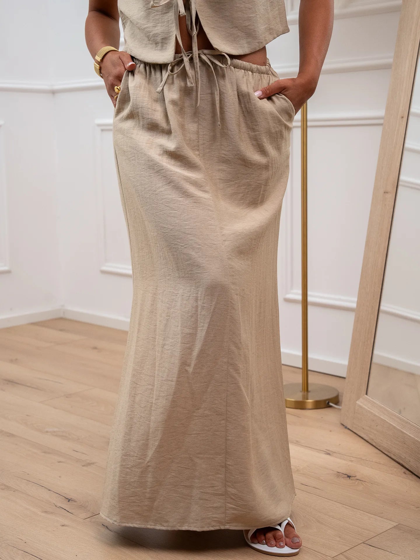 Set coordinato color sabbia misto lino e viscosa Vicolo. Modello composto da gilet basic con fiocchi frontali e gonna lunga morbida a vita alta elasticizzata con coulisse regolabile.