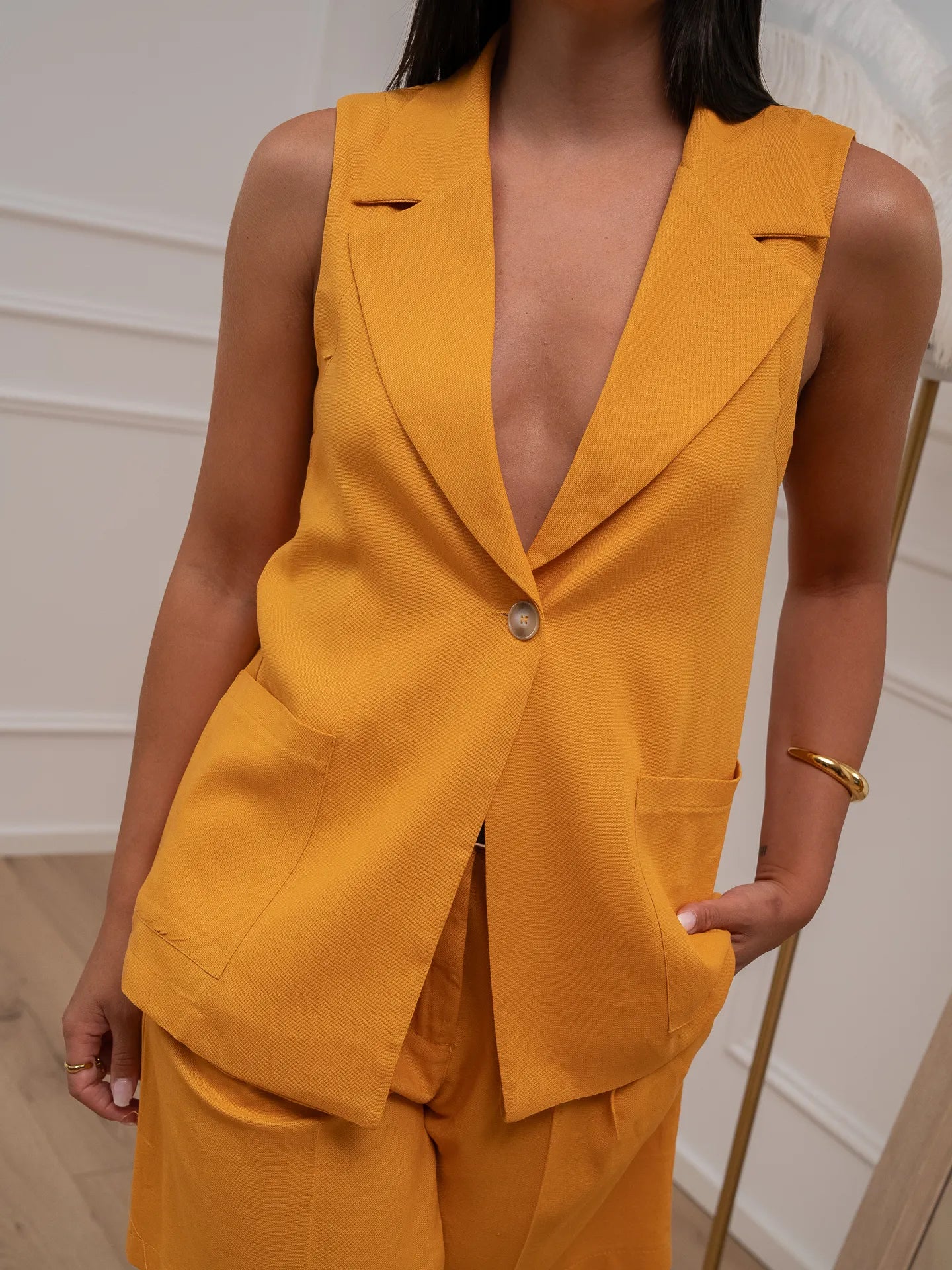 Set coordinato misto lino color ocra Vicolo. Modello gilet fit morbido con scollo a v, collo revers e chiusura ad un bottone.