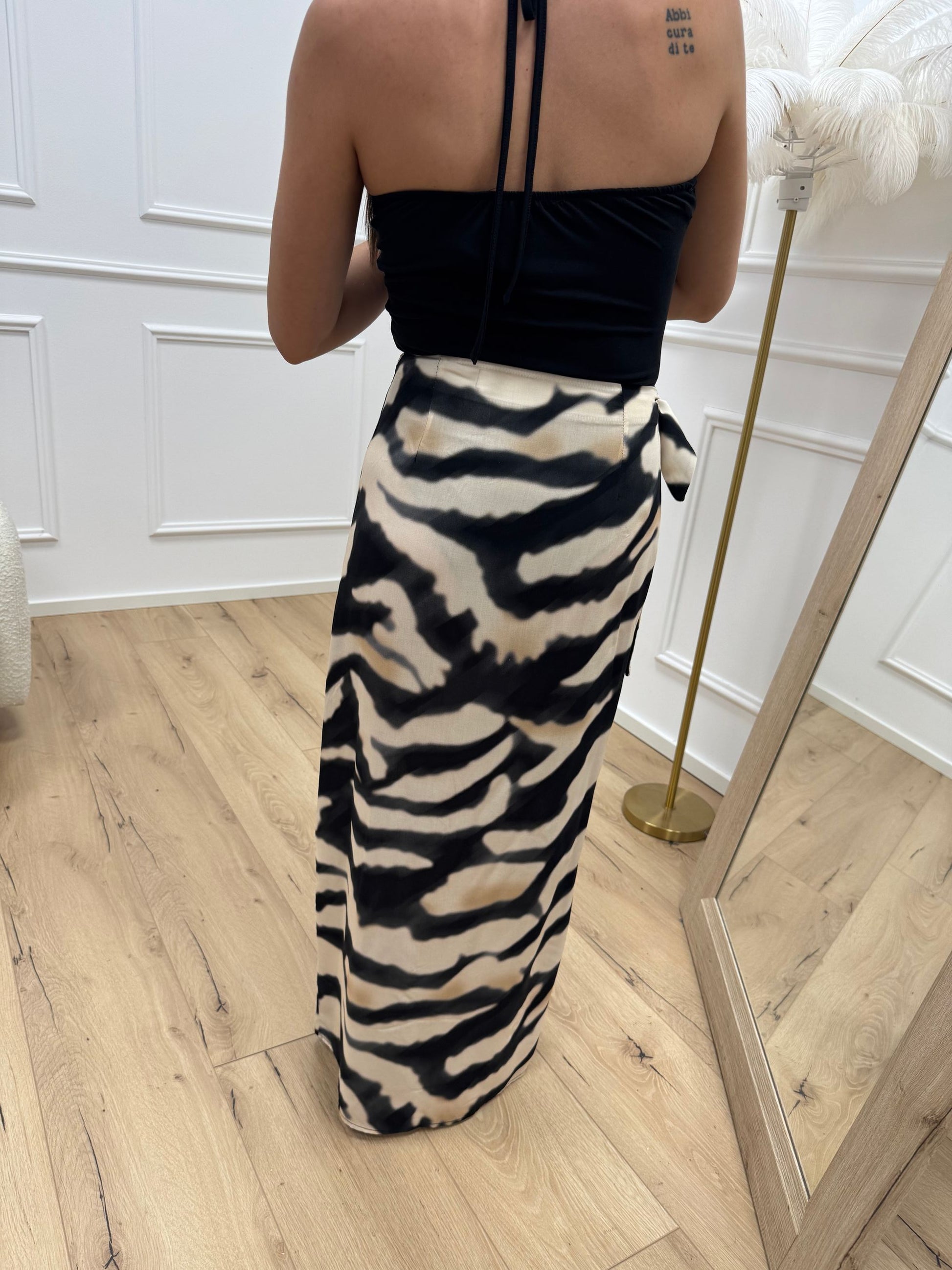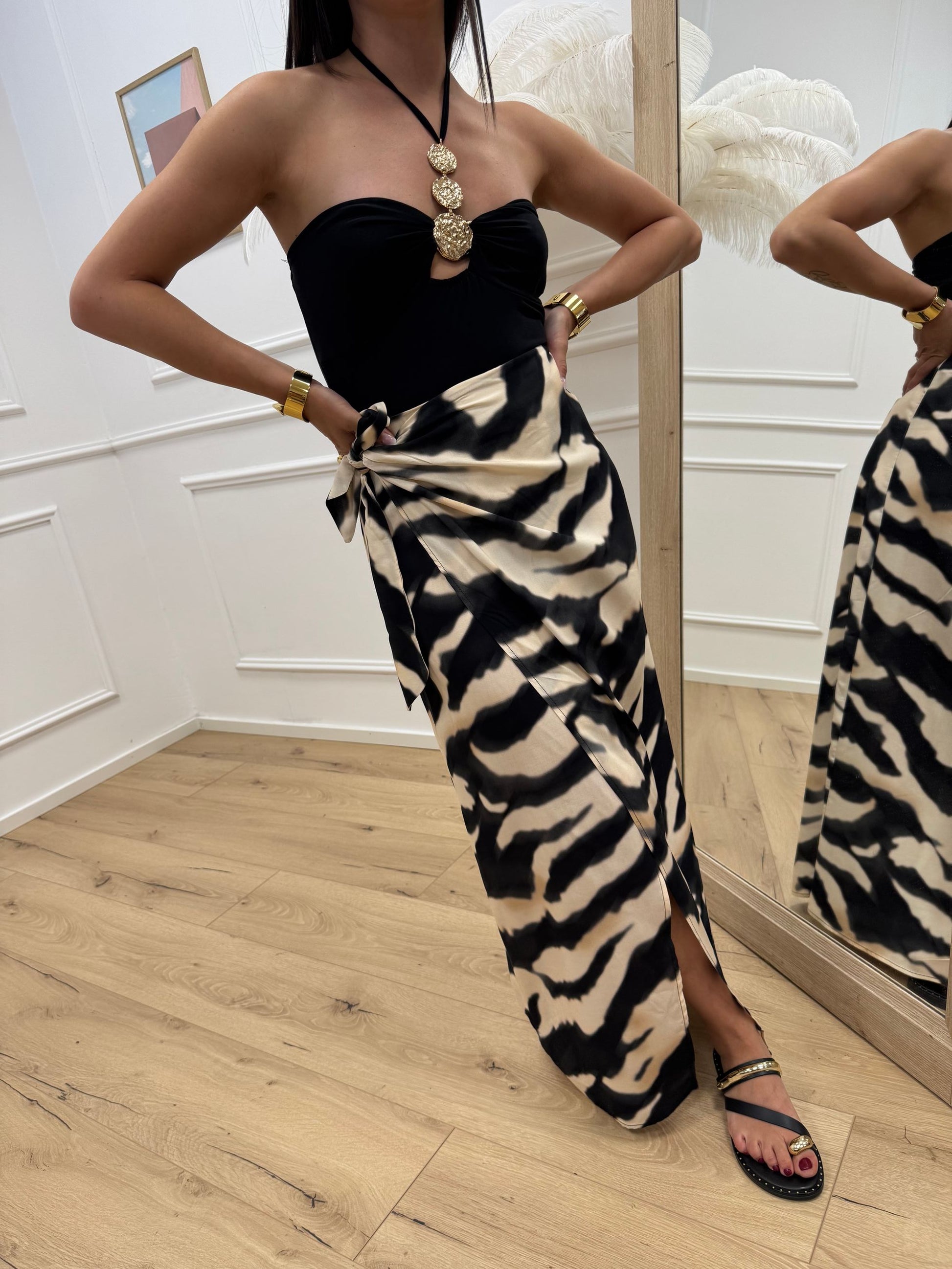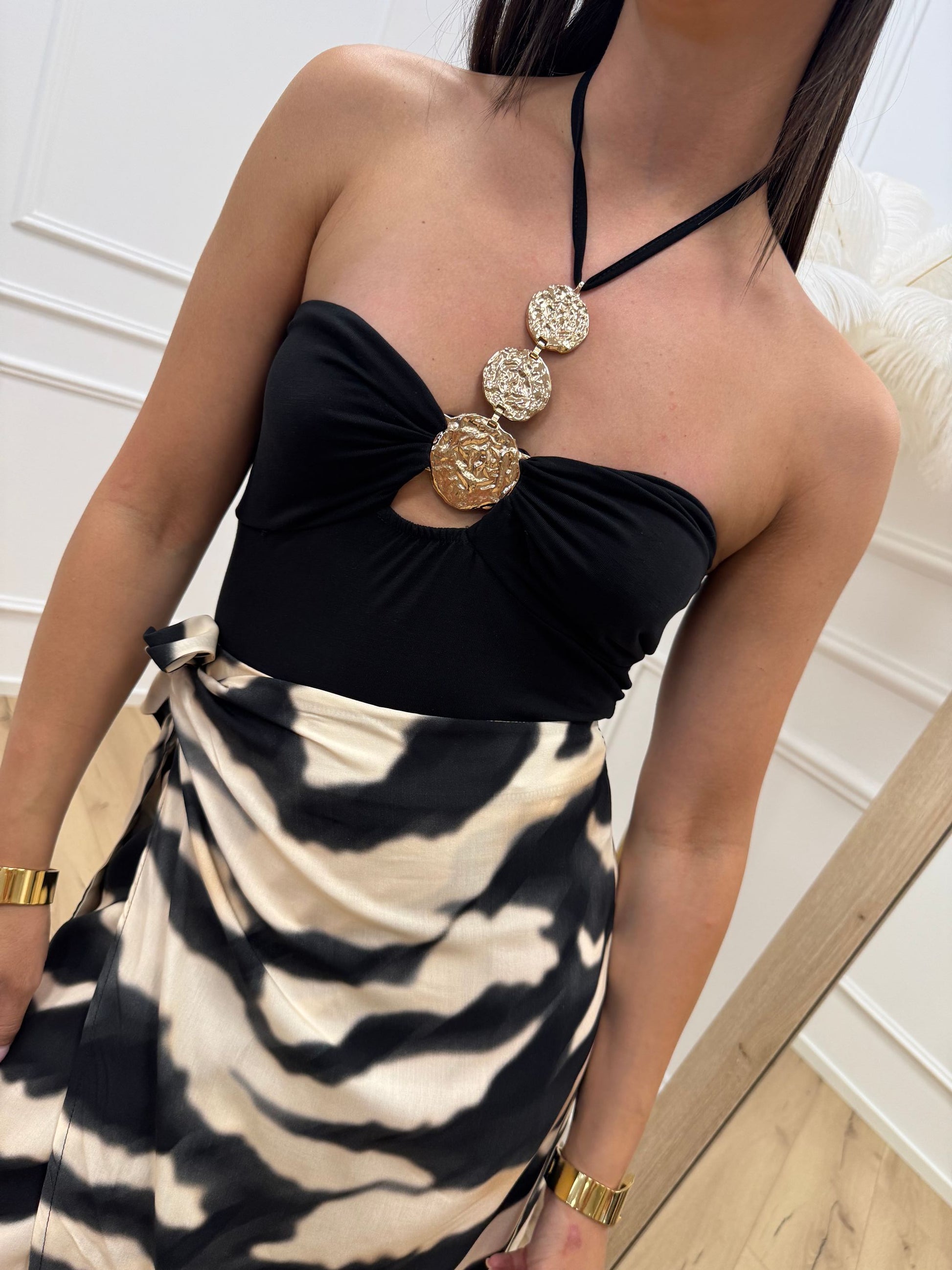 Set coordinato Shade HaveOne. Modello body in lycra color nero con scollo america e dettaglio dorato frontale. Gonnain fantasia panna e nero stile pareo con doppia chiusura con laccetti e vita alta. Fit regolare.