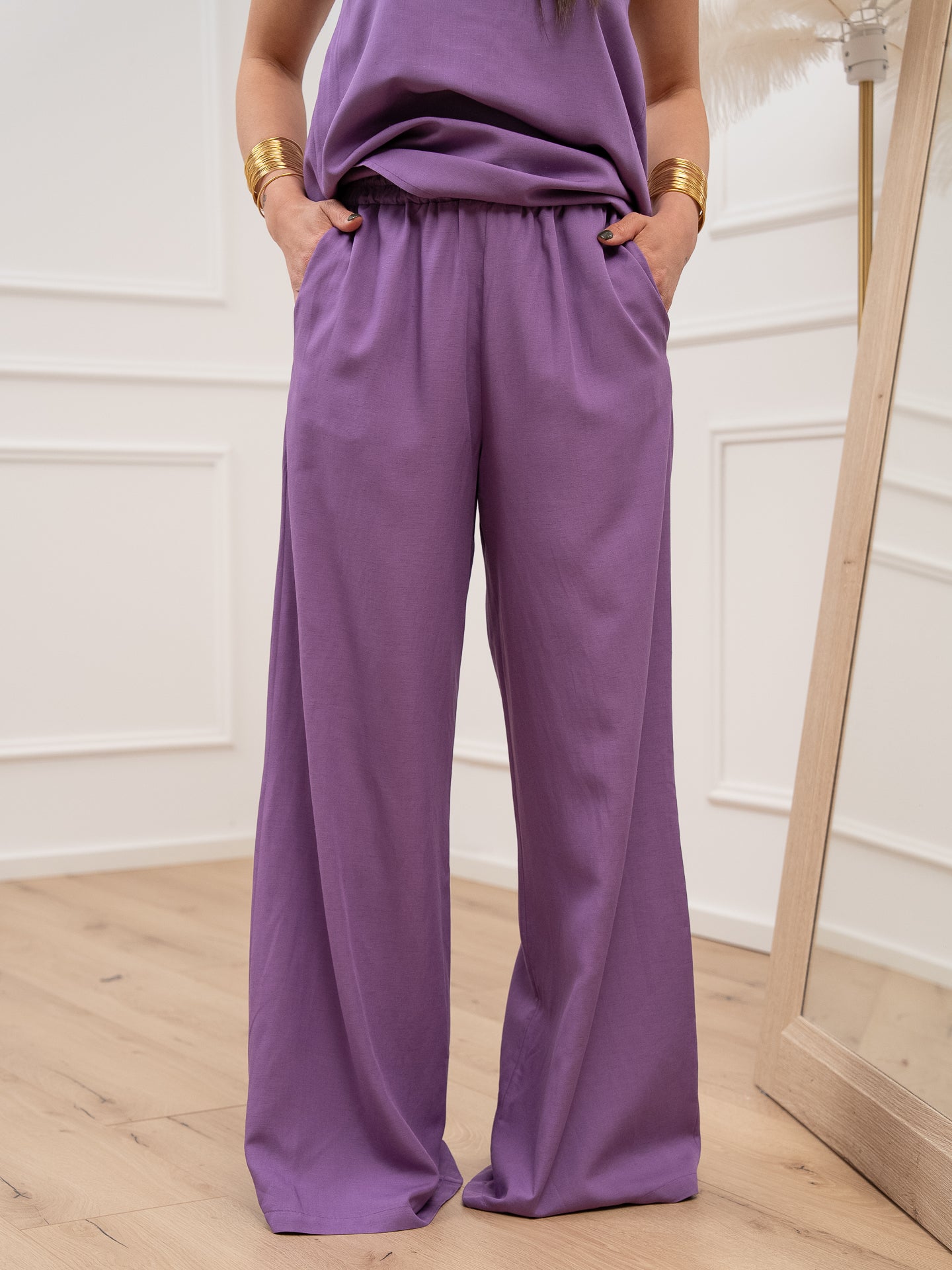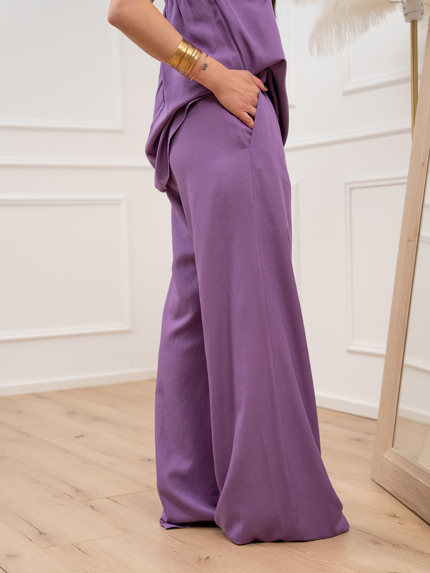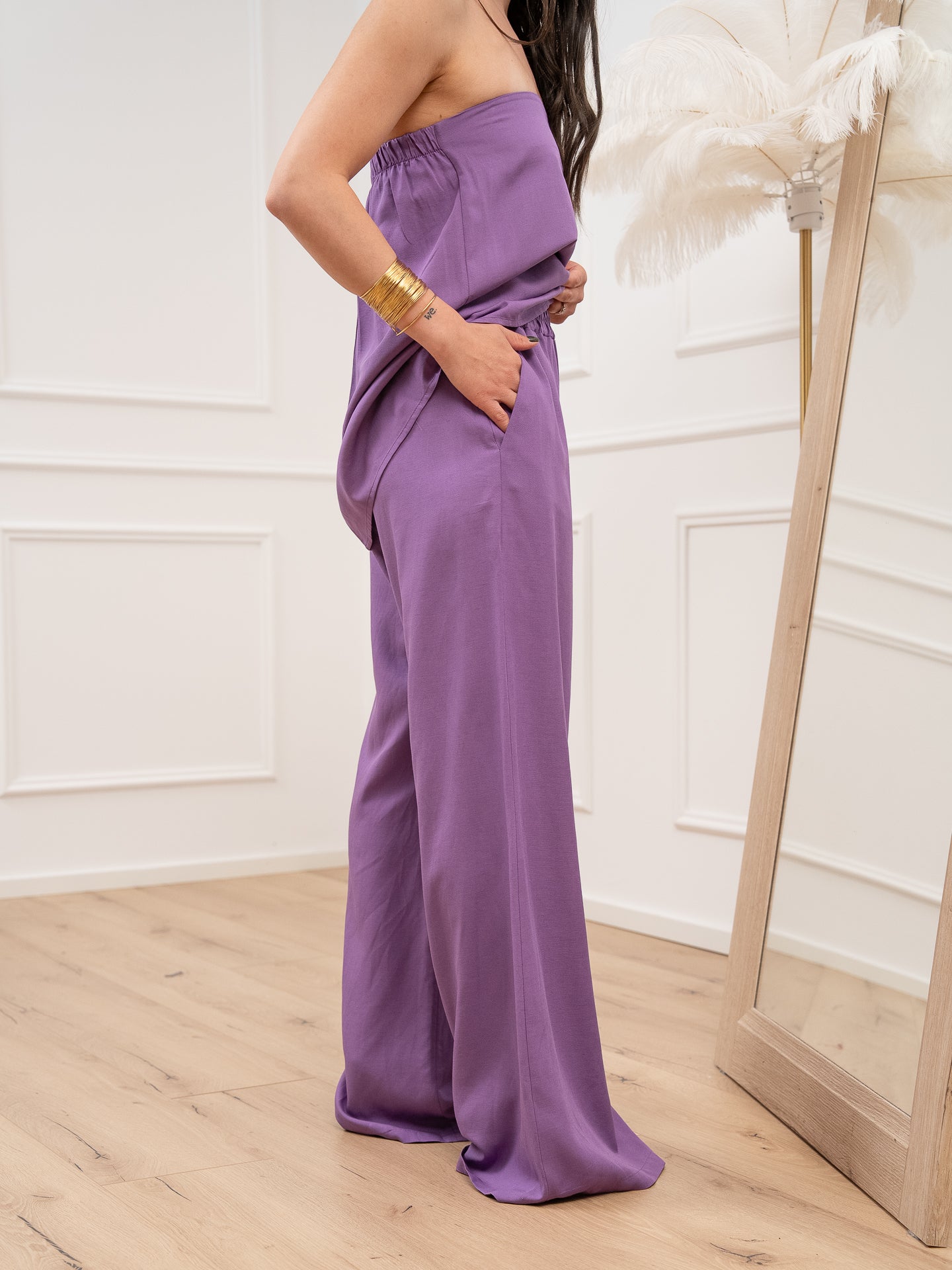 Set coordinato top e pantalone color viola Tensione In. Modello a fascia con molla sul retro e pantalone a palazzo con vita alta elasticizzata.