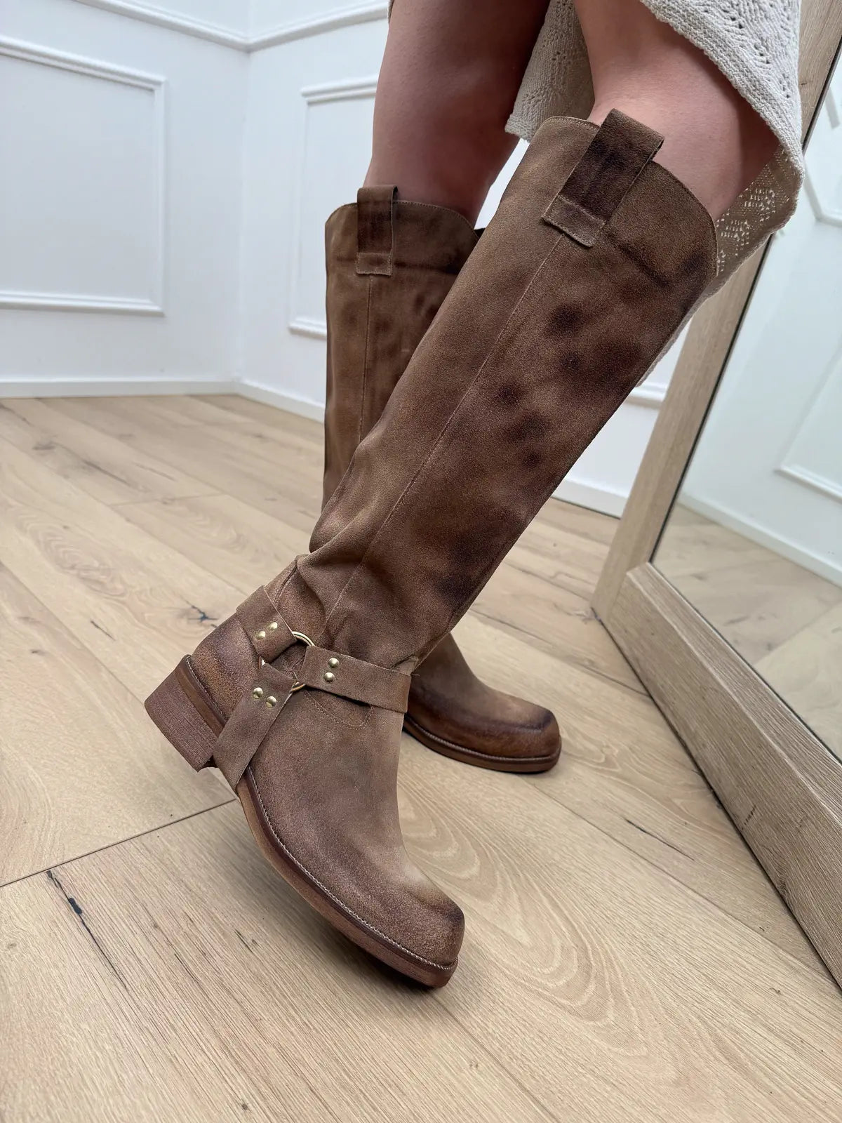 Stivale biker in crosta taupe con fibbia - Divine Follie