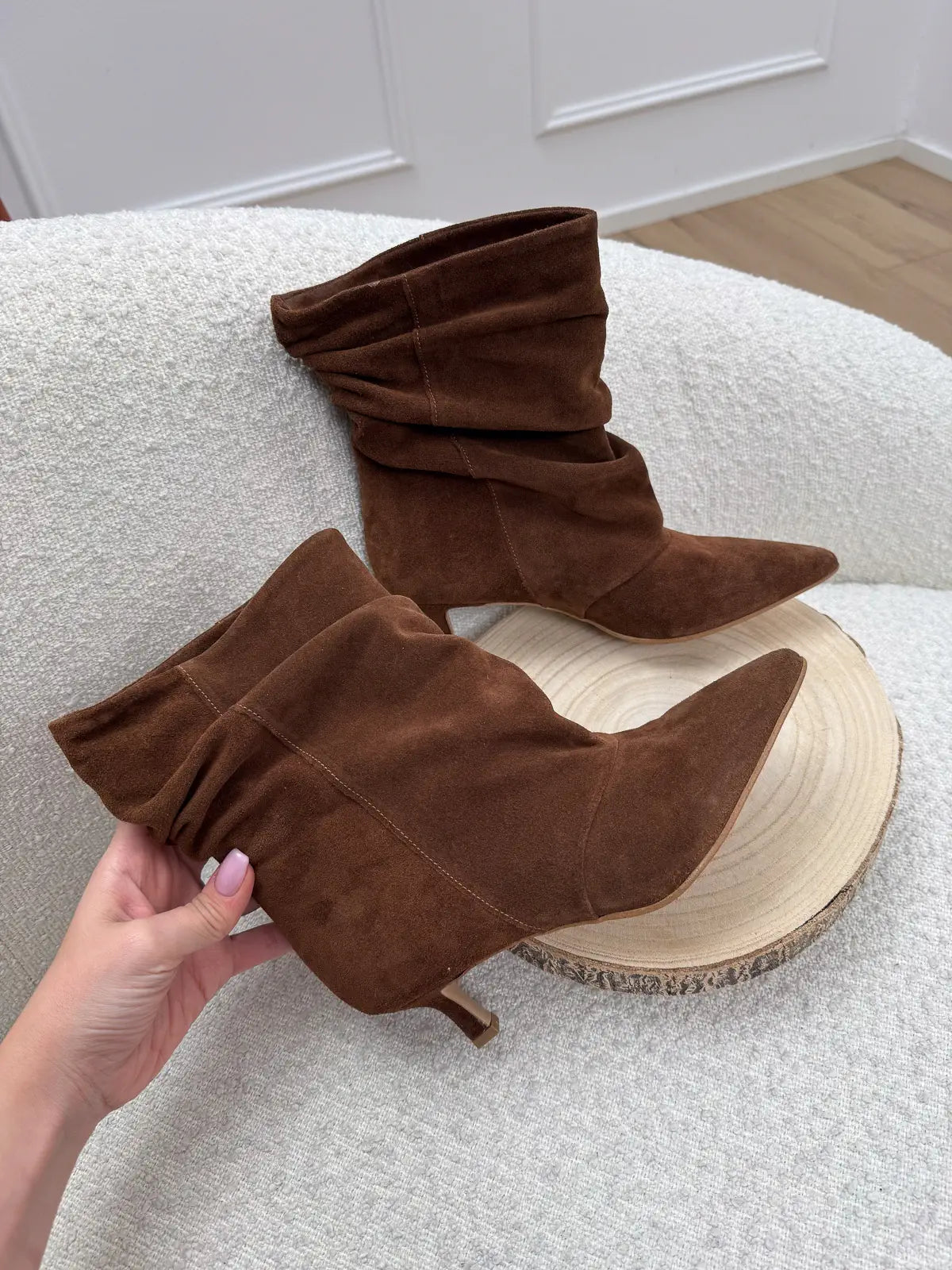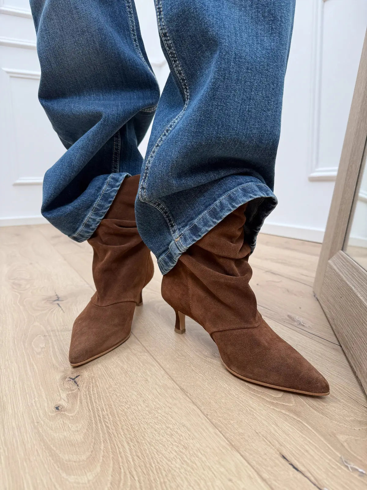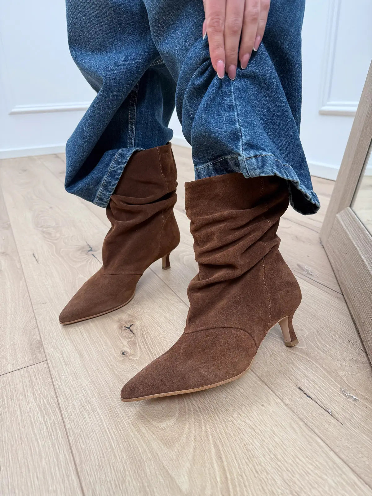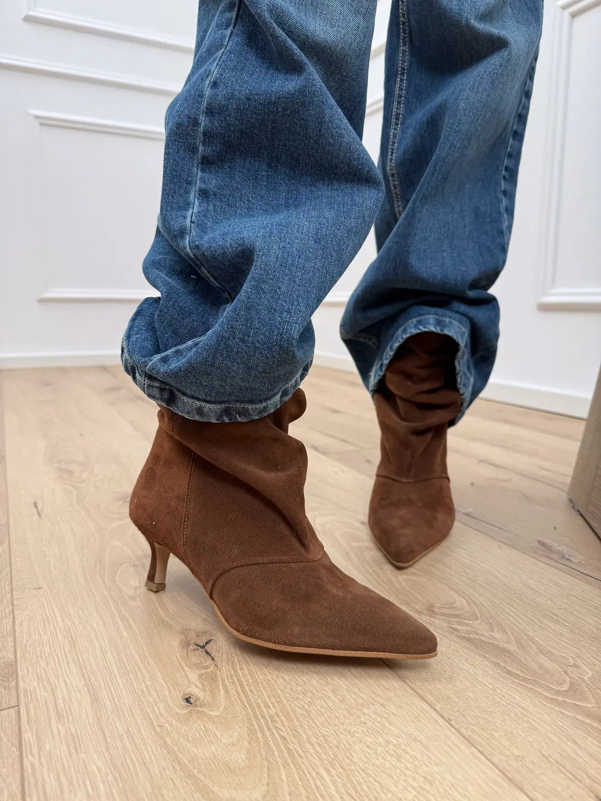 Stivaletto color bruciato in pelle scamosciata Divine Follie. Modello basso a punta con dettaglio di gambale morbido arricciato.
