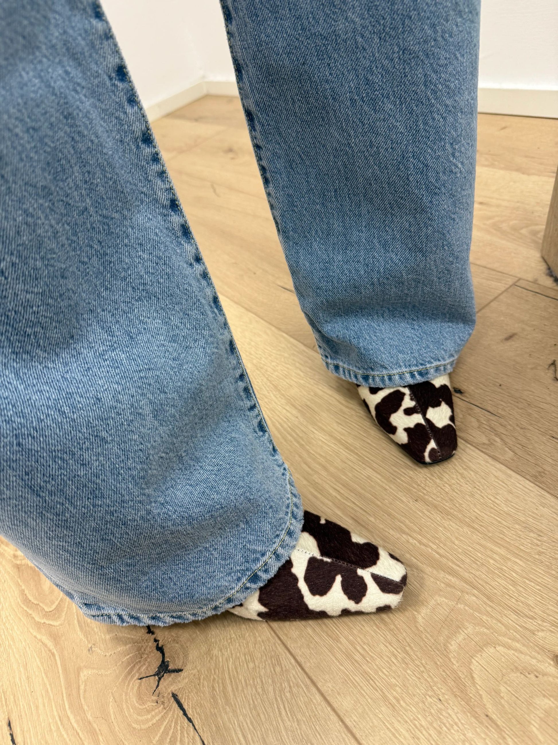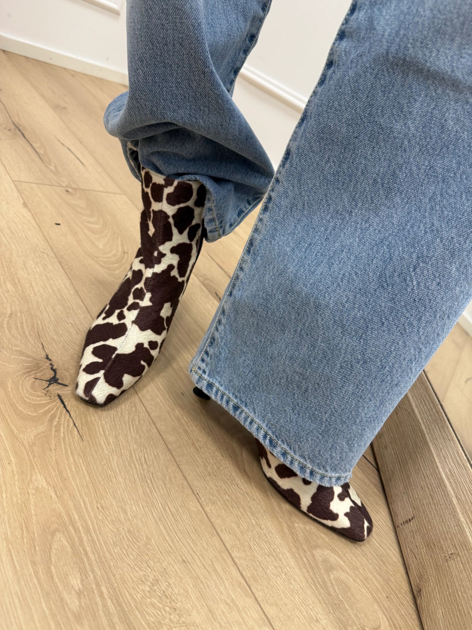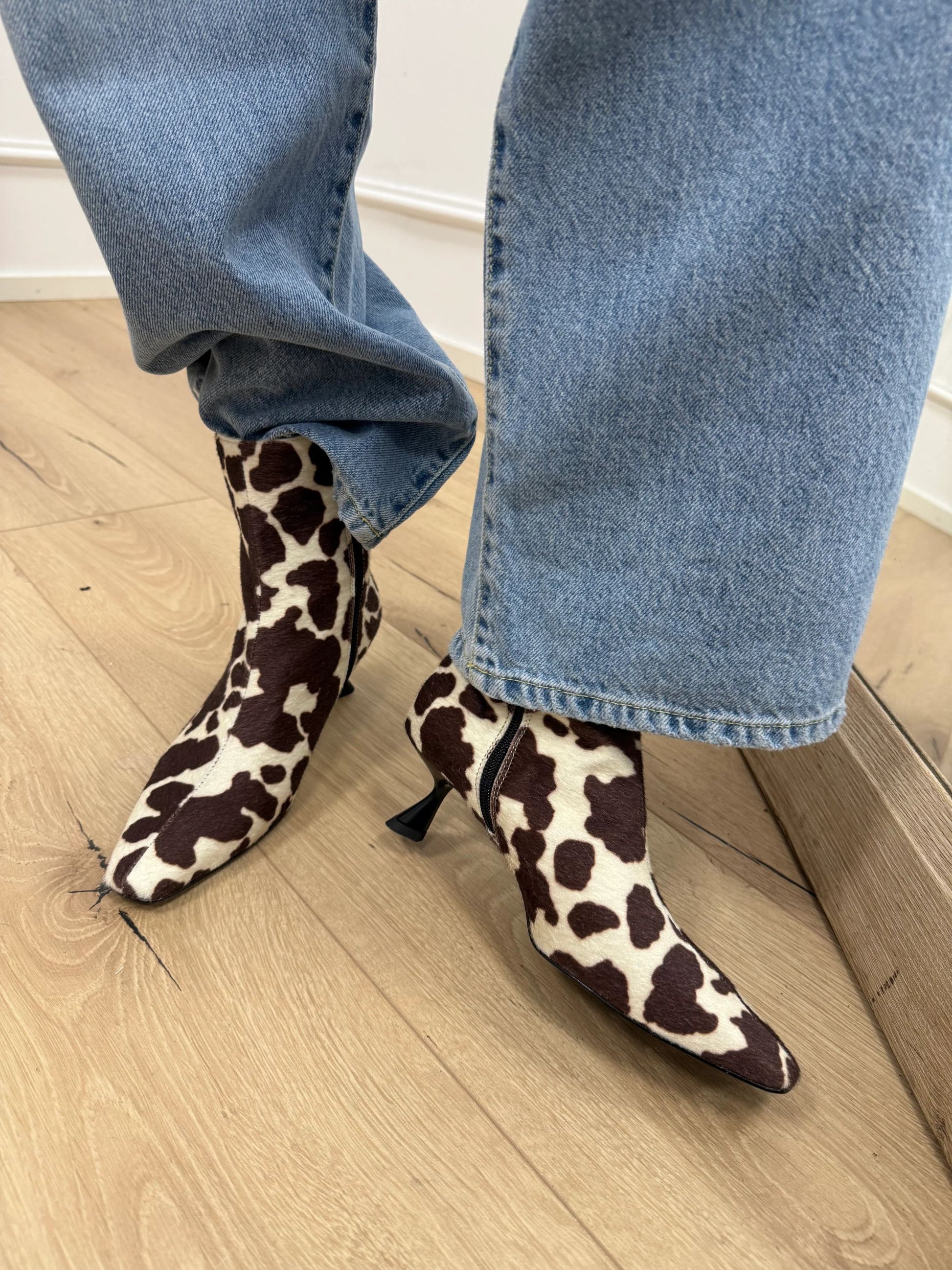 Stivaletti in cavallino color cow Ovyè. Modello tronchetto a punta con tacco e cucitura frontale in rilievo. Chiusura con zip laterale.