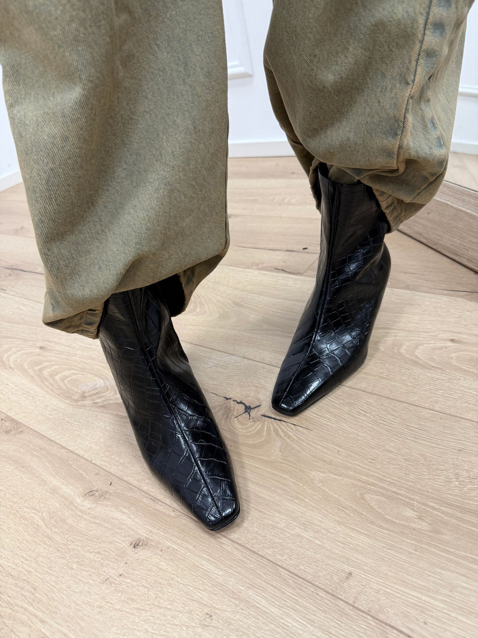 Stivaletti in cocco color nero Ovyè. Modello tronchetto a punta con tacco e cucitura frontale in rilievo. Chiusura con zip laterale.