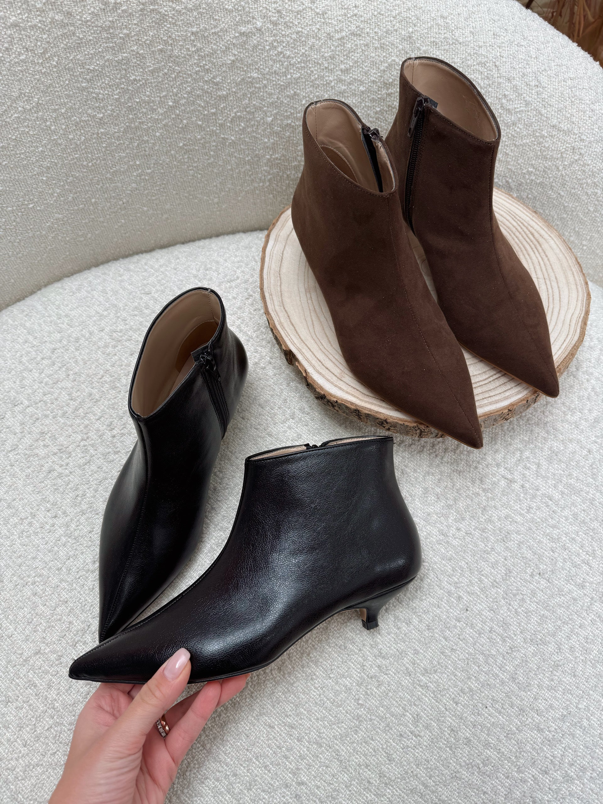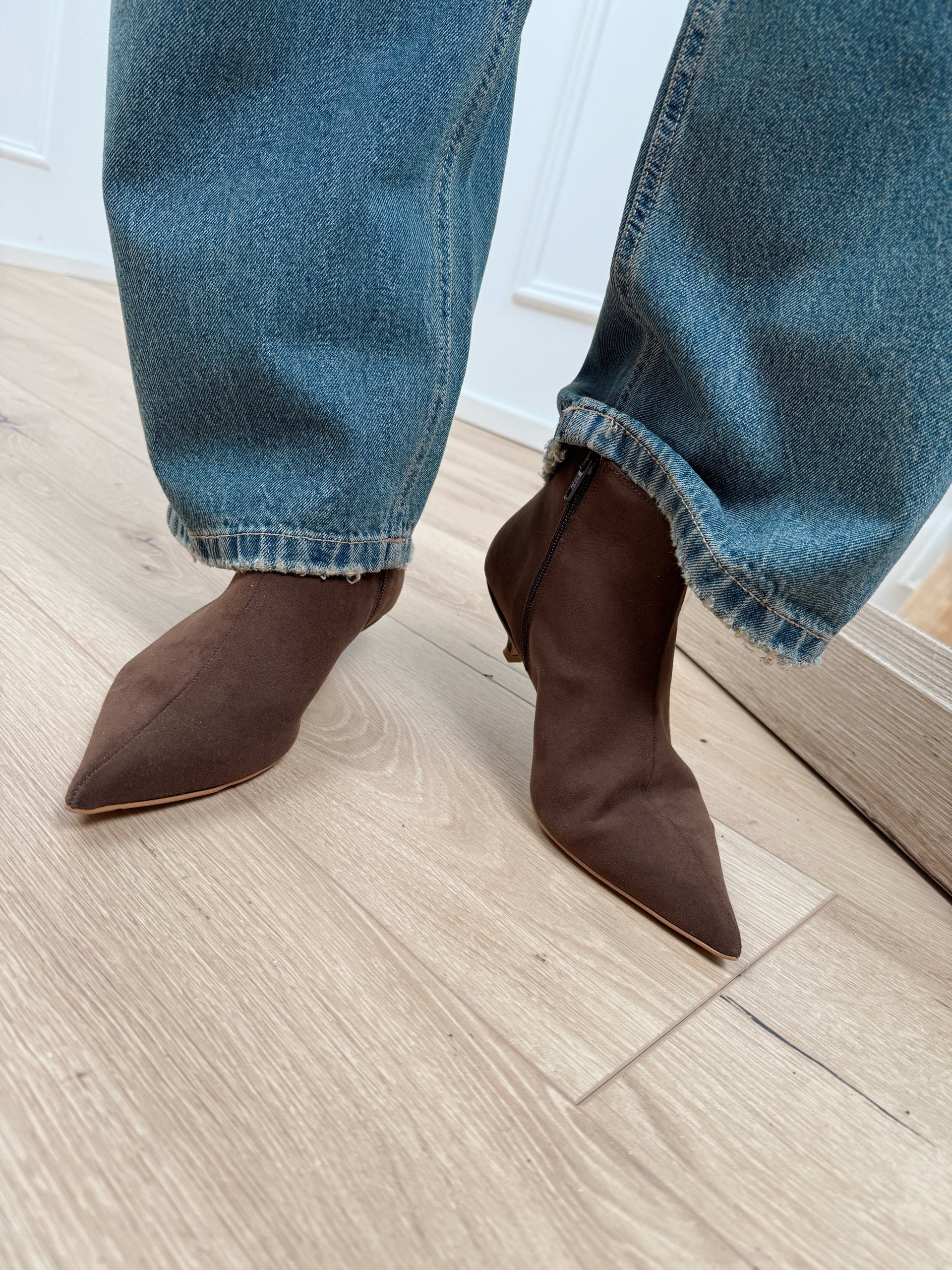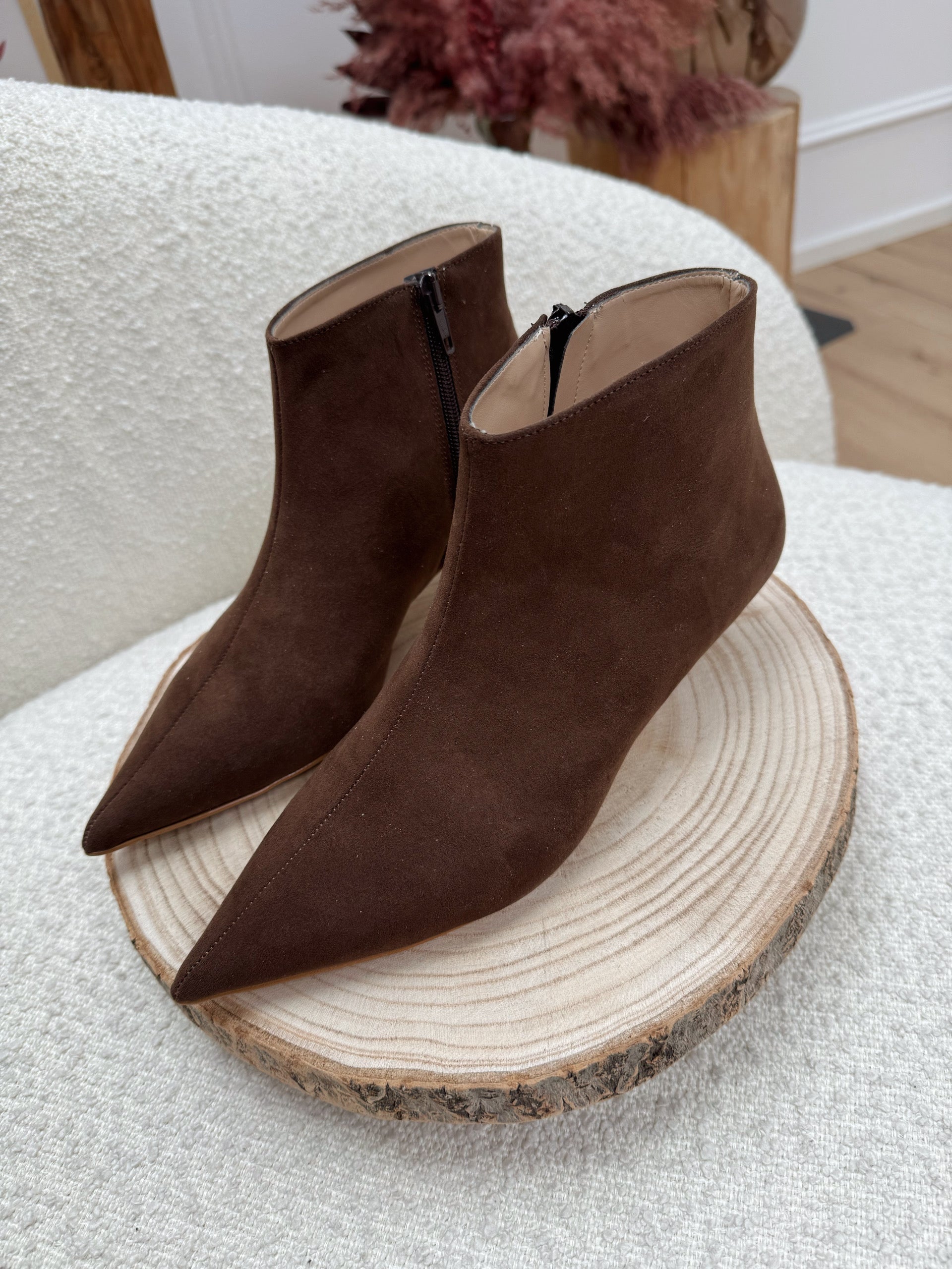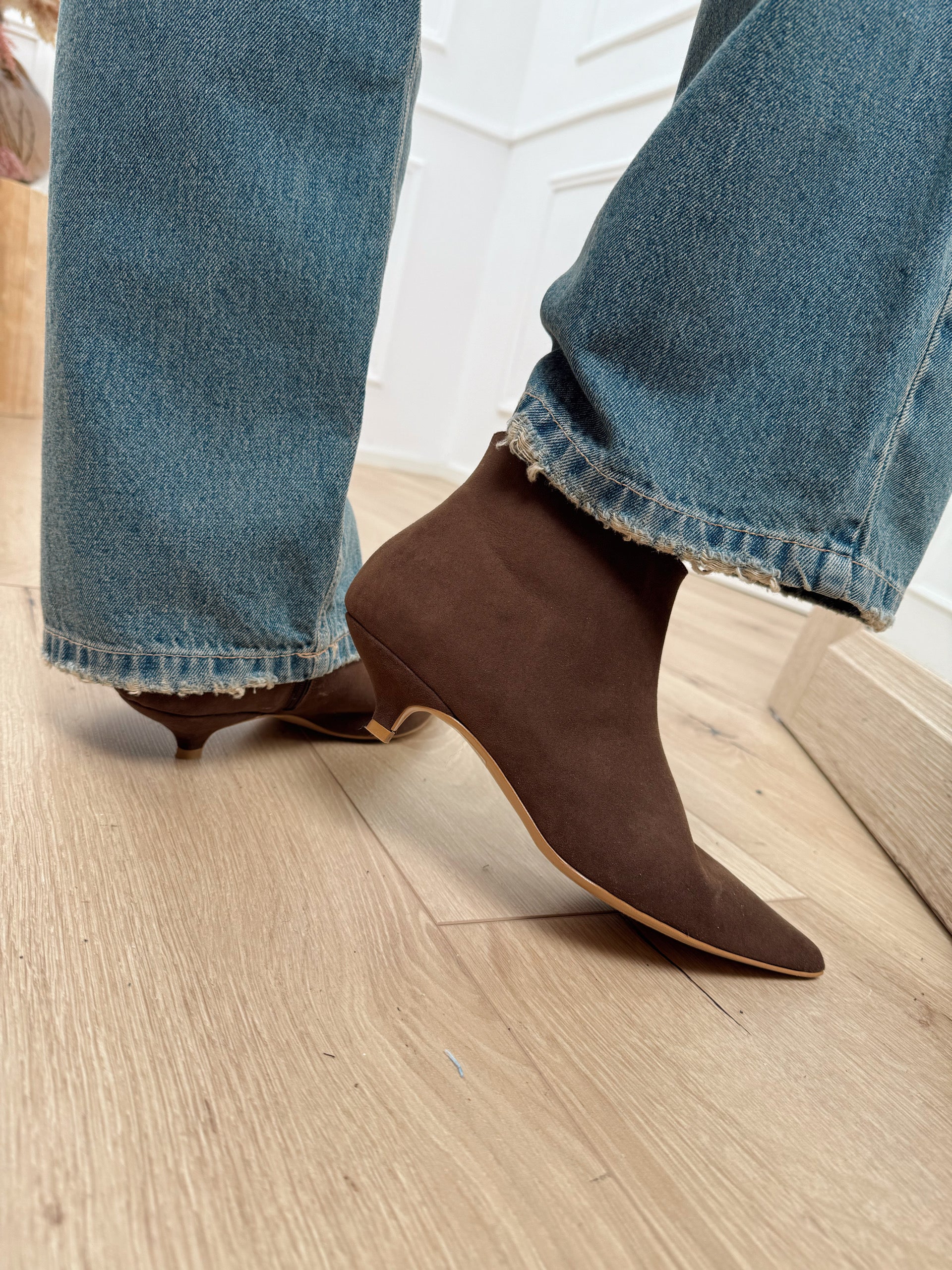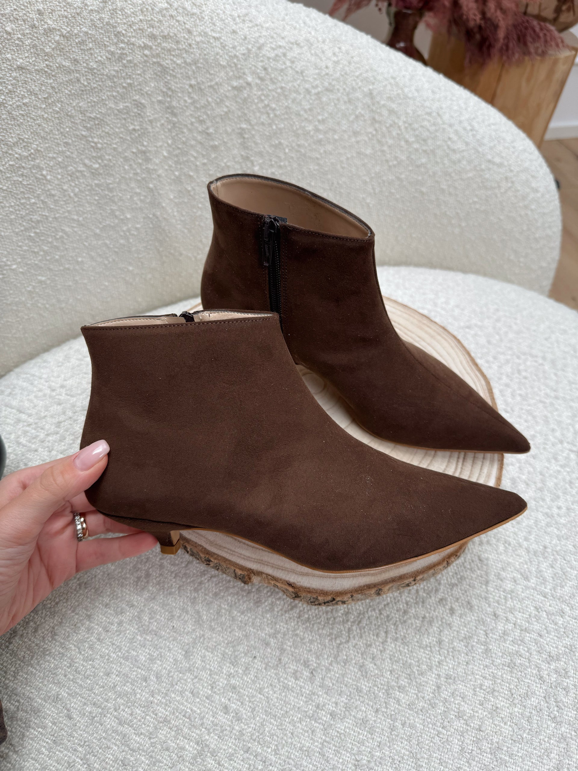 Stivaletto in suede color moro. Modello tronchetto basso alla caviglia, a punta con tacco basso e chiusura zip laterale.