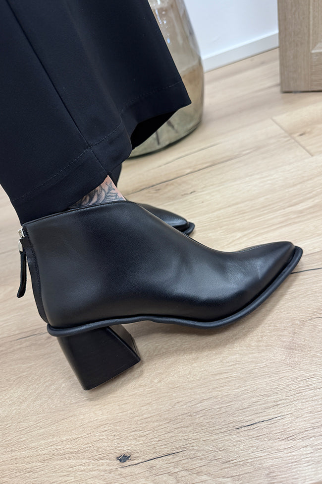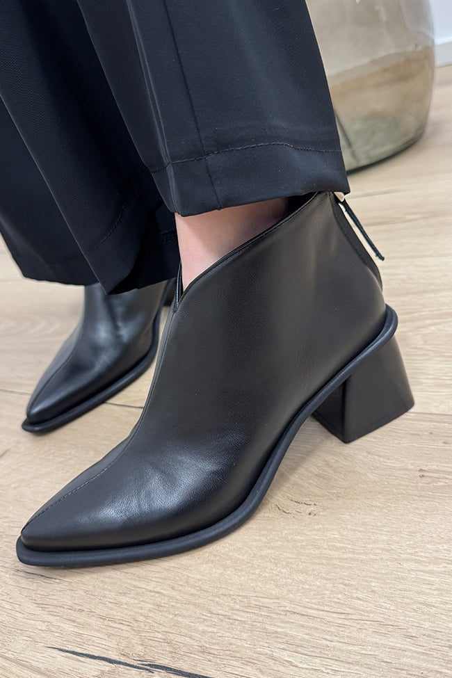 Stivaletto Jane color nero in pelle liscia Ovyè. Modello a punta con tacco largo e inclinato, altezza caviglia con scollo a v. Chiusura con zip sul retro.