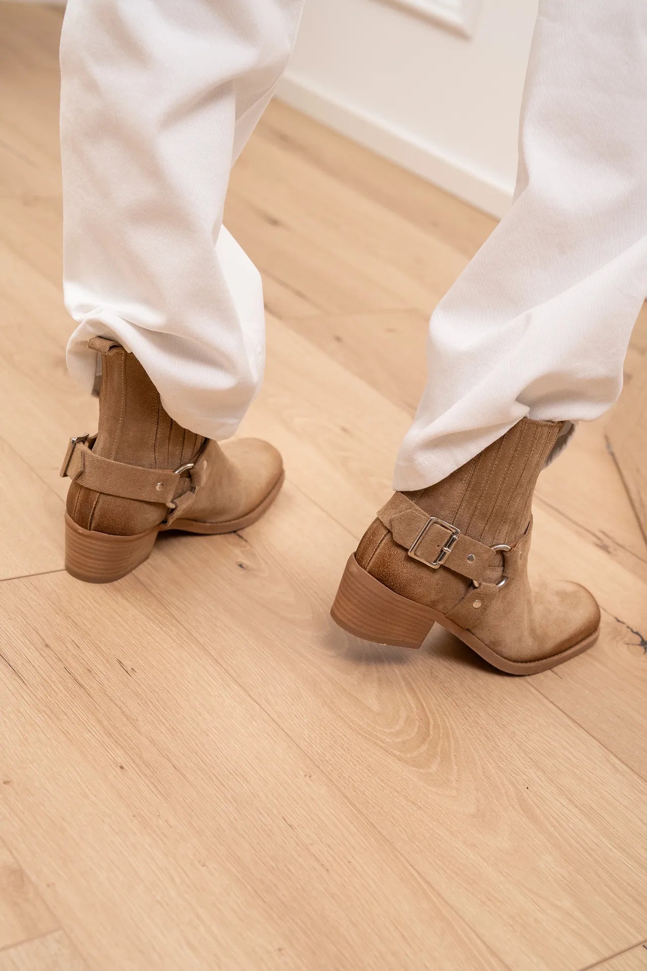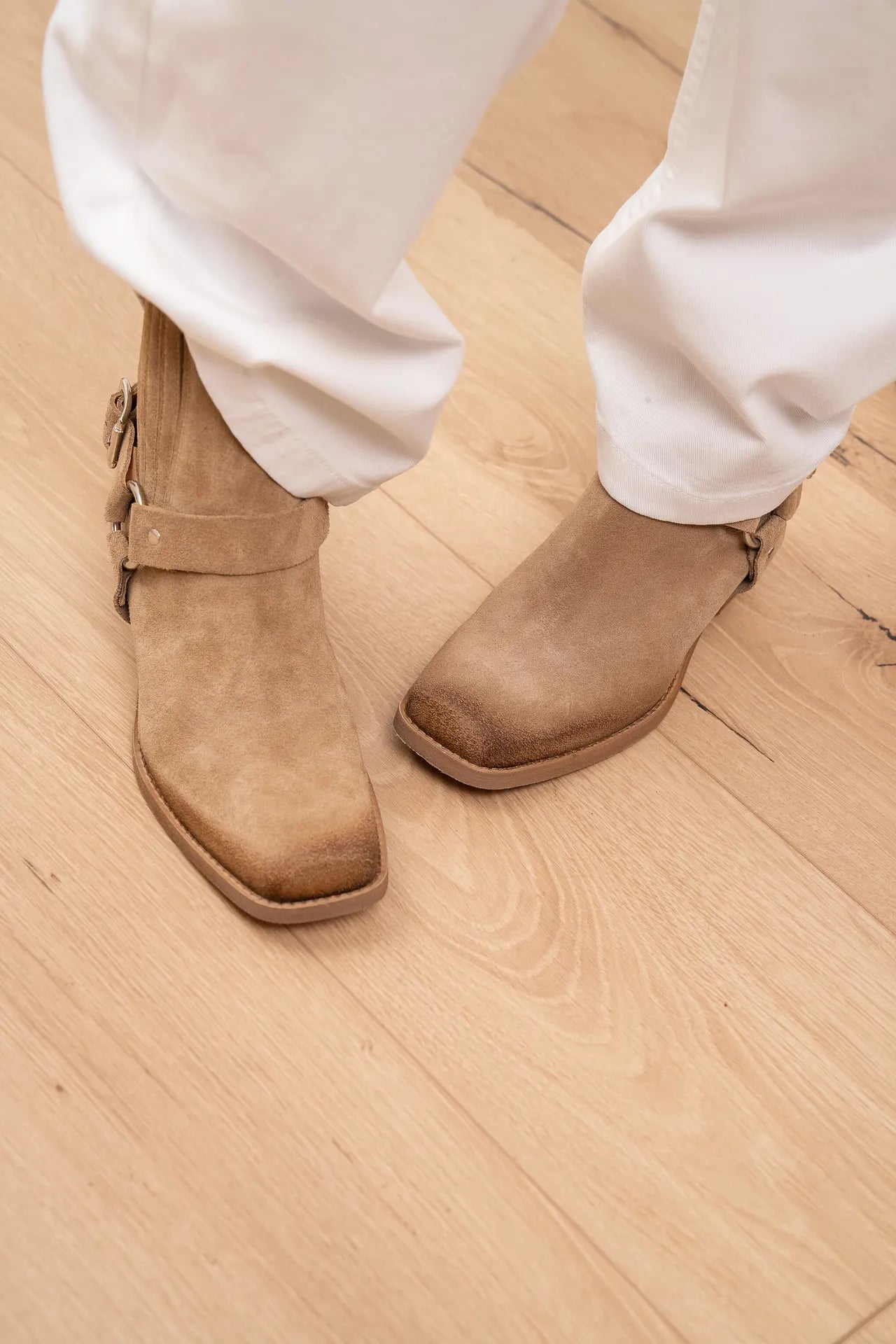Stivaletto in suede color deserto. Modello punta squadrata gambale media altezza. Dettaglio di anello.