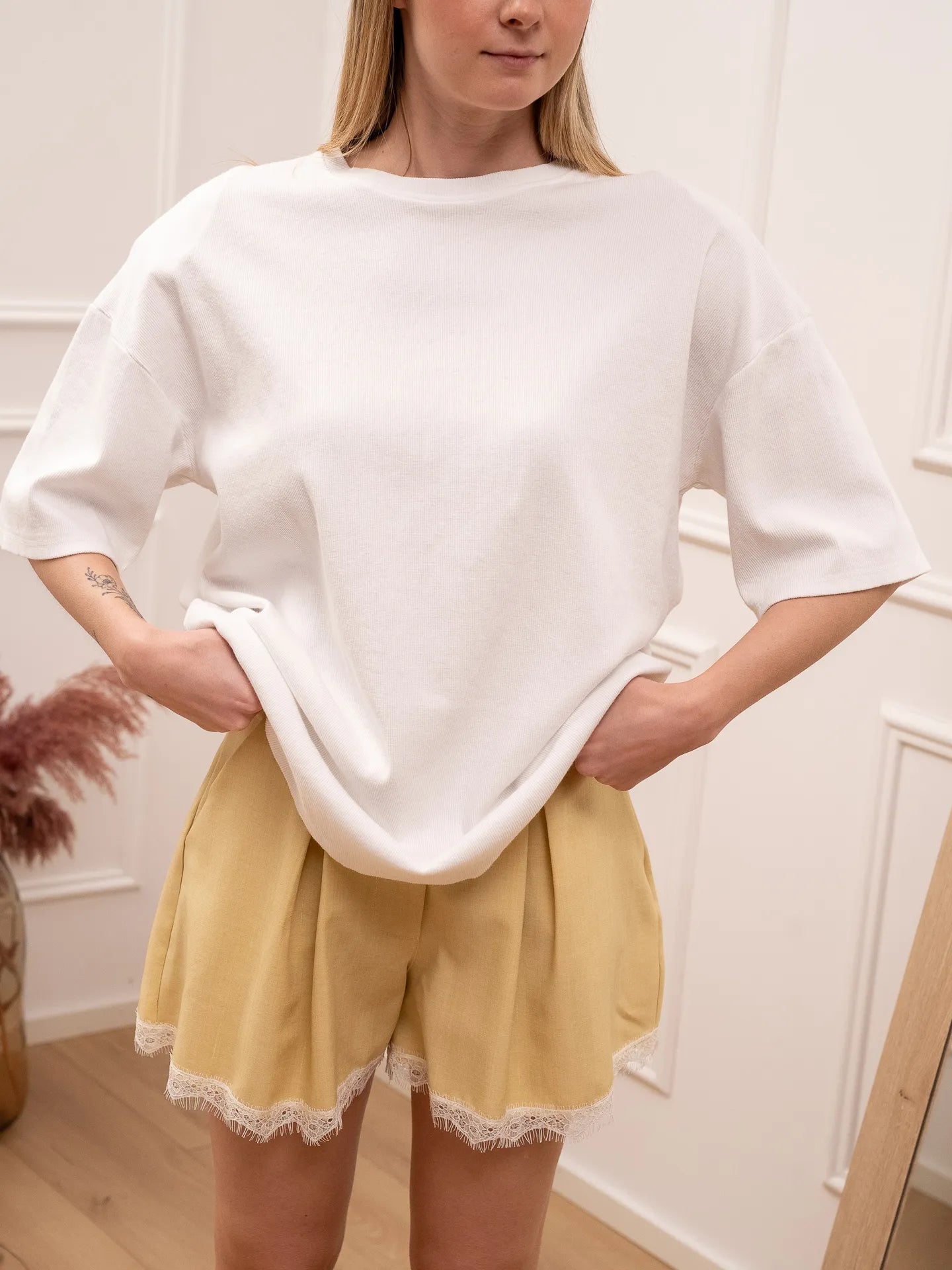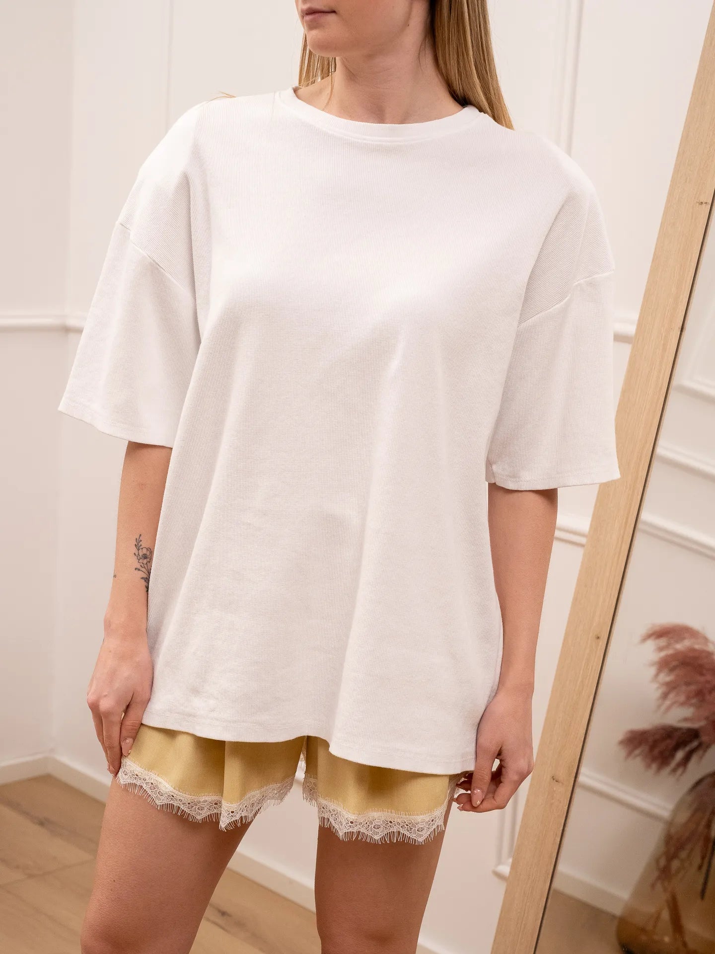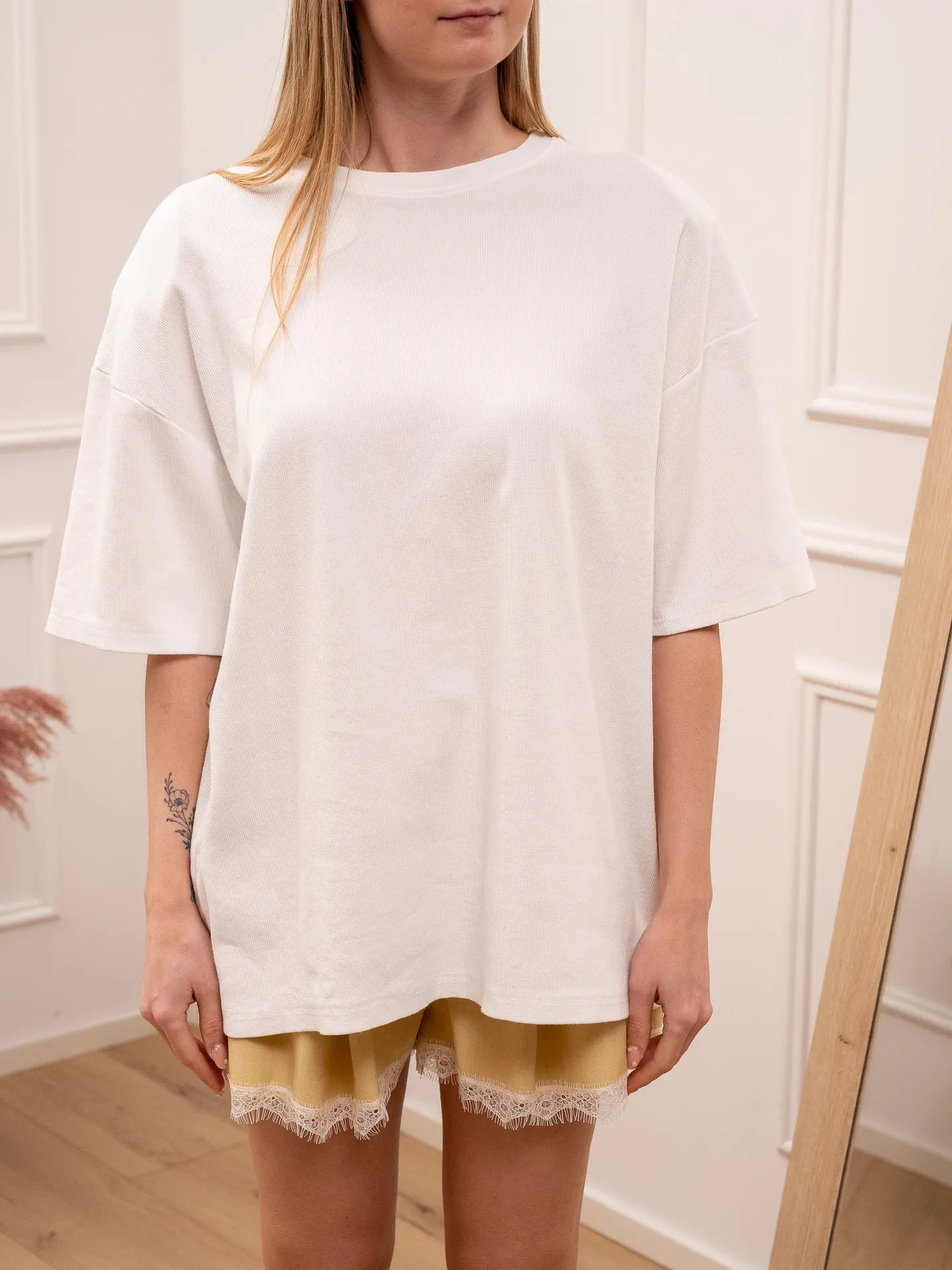 T shirt a costine color bianco HaveOne. Modello girocollo a mezza manica. Fit oversize con maxi spalline.
