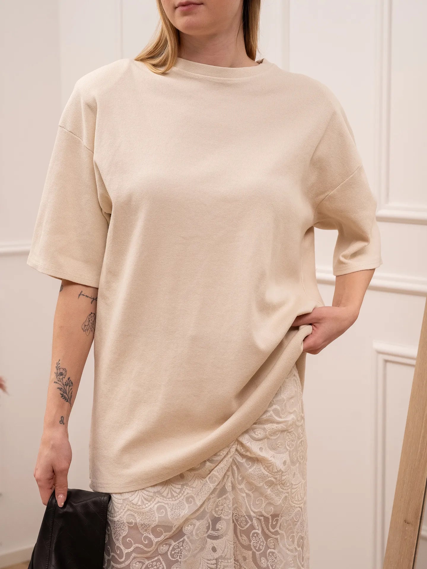 T shirt a costine color burro HaveOne. Modello girocollo a mezza manica. Fit oversize con maxi spalline.