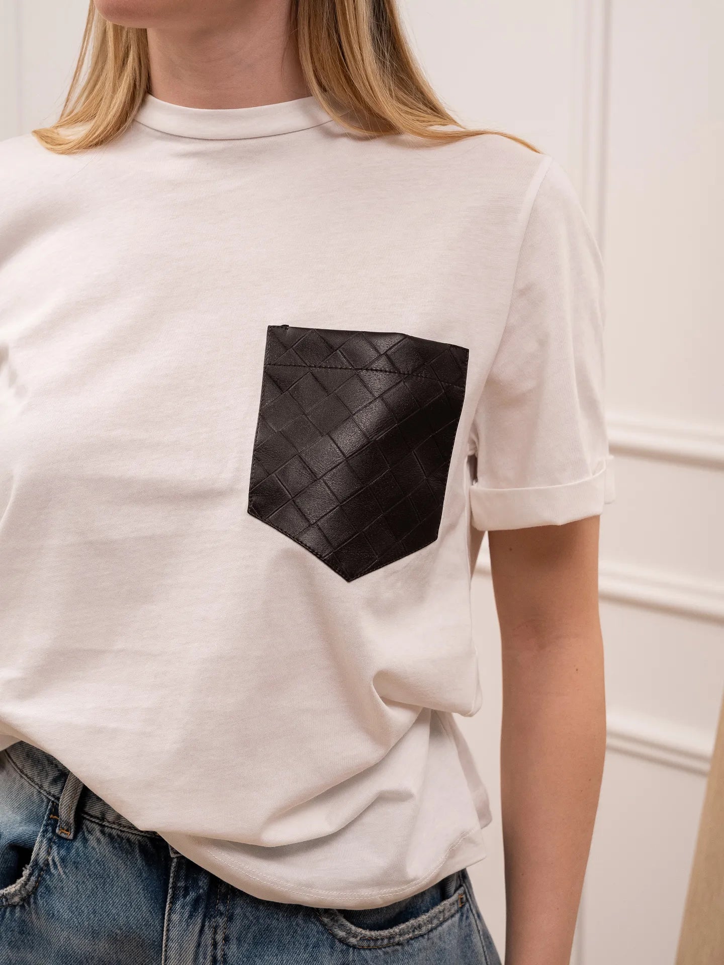 T shirt color bianco Tensione In. Modello girocollo a manica corta. Fit regolare con dettaglio di tasca in ecopelle intecciata color moro.