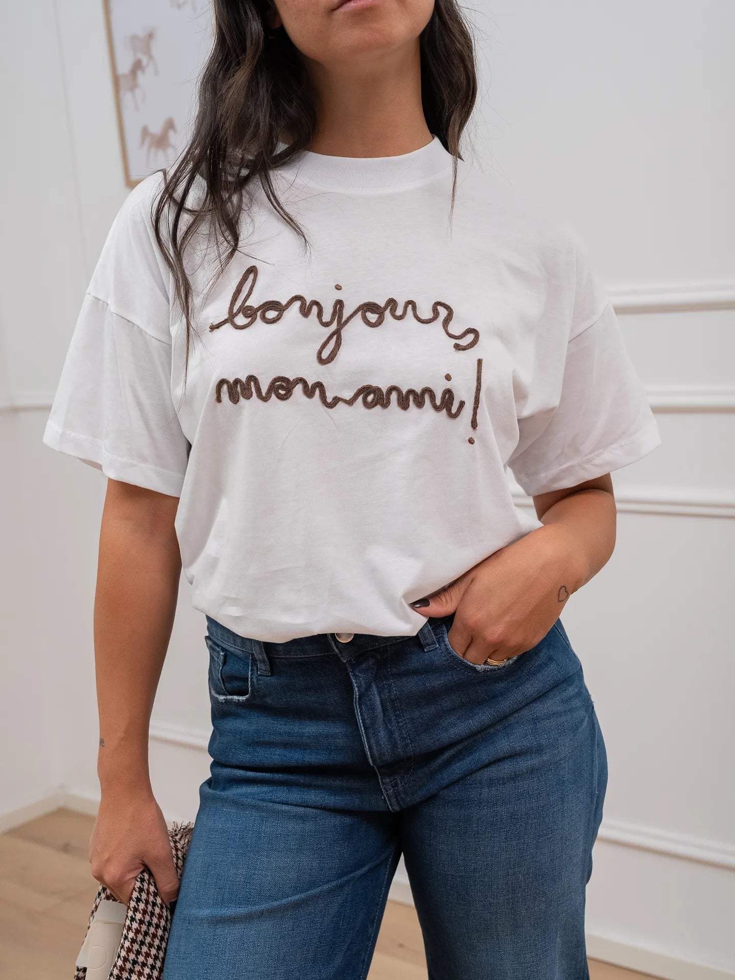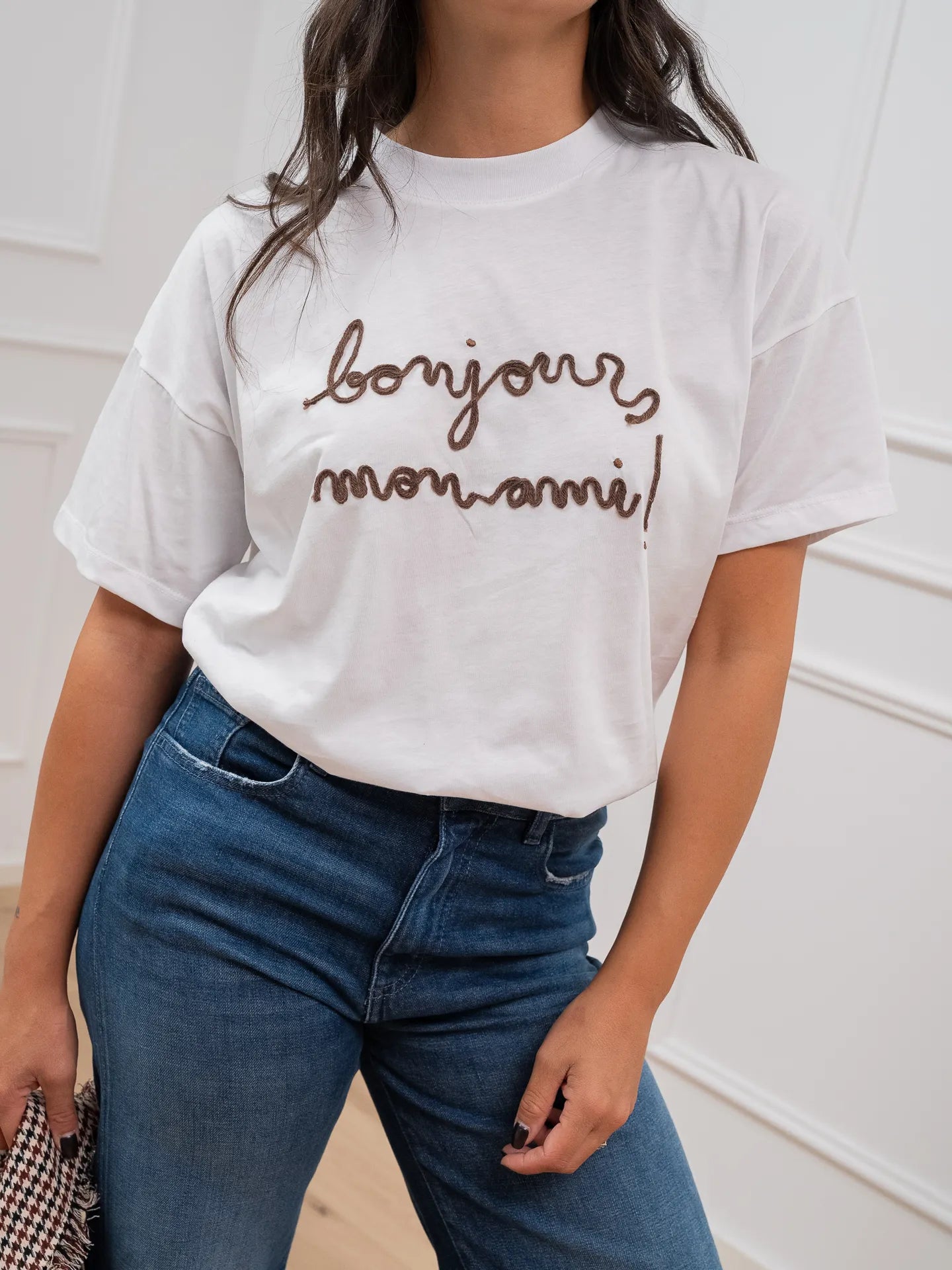 T shirt "Bonjour mon ami" ricamata moka - Vicolo