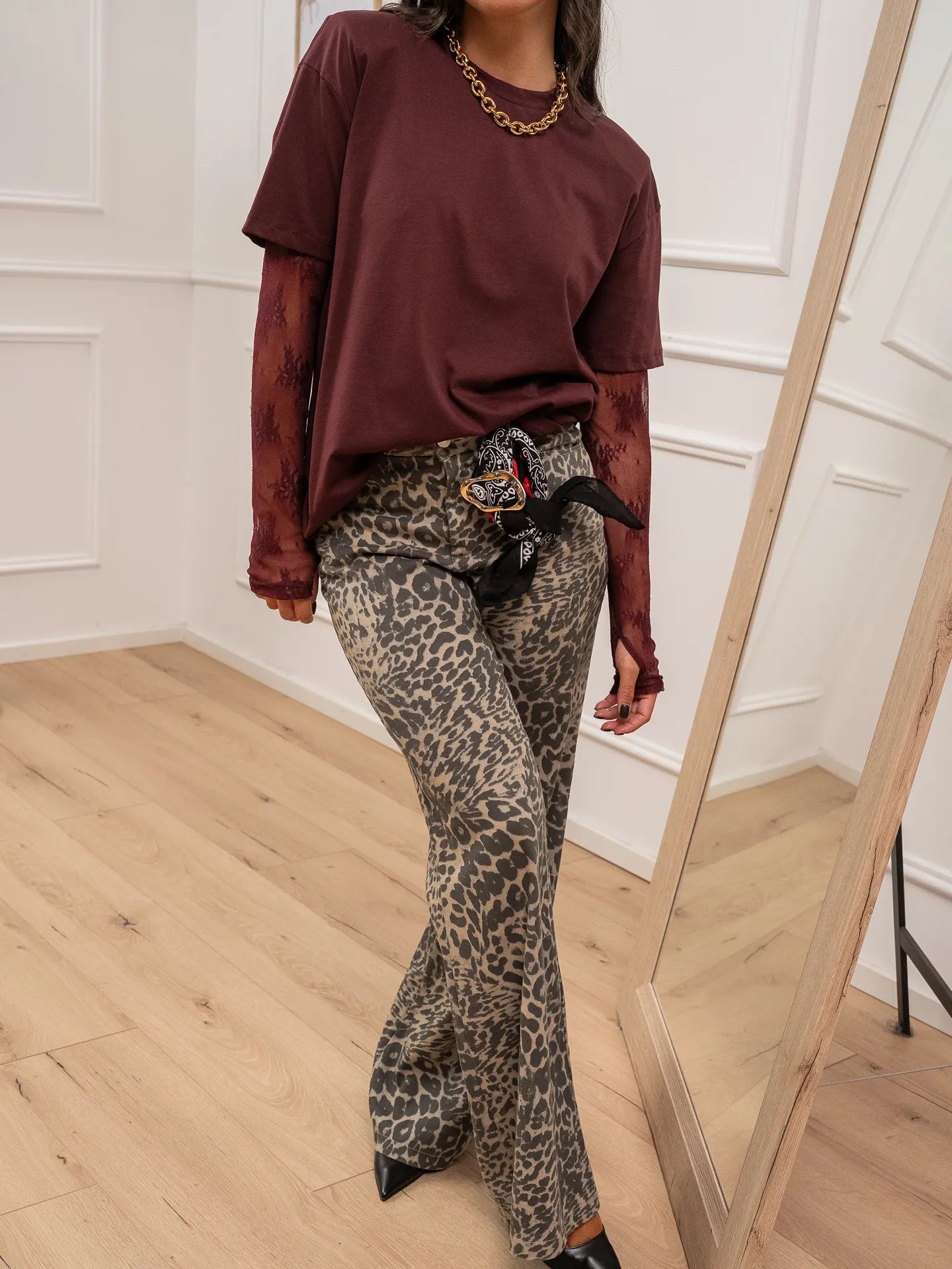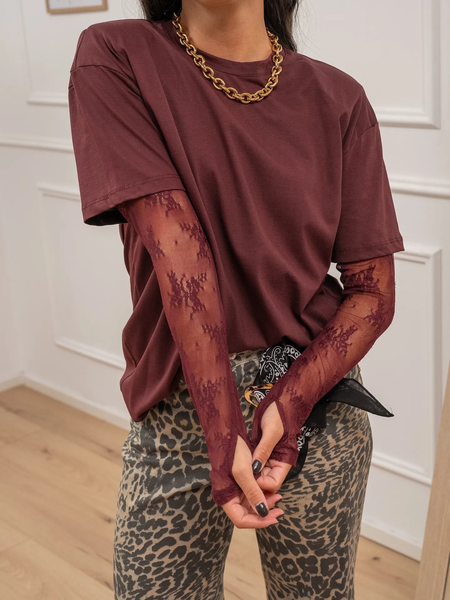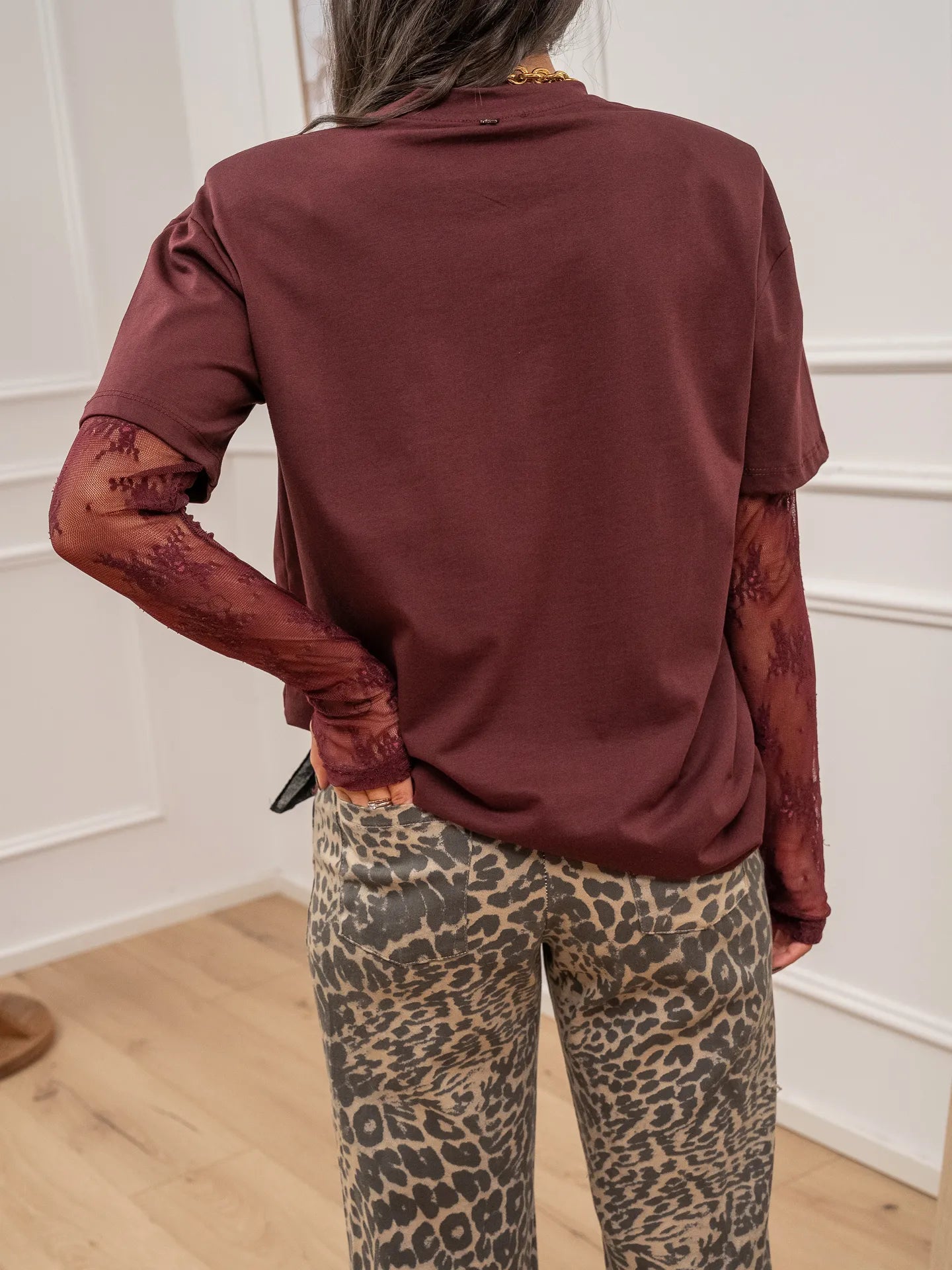 T shirt color bordeaux Dixie. Modello fit regolare girocollo a mezza manica con manicotto in pizzo.