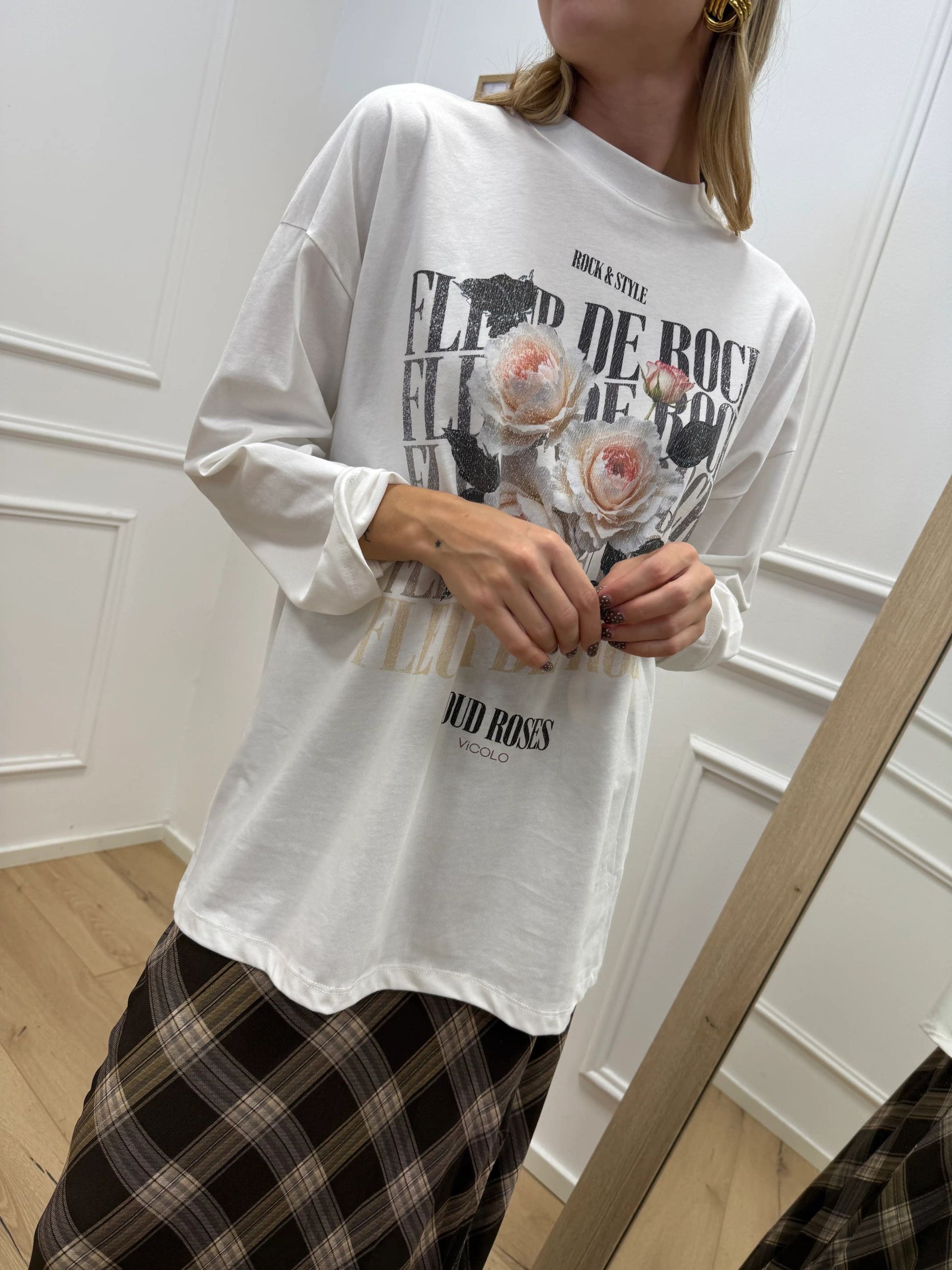 T shirt Fleur bianca Vicolo. Modello fit oversize girocollo a manica lunga. Stampa frontale Fleur con collo alto a manica lunga.
