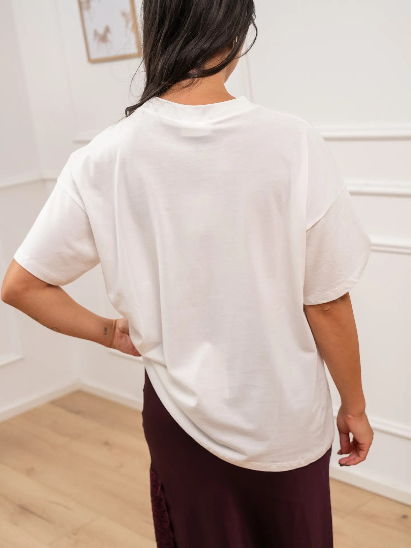 T shirt "Good vibes" color bianco Vicolo. Modello girocollo a manica corta. Dettaglio di scritta floccata frontale color bordeaux a contrasto.