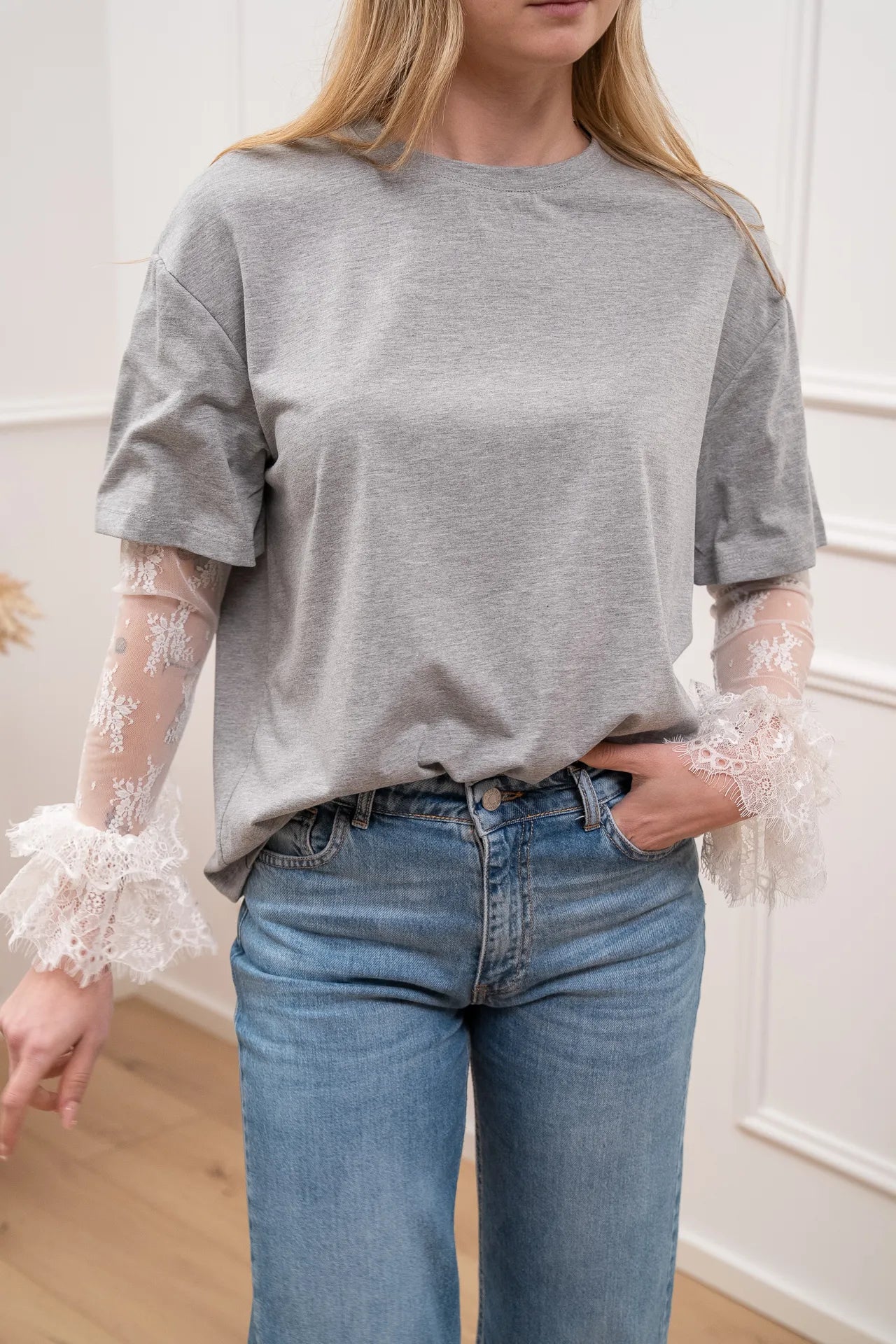 T shirt grigia con manica e polsino volant in pizzo - HaveOne