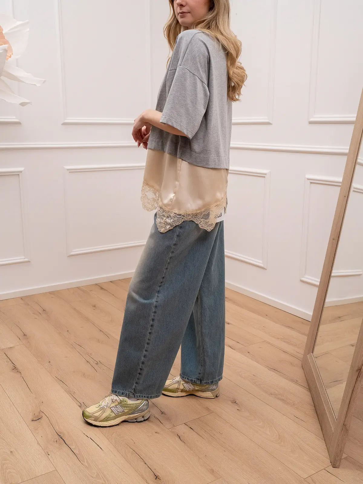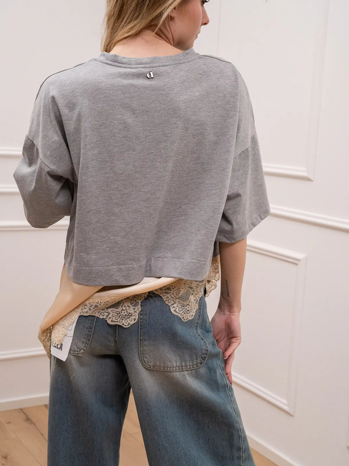 T shirt color grigio Dixie. Modello girocollo a mezza manica con dettaglio di fondo in satin e pizzo burro a contrasto.