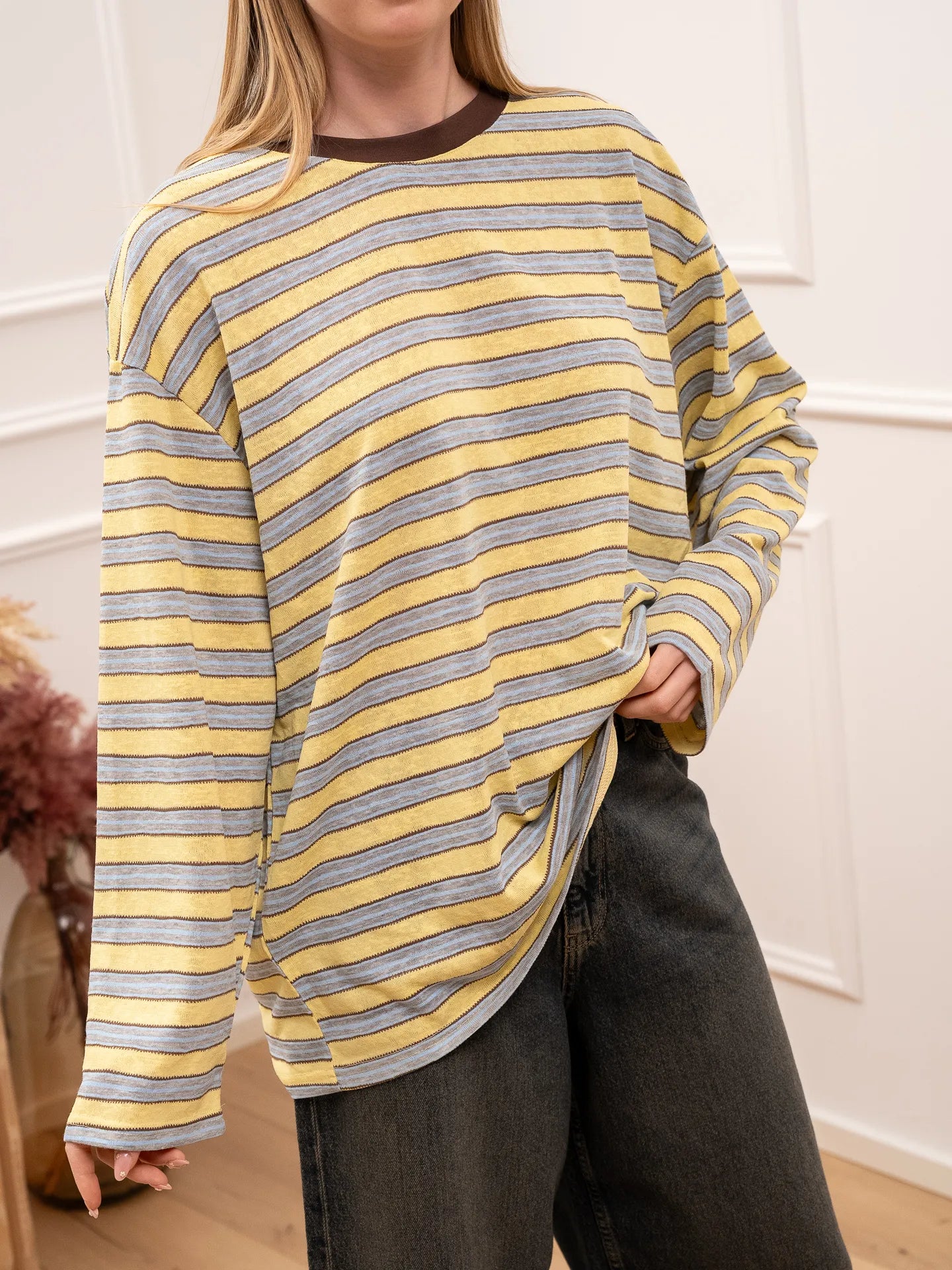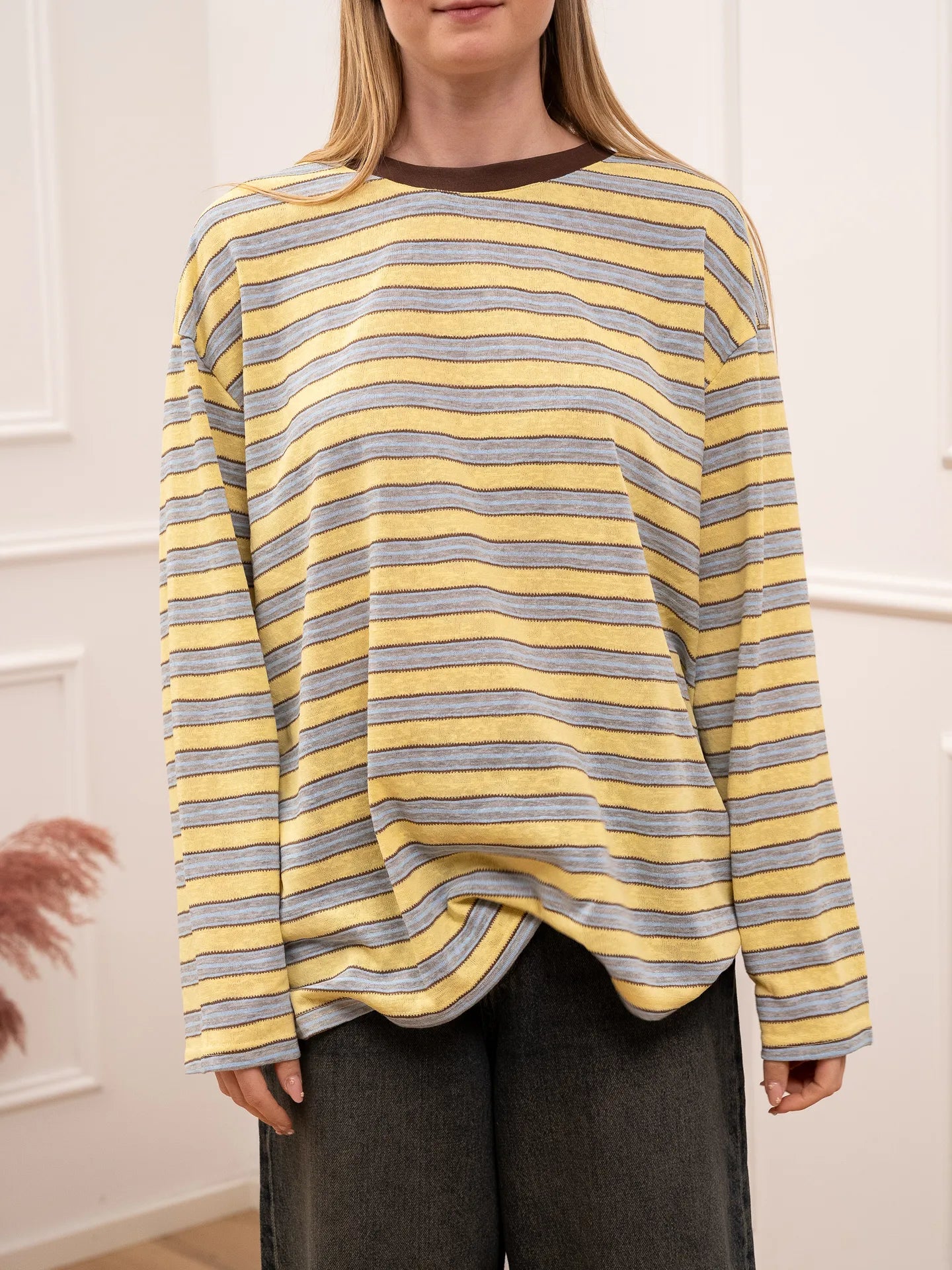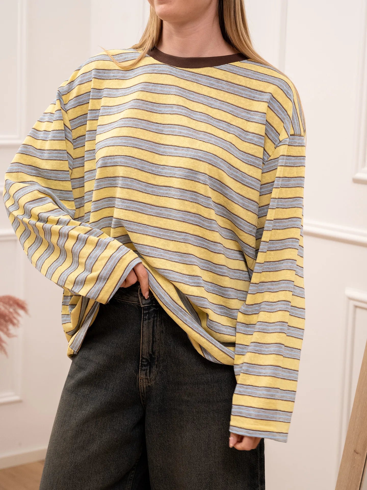 T shirt multi stripe giallo e celeste Crispy. Modello girocollo a manica lunga, fit oversize.