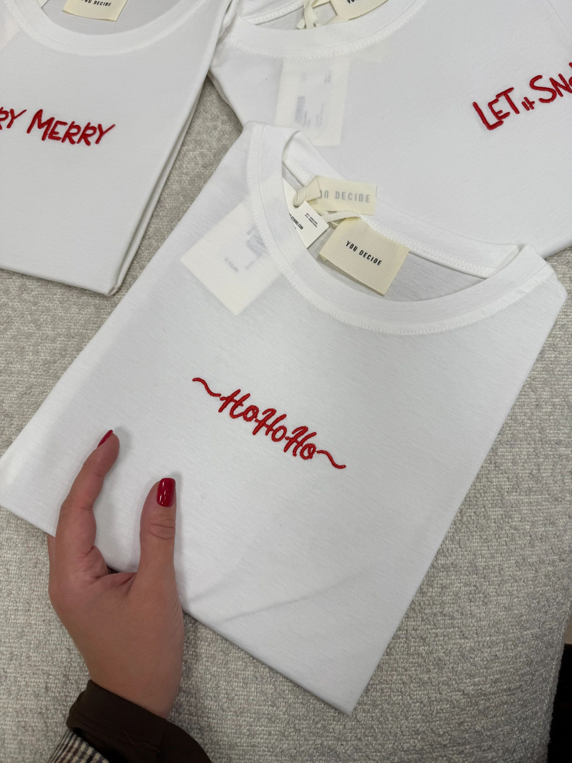 T shirt color bianco You Decide. Modello girocollo a mezza manica, dettaglio di ricamo color rosso a contrasto "Hohoho".