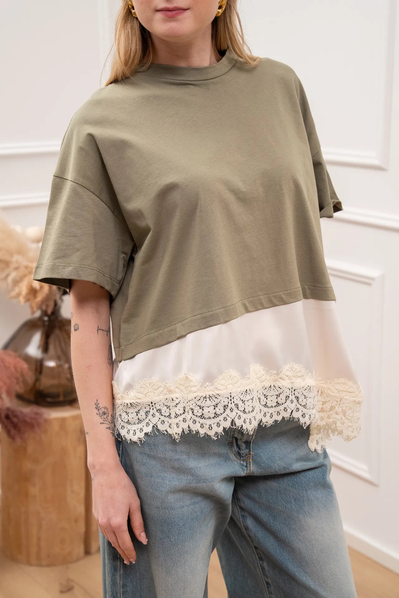 T shirt salvia con satin e pizzo sul fondo - Dixie