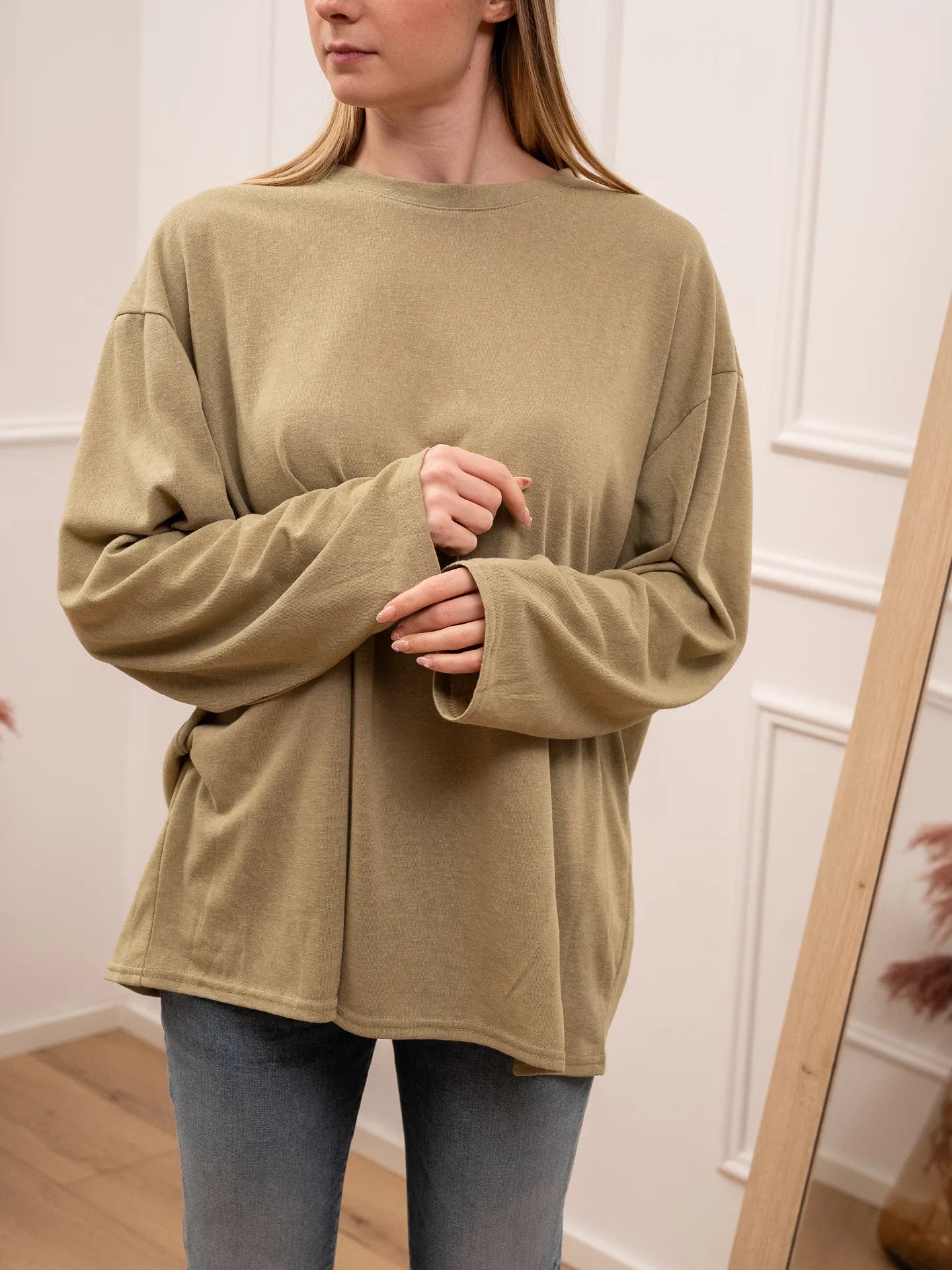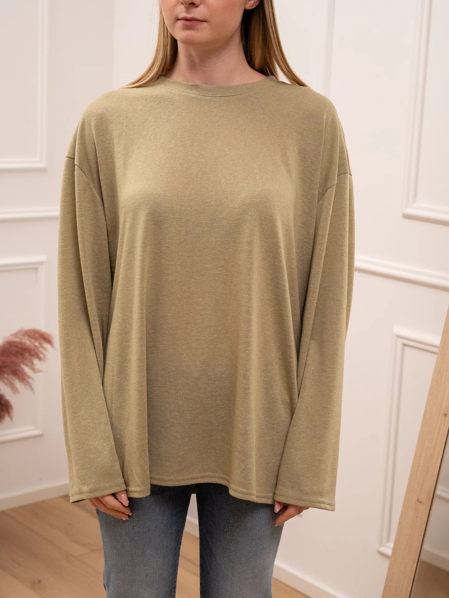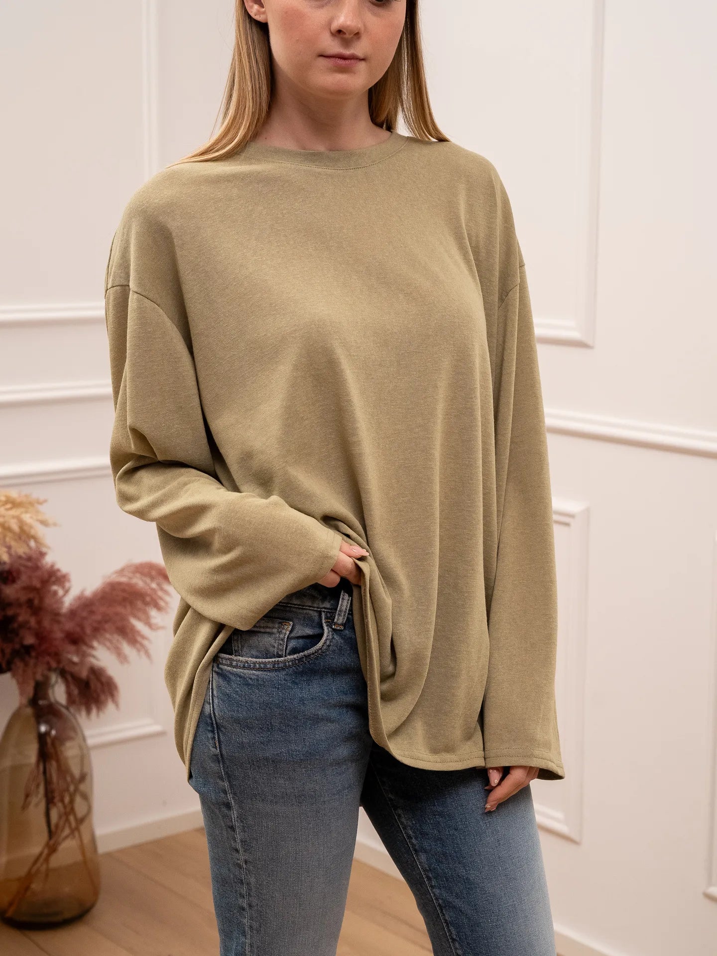 T shirt vedo non vedo color militare Crispy. Modello fit oversize girocollo a manica lunga.
