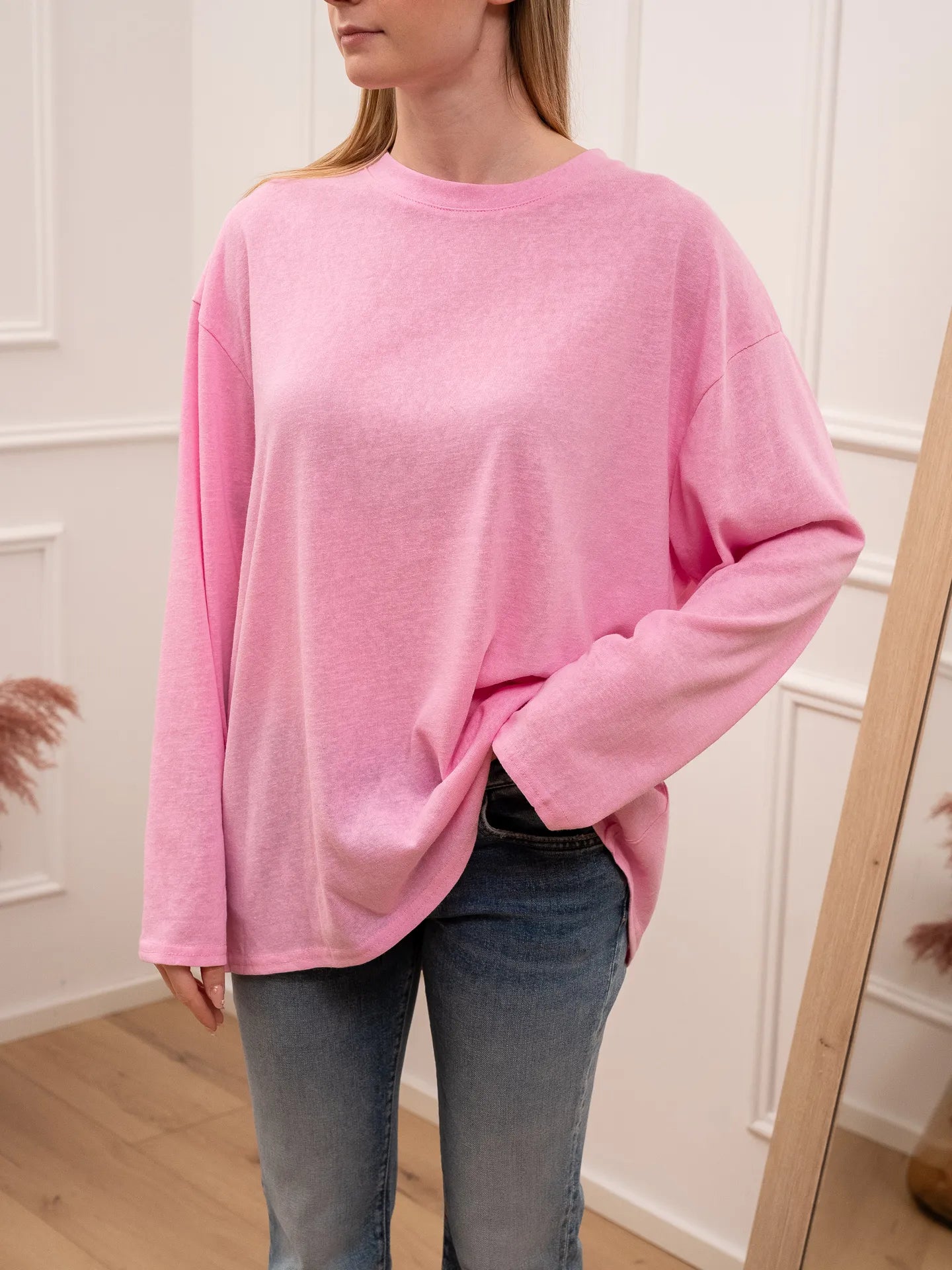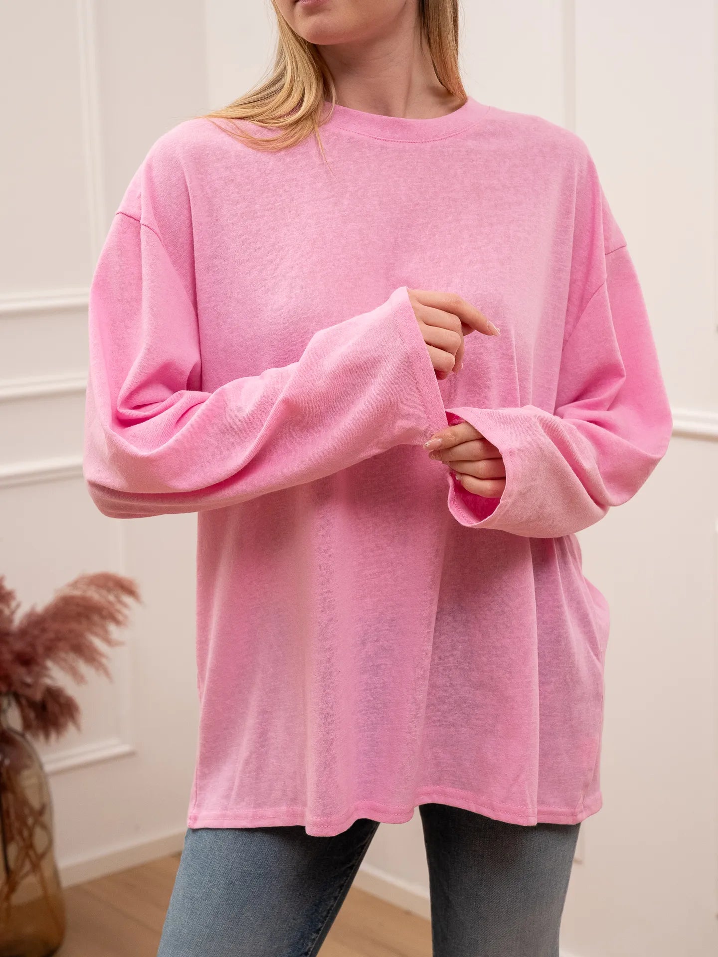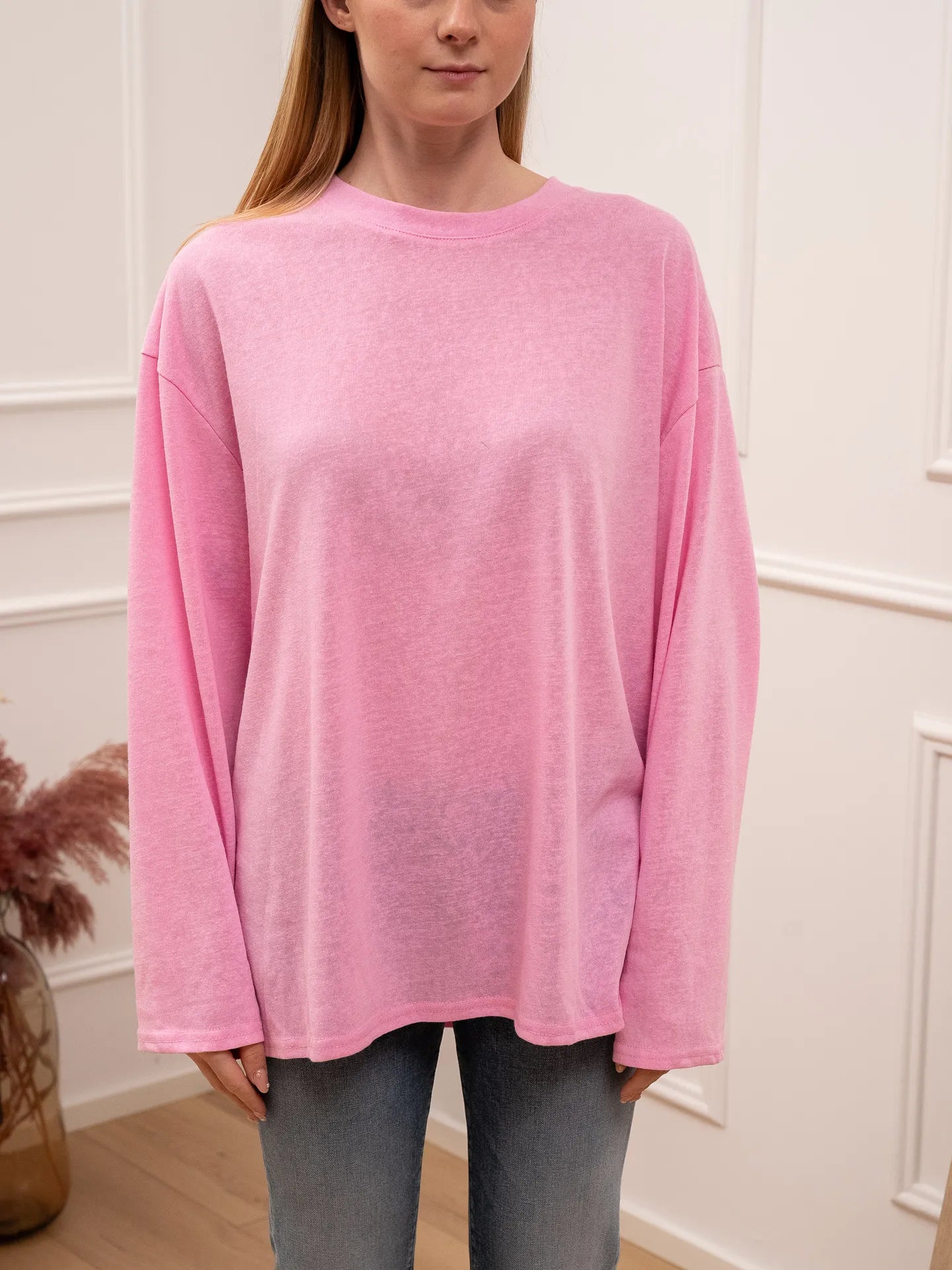 T shirt vedo non vedo color rosa Crispy. Modello fit oversize girocollo a manica lunga.