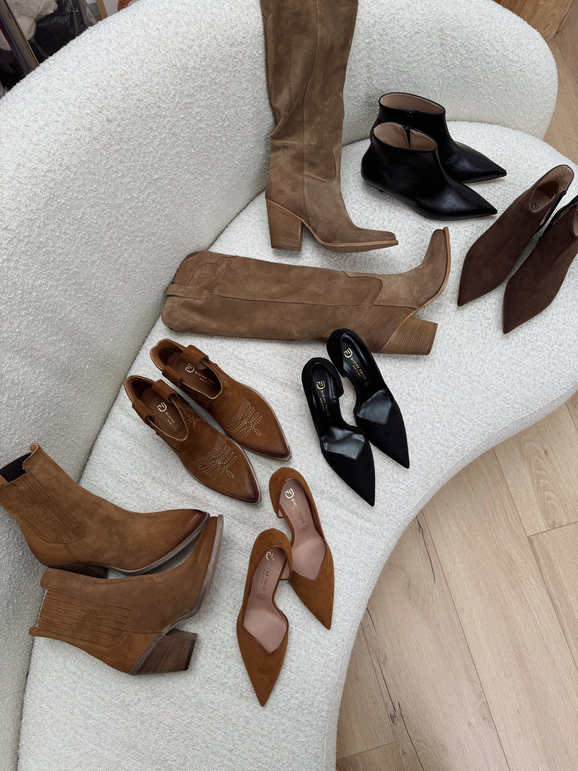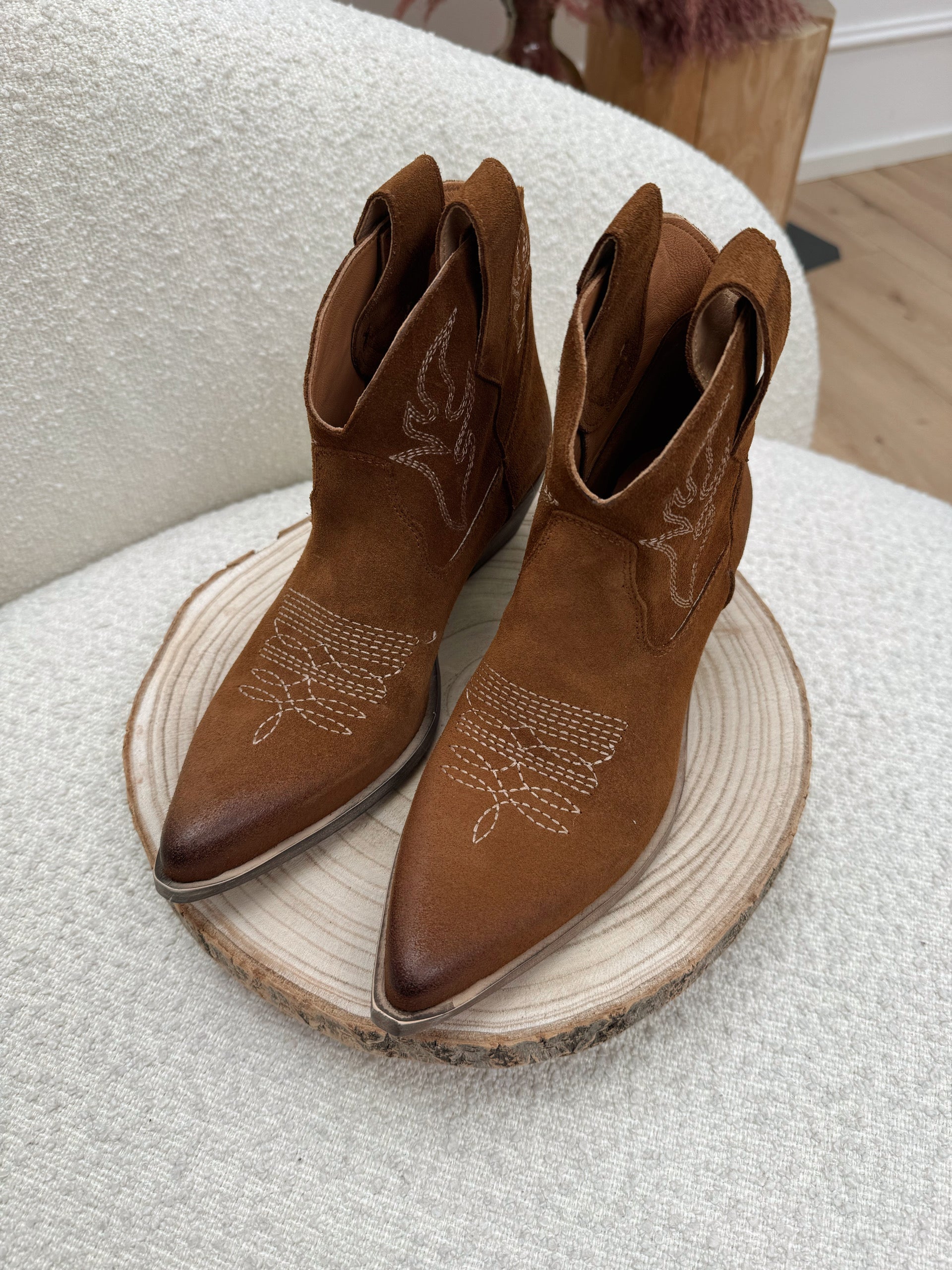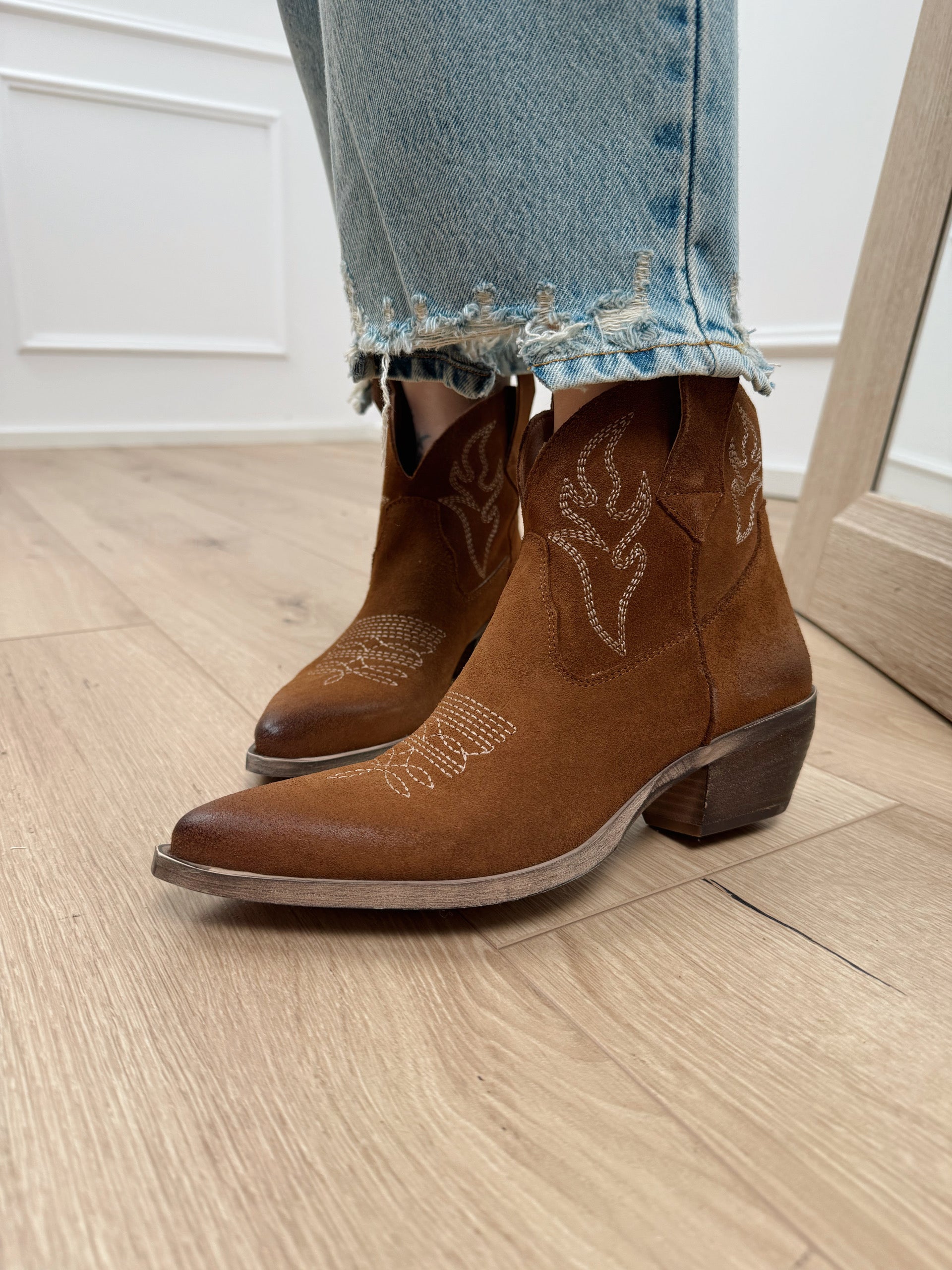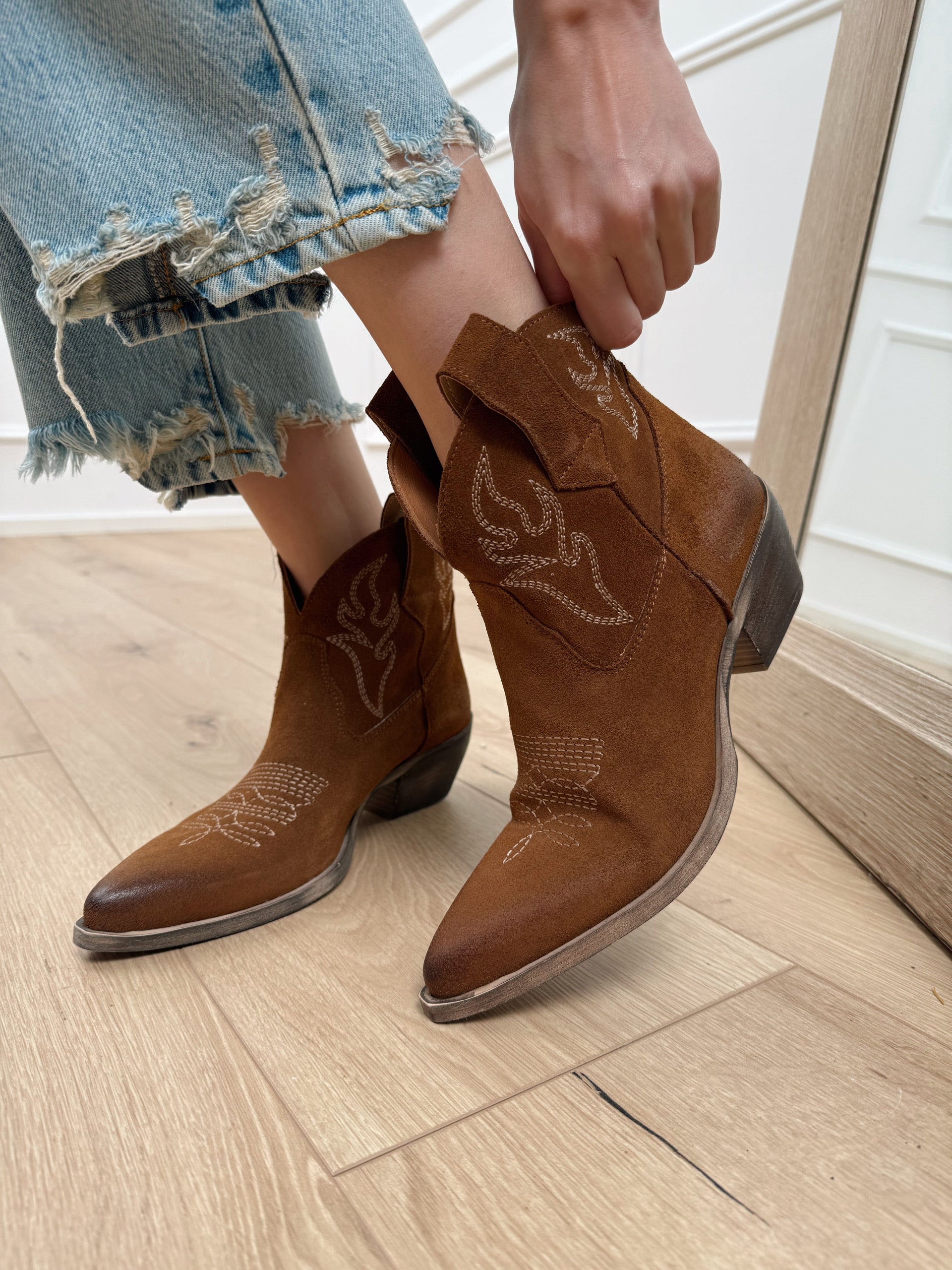 Texano color arabica Divine Follie. Modello gambale e tacco basso. Dettaglio di ricami a contrato.