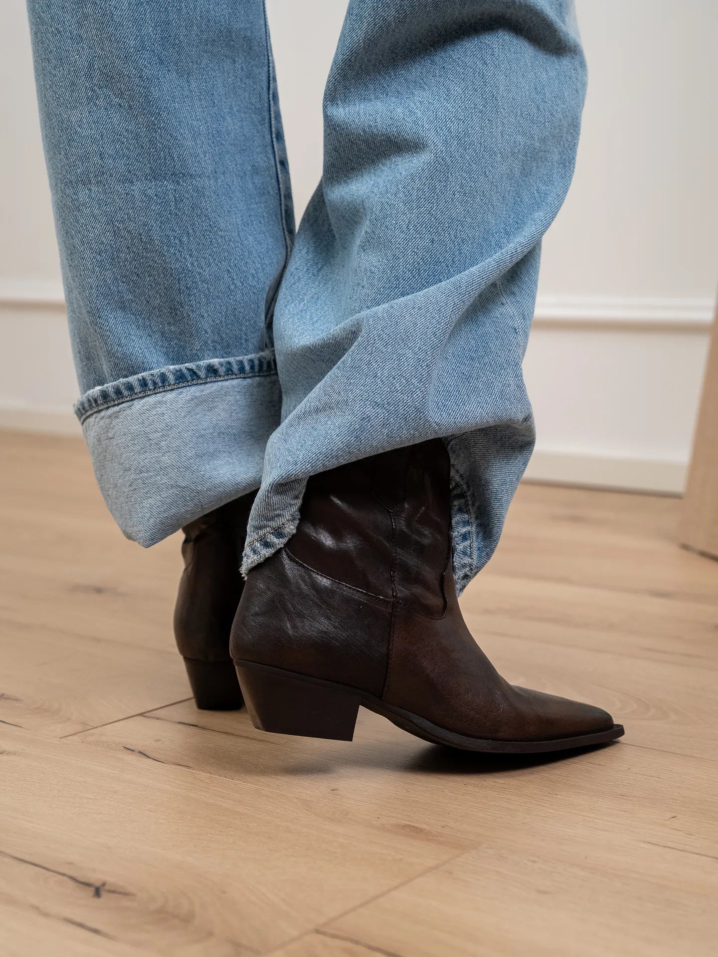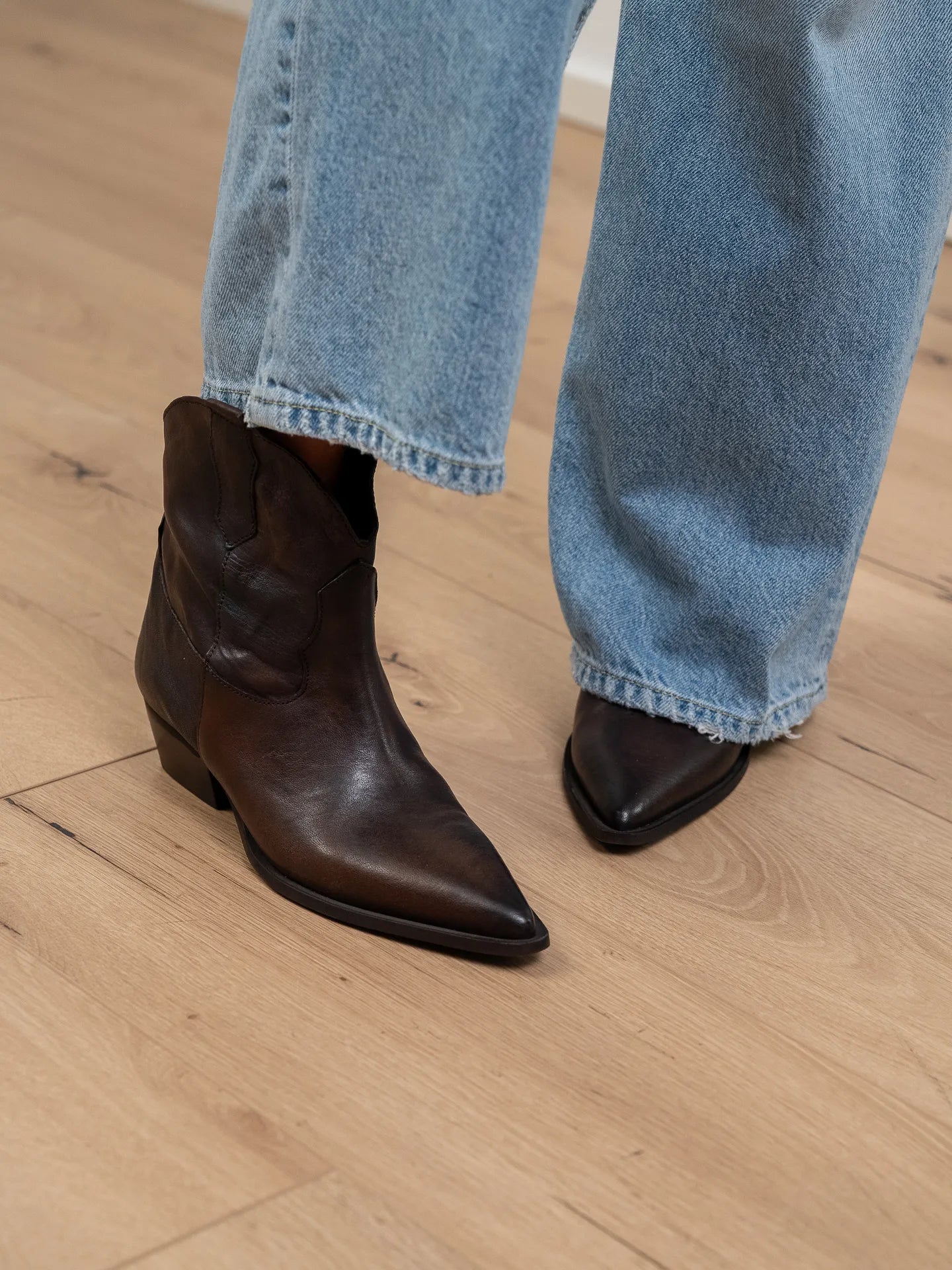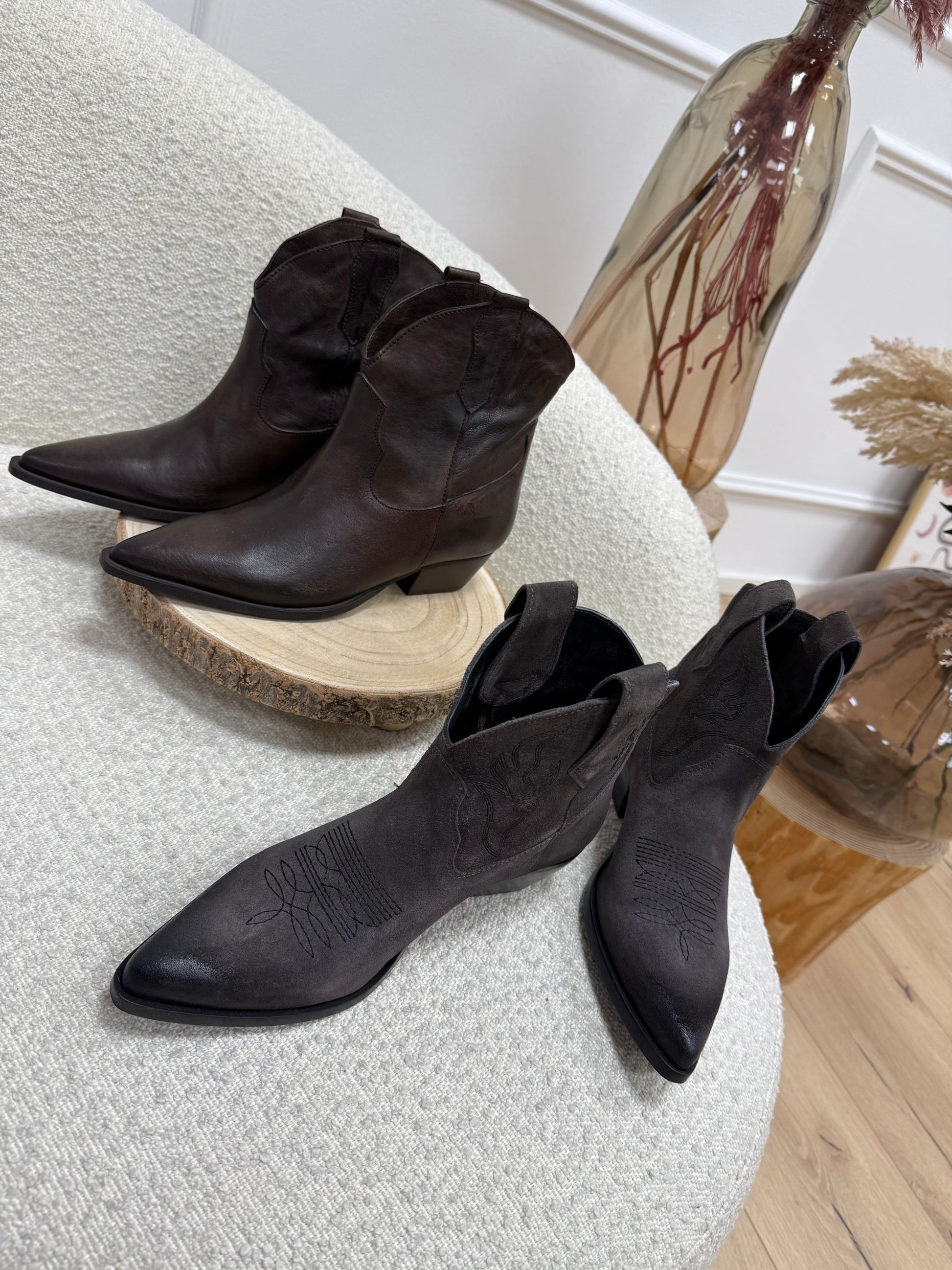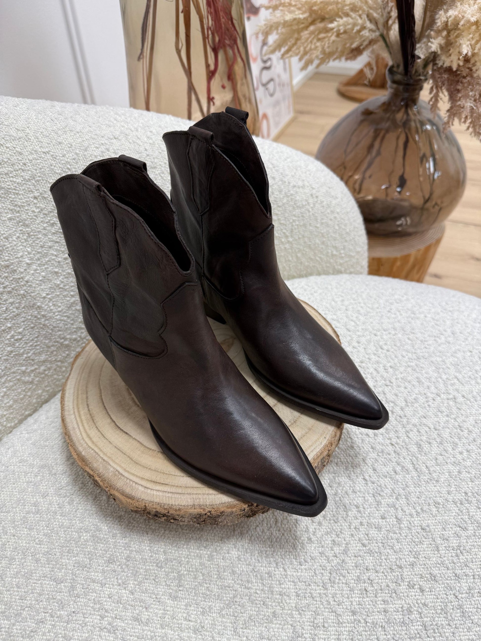 Texano color moro in pelle oyster Divine Follie. Modello basso a punta con tacco rettangolare.