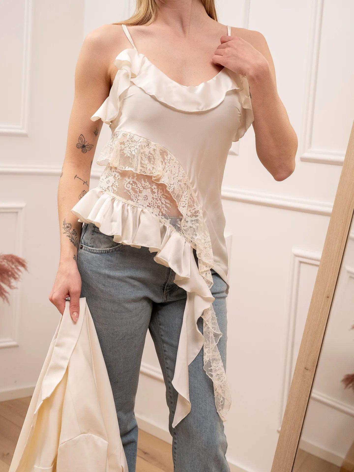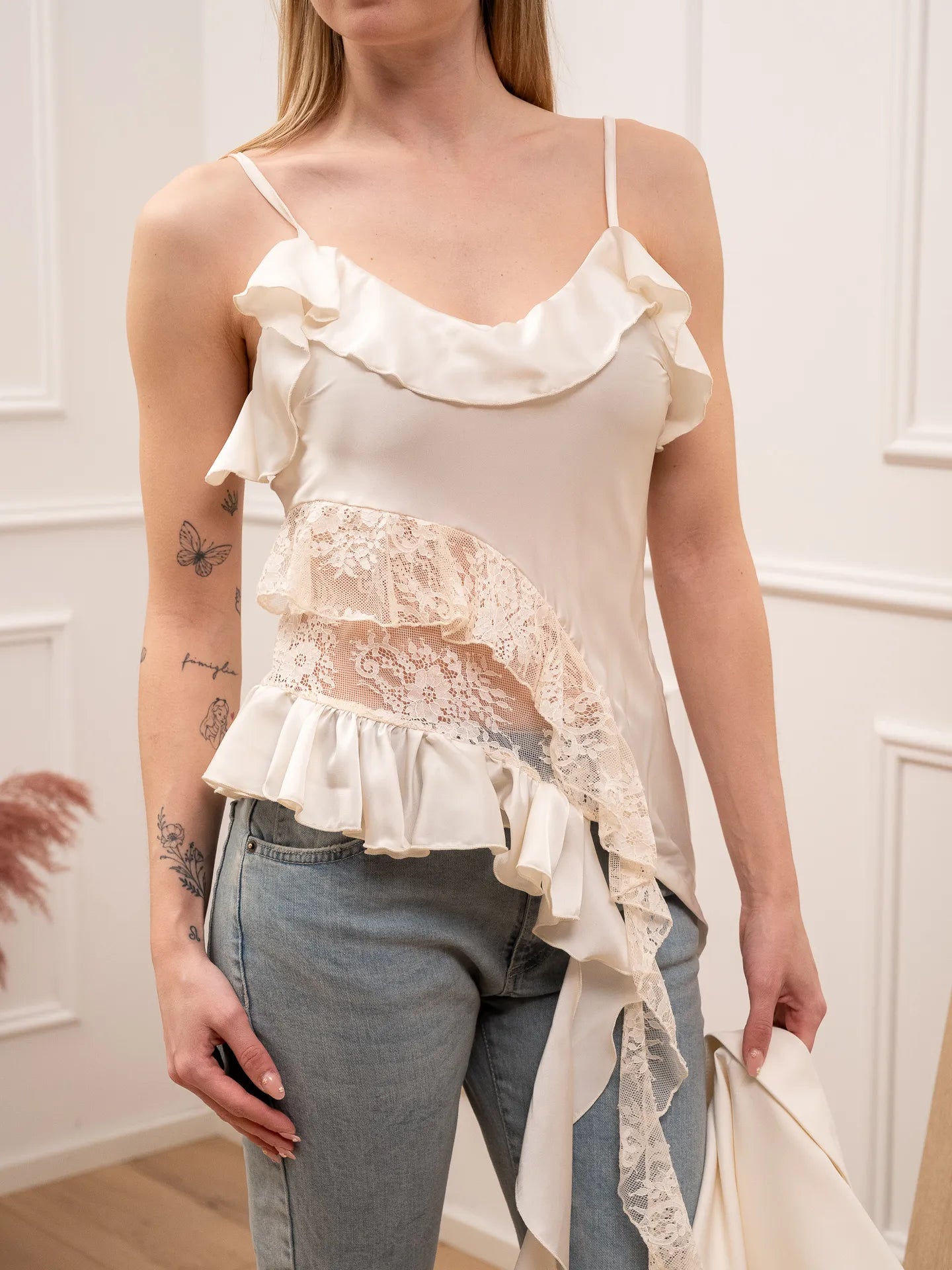 Top asimmetrico color burro HaveOne. Modello scollo a v e spalline sottili regolabili. Dettagli in pizzo e gale laterali.