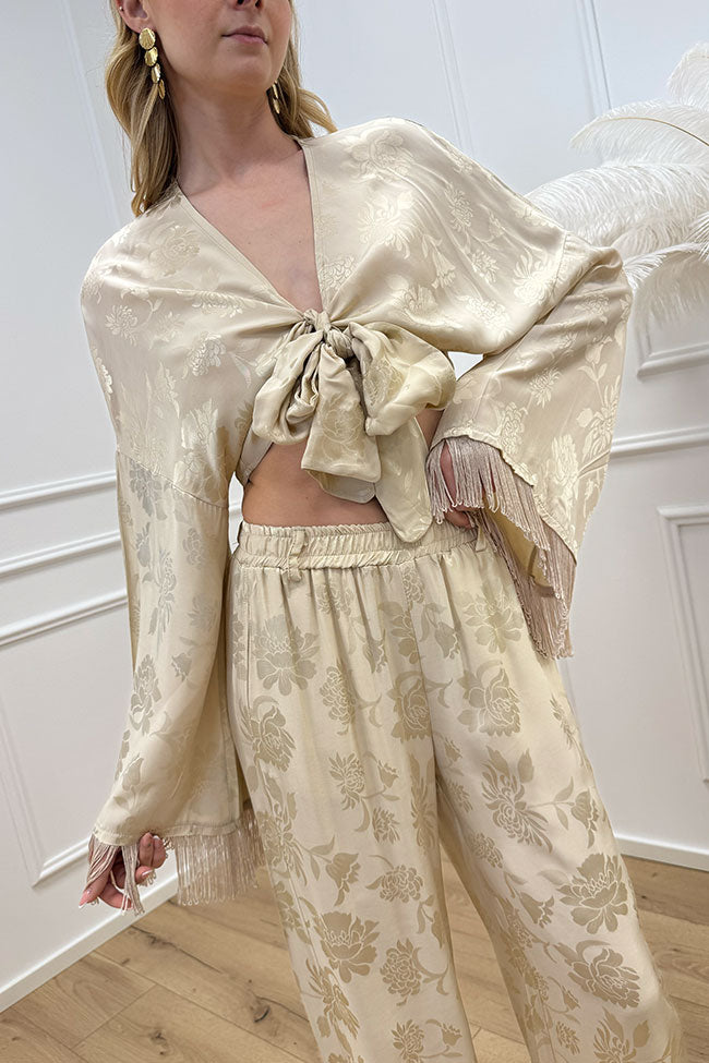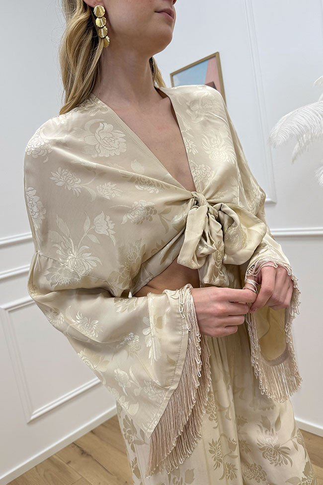 Top beige fiori spalmati con fiocco e frange - HaveOne