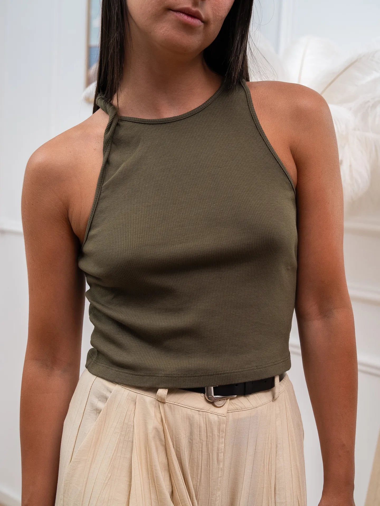 Top a costine color militare Vicolo. Modello fit regolare con scollo rotondo e dettaglio di spallina singola annodata.