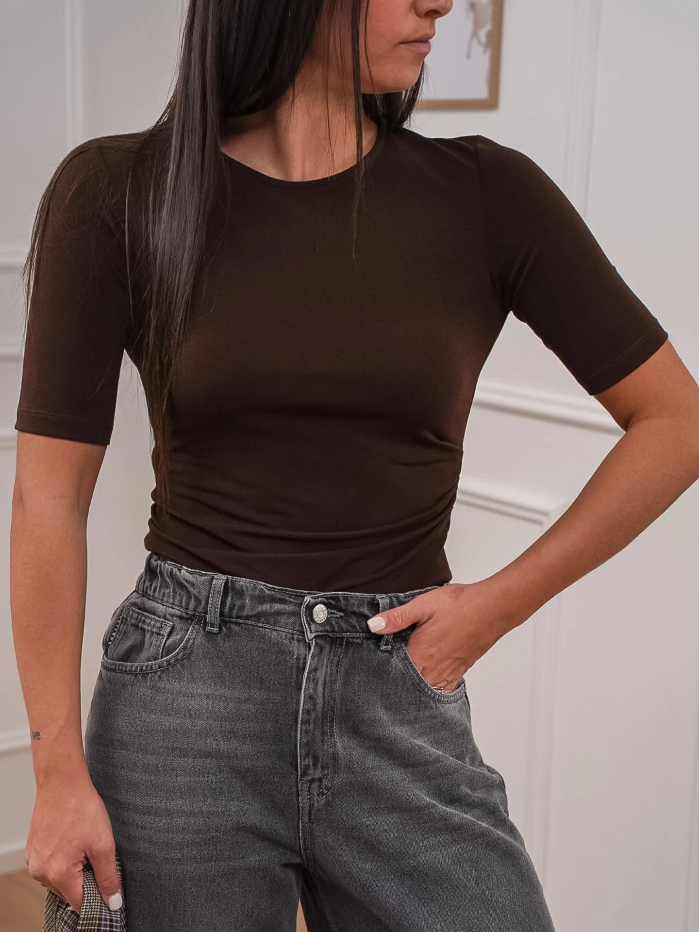 Top in jersey color cioccolato Vicolo. Modello girocollo a mezza manica, dettaglio di arricci laterali.