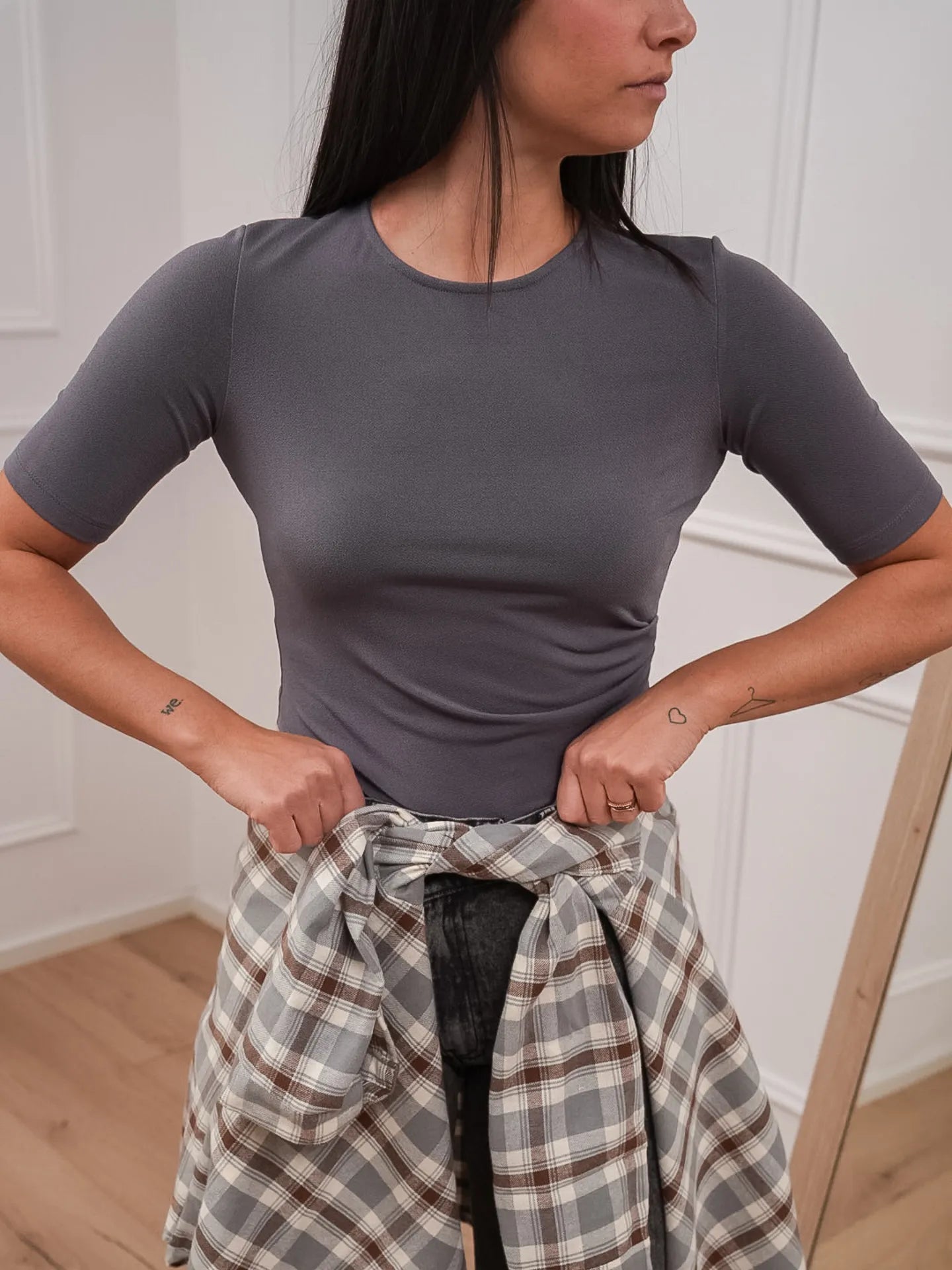 Top in jersey color piombo Vicolo. Modello girocollo a mezza manica, dettaglio di arricci laterali.