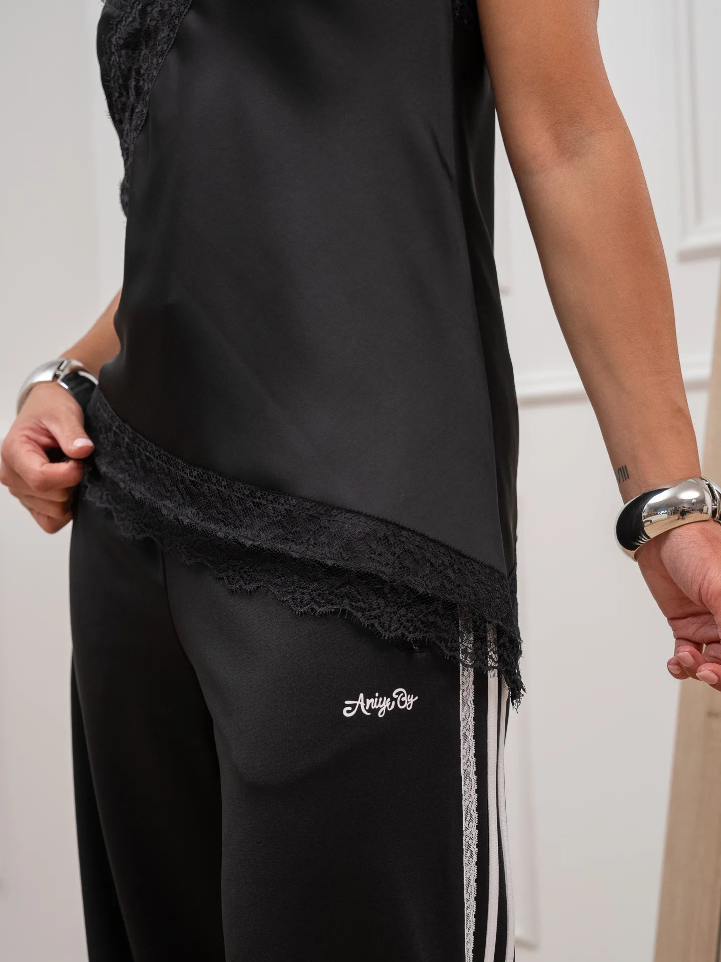 Top lingerie nero Vicolo. Modello taglio asimmetrico con scollo a v e dettaglio di pizzo nero tono su tono. Spalline sottili.