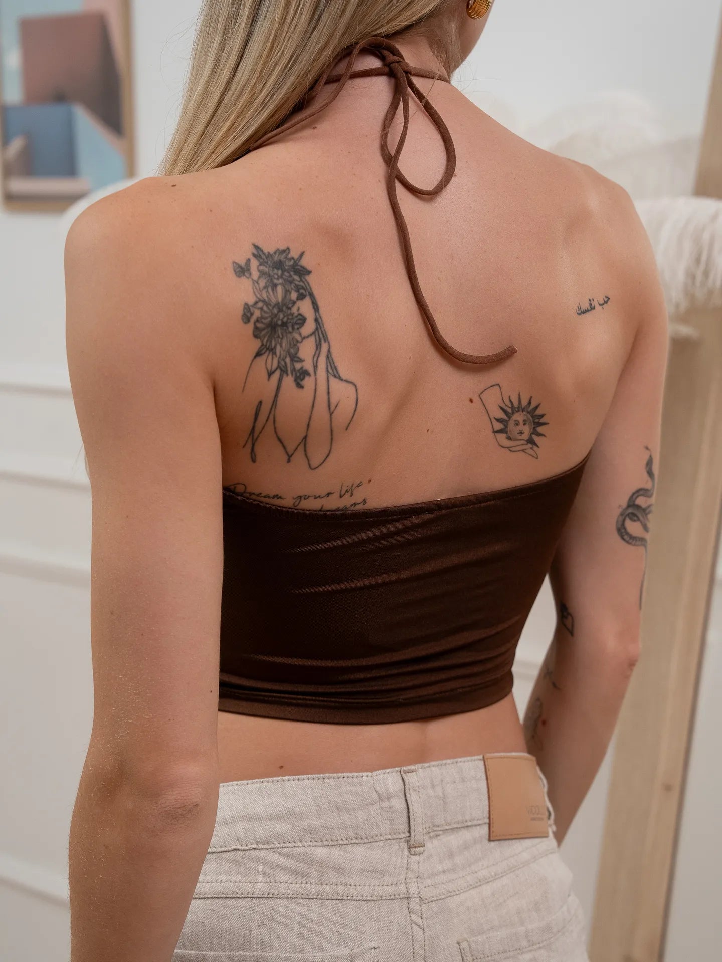 Top color moro Kontatto. Modello fit cropped con cut out frontali e dettaglio di doppia "conchiglia" dorata. Laccetti da annodare sul retro del collo. Schiena semi scoperta con banda elastica sul retro.