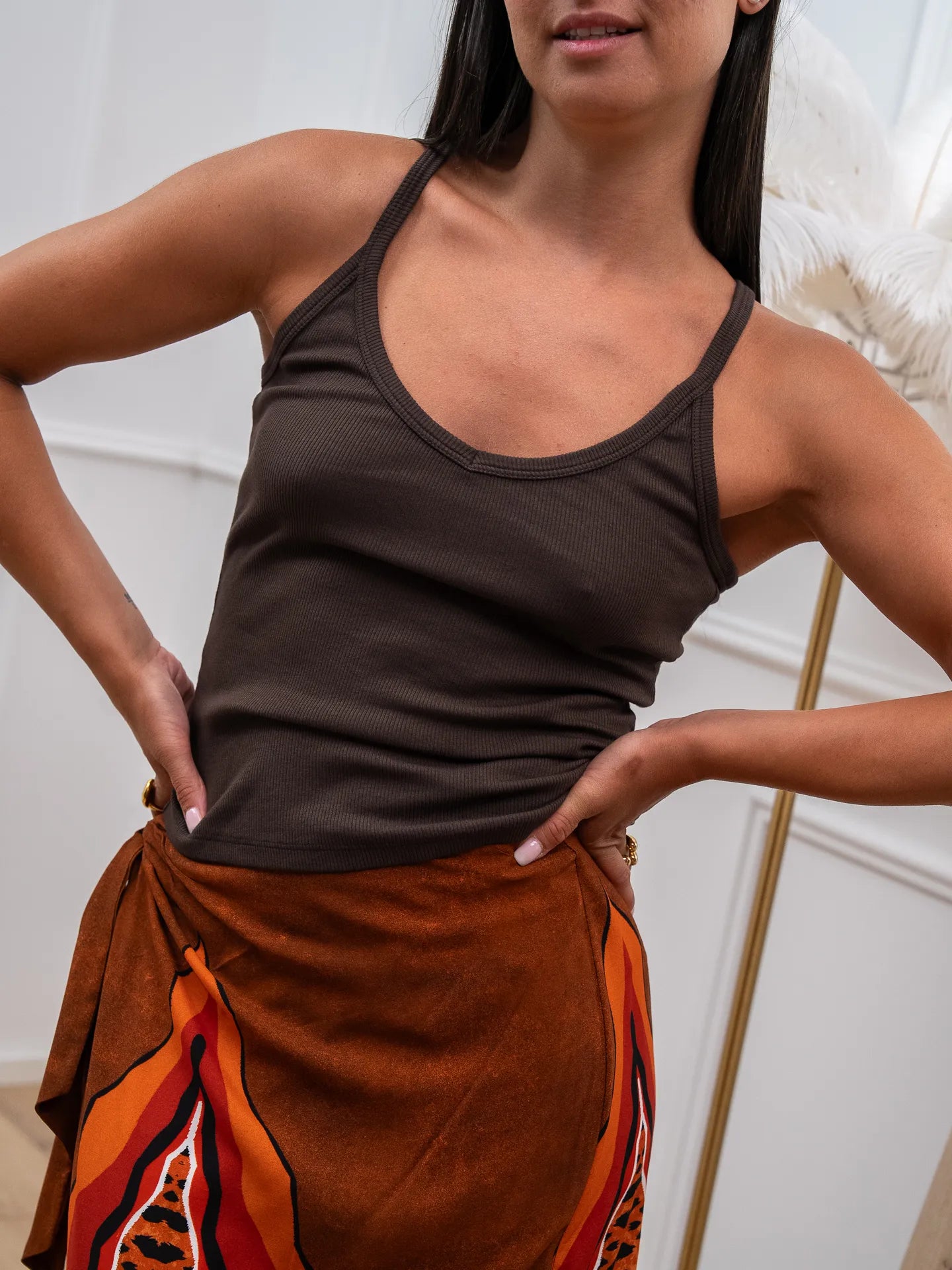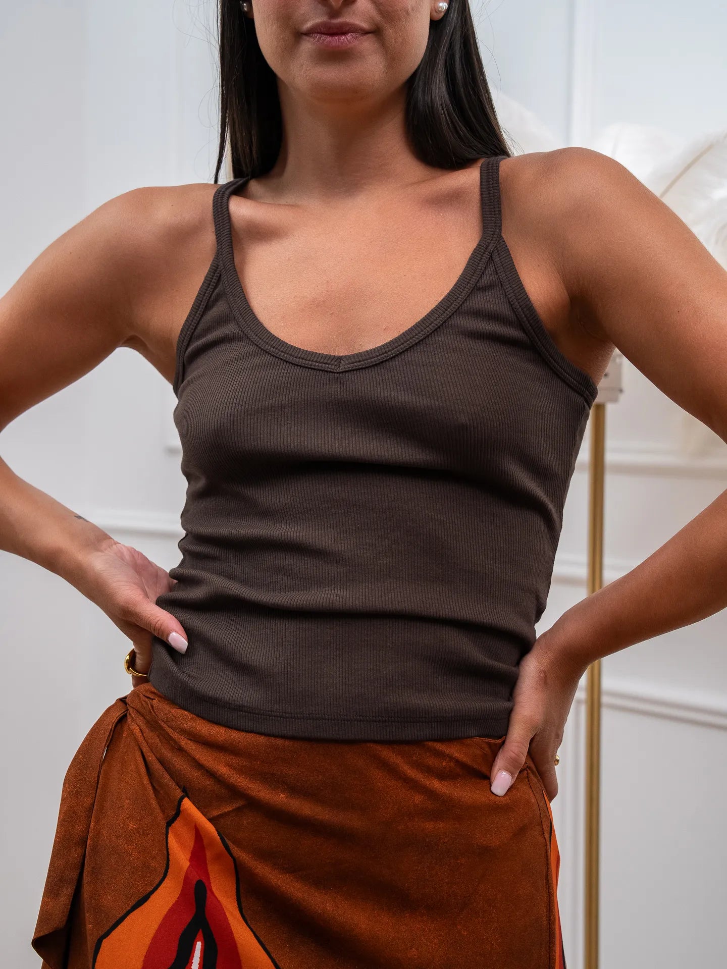 Top a costine color moro Vicolo. Modello fit regolare con scollo a v bretella sottile.